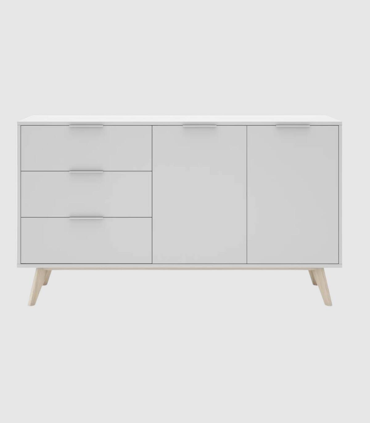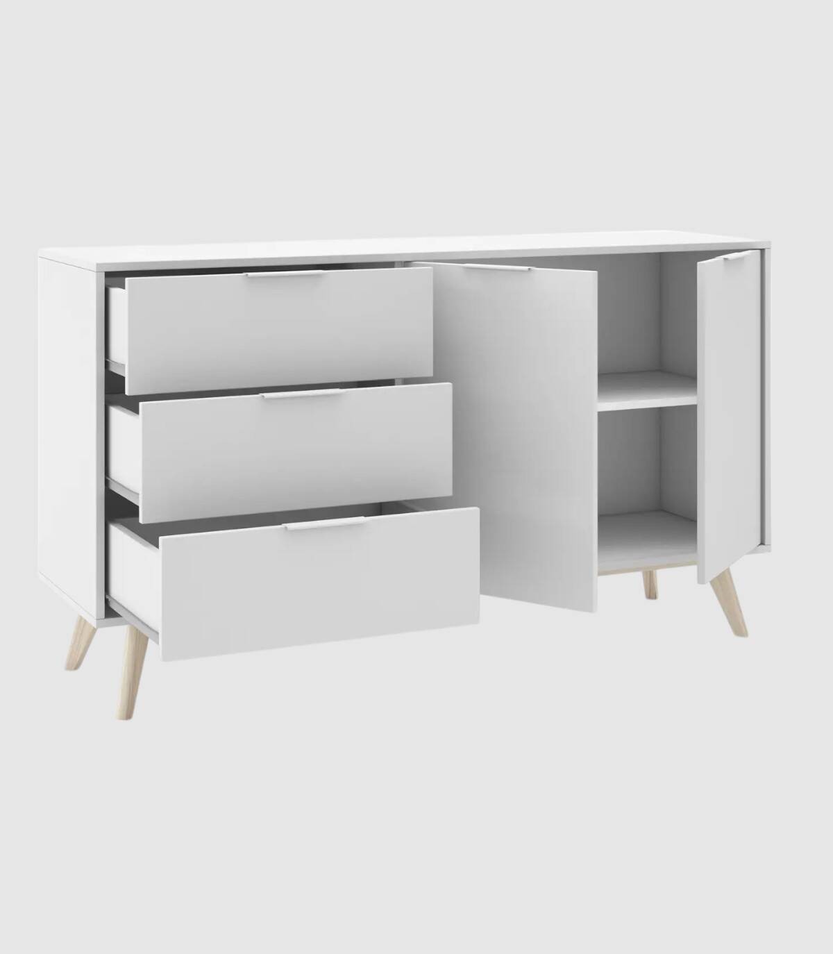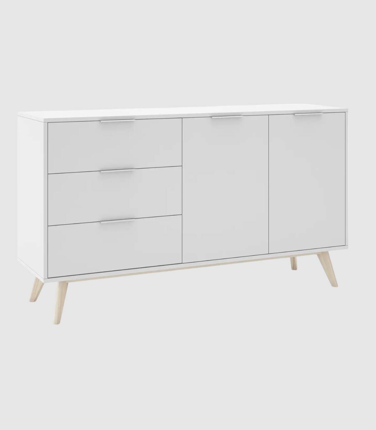 El aparador Munet se compone de dos puertas a la derecha en horizontal, tres cajones a la izquierda en vertical con tirador blanco en el extremo superior y estructura de pino pintada de color blanco sobre cuatro patas de madera de pino de color natural.