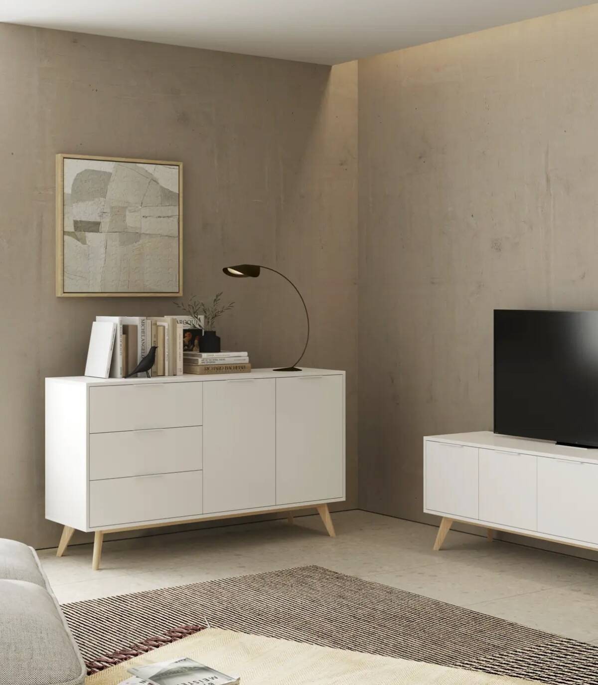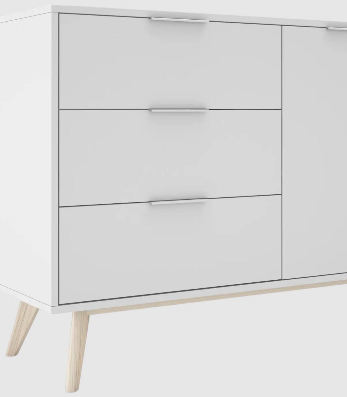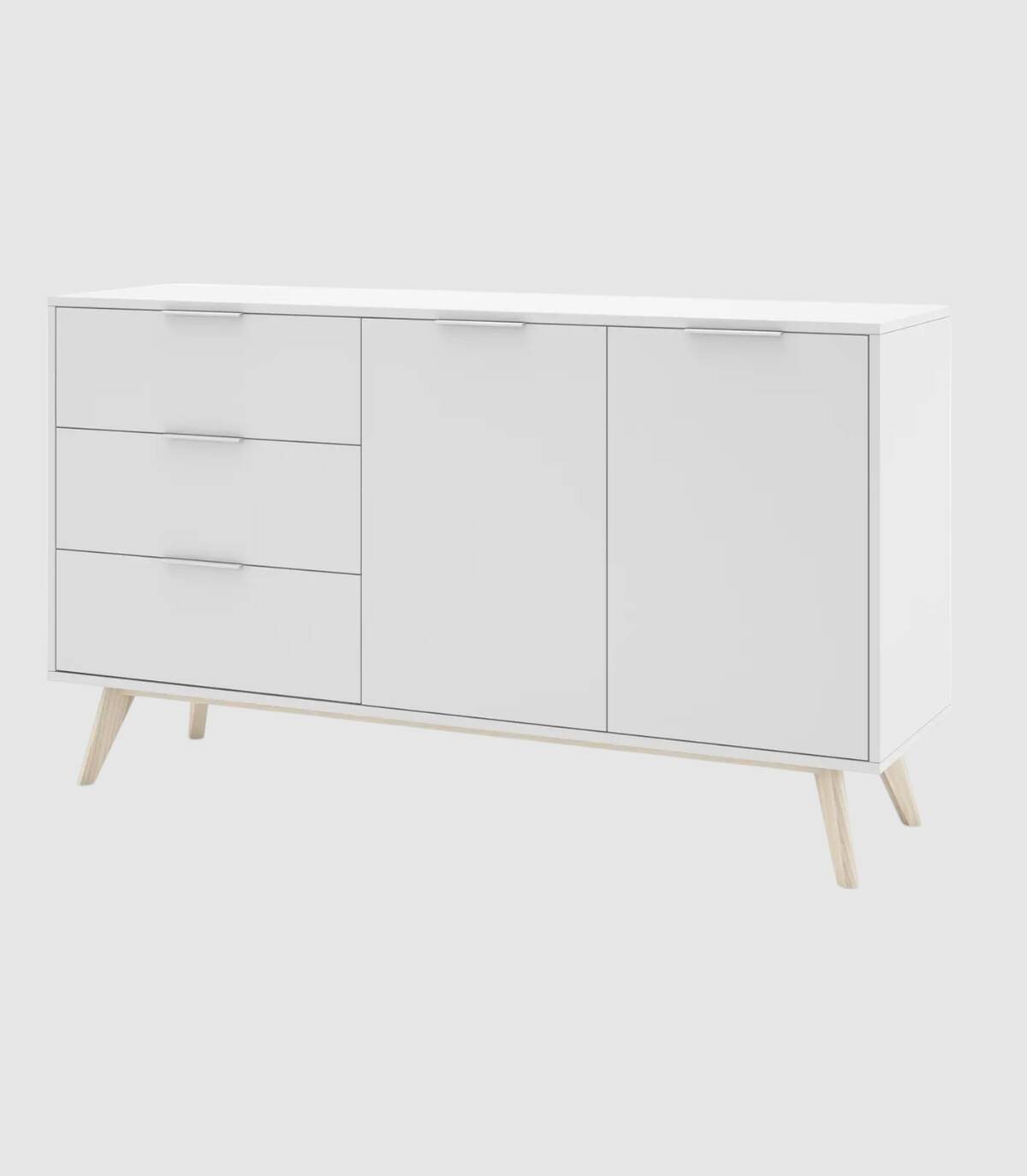 El aparador Munet se compone de dos puertas a la derecha en horizontal, tres cajones a la izquierda en vertical con tirador blanco en el extremo superior y estructura de pino pintada de color blanco sobre cuatro patas de madera de pino de color natural.