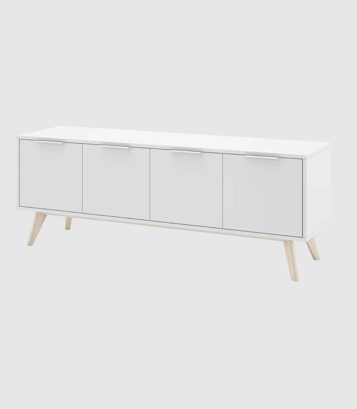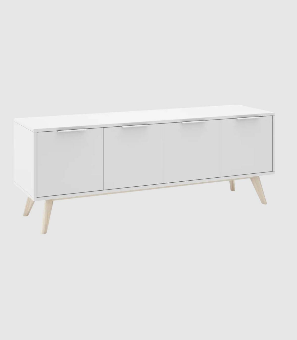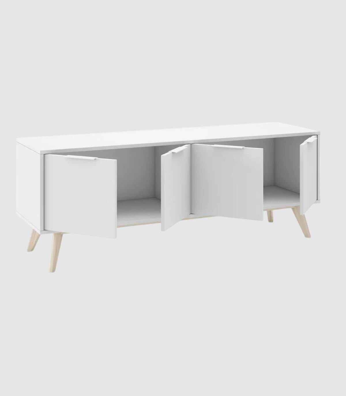 El mueble para televisores Munet se compone de cuatro puertas situadas en horizontal con tirador blanco en el extremo superior y estructura de pino pintada de color blanco sobre cuatro patas de madera de pino de color natural.