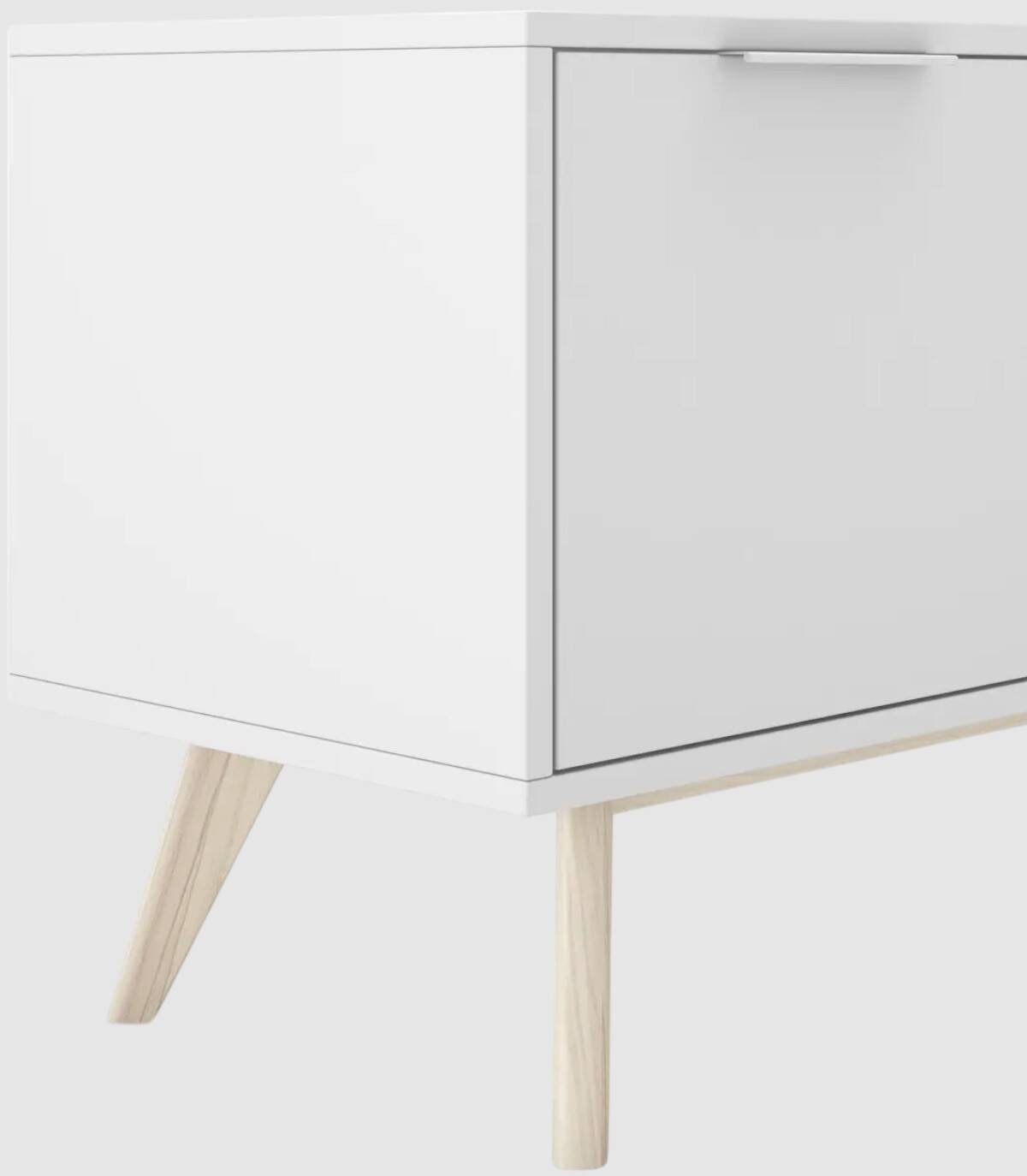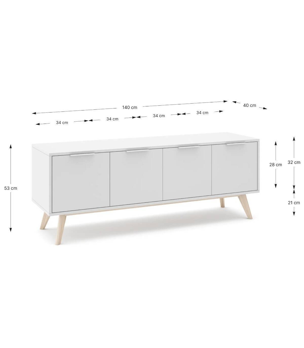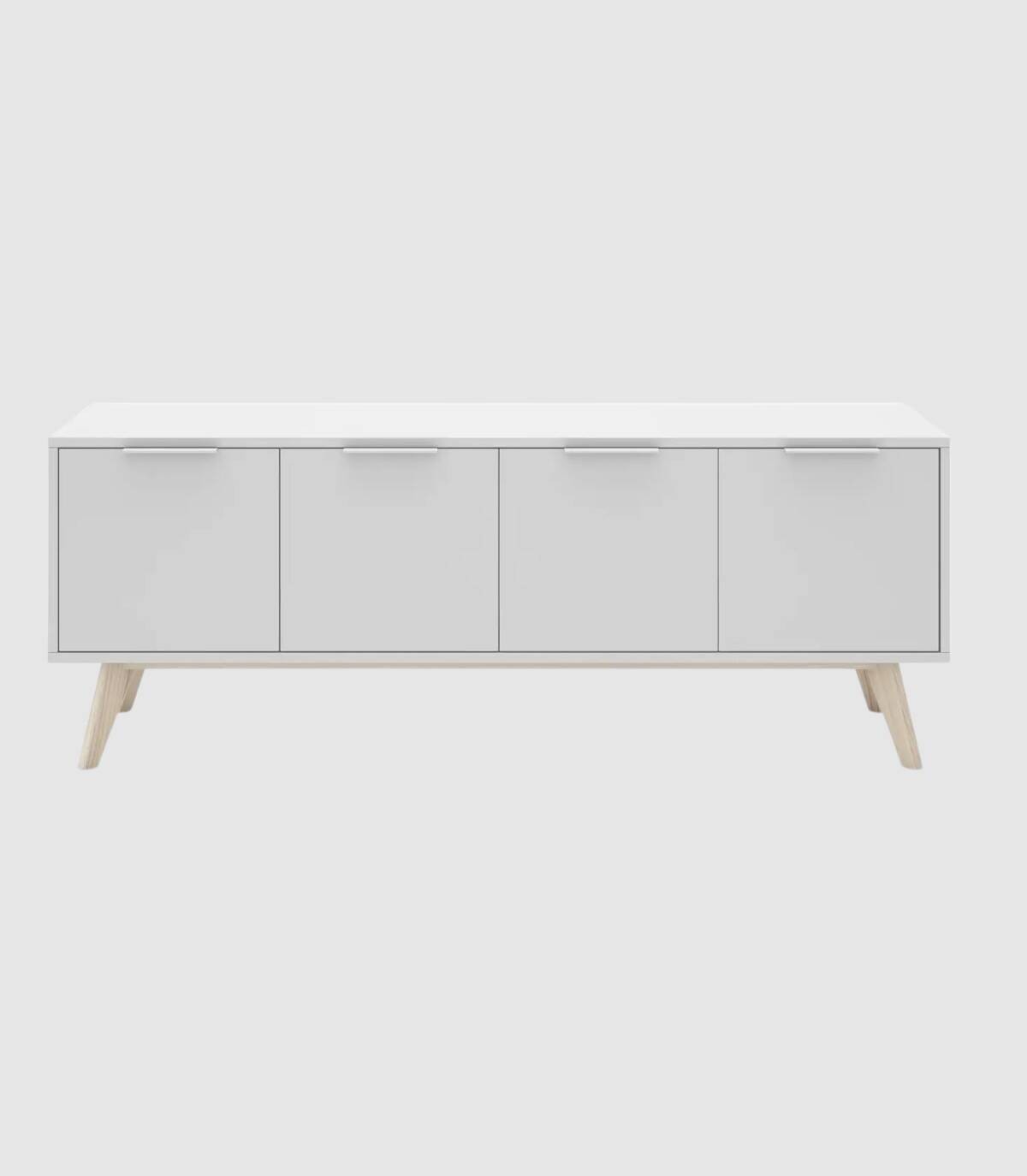 El mueble para televisores Munet se compone de cuatro puertas situadas en horizontal con tirador blanco en el extremo superior y estructura de pino pintada de color blanco sobre cuatro patas de madera de pino de color natural.