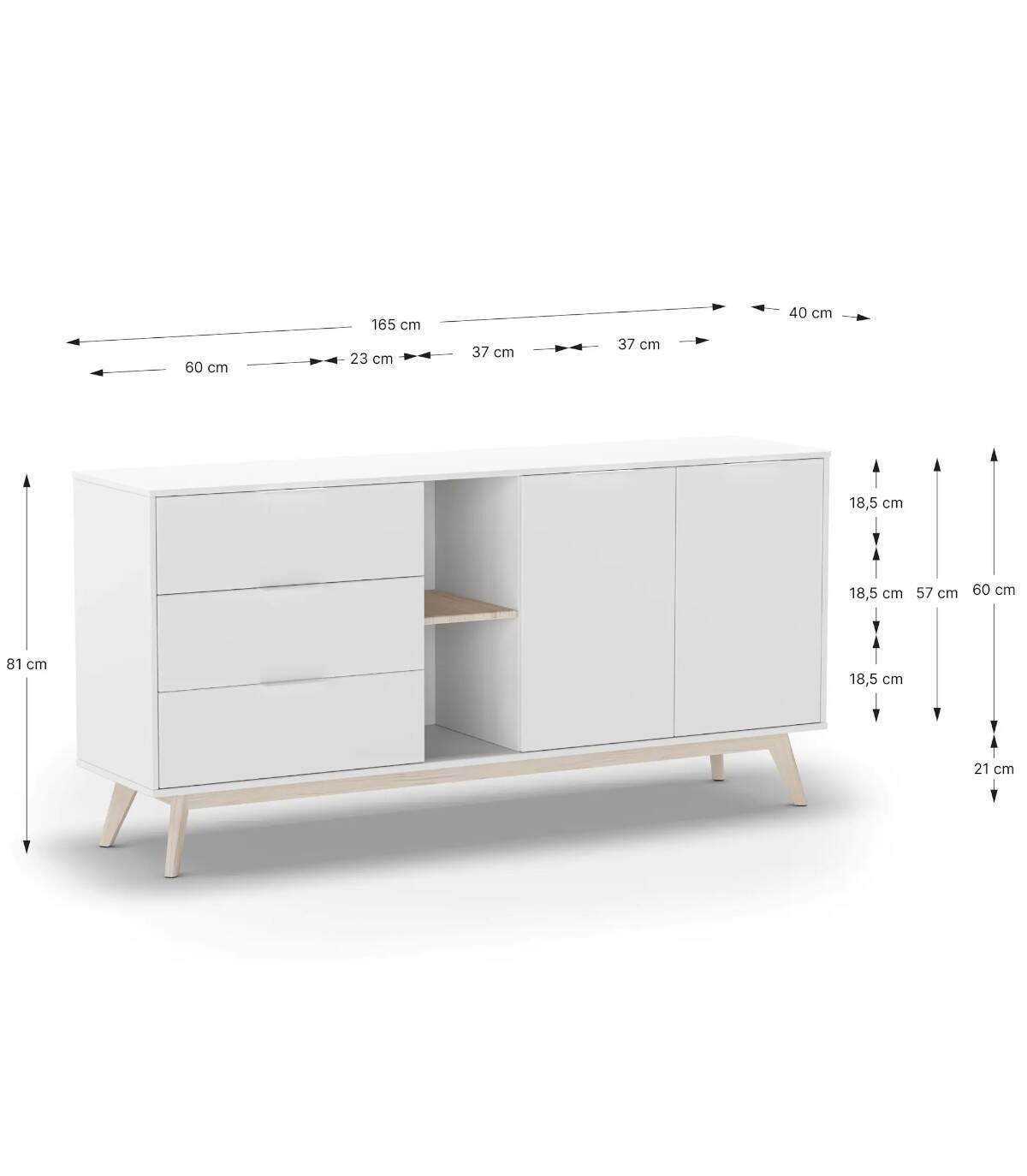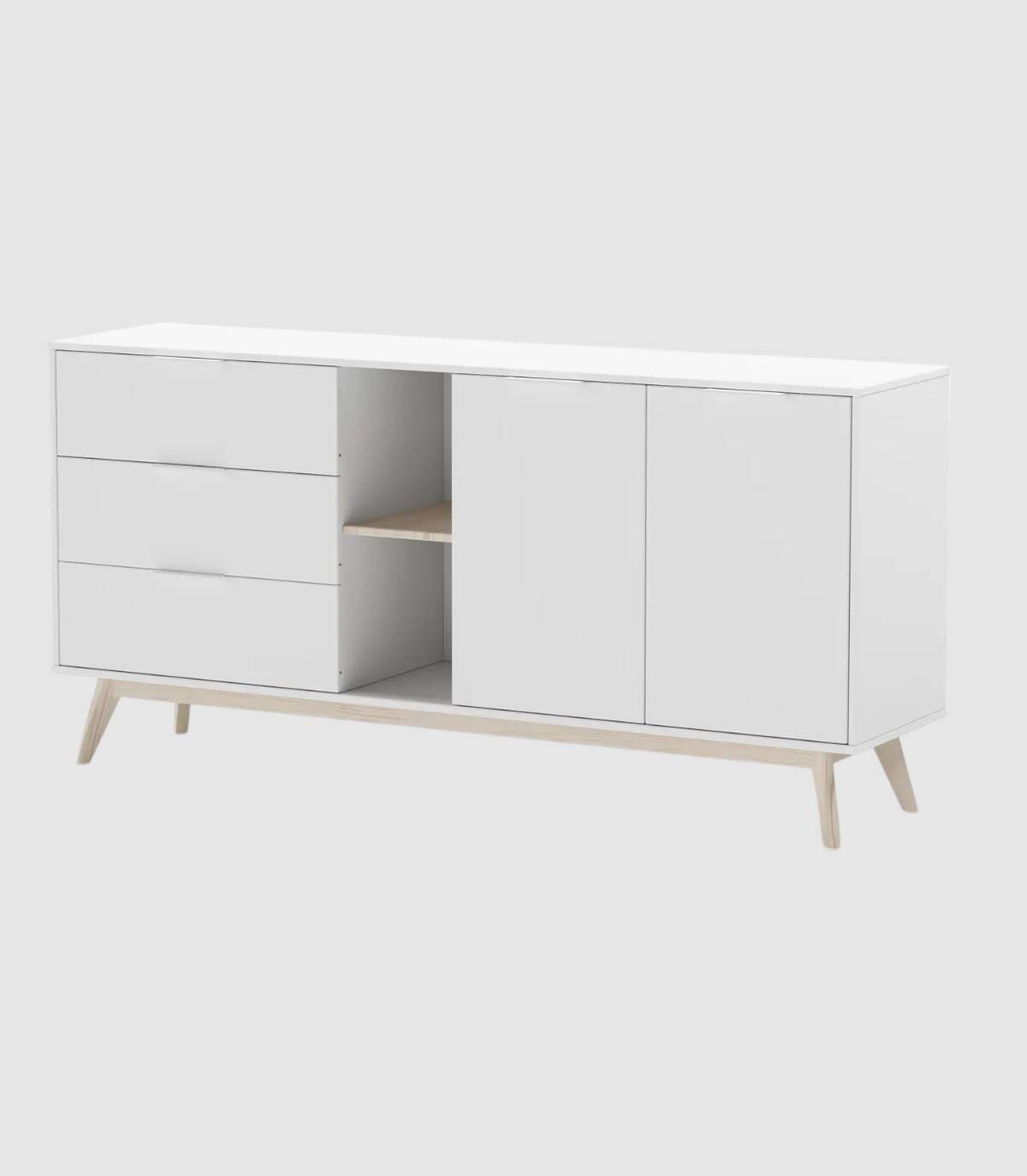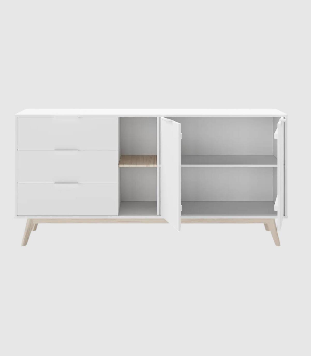 El aparador Munet se compone de dos puertas a la derecha en horizontal, tres cajones a la izquierda en vertical con tirador blanco en el extremo superior, dos huecos separados por una balda en medio y estructura de pino pintada de color blanco sobre cuatro patas de madera de pino de color natural.