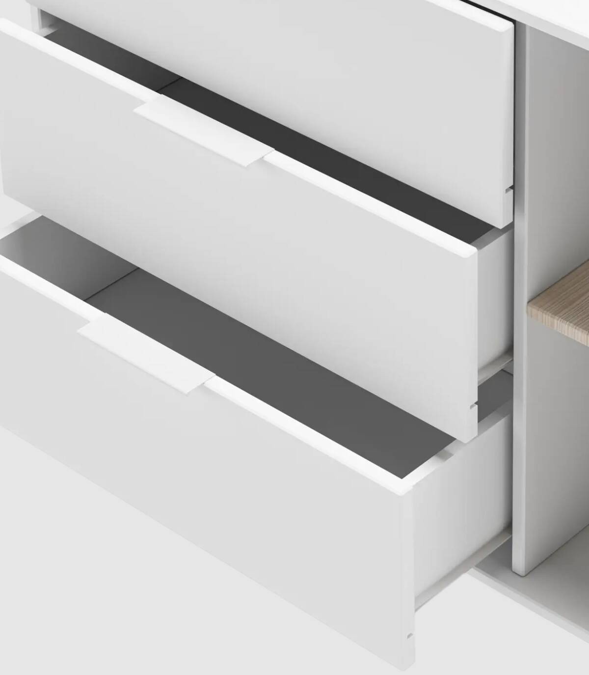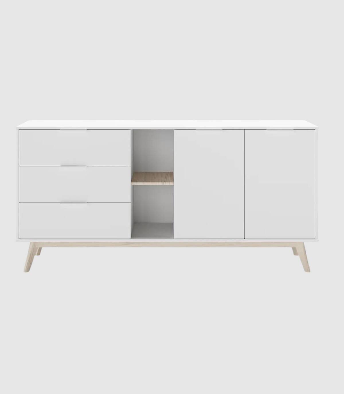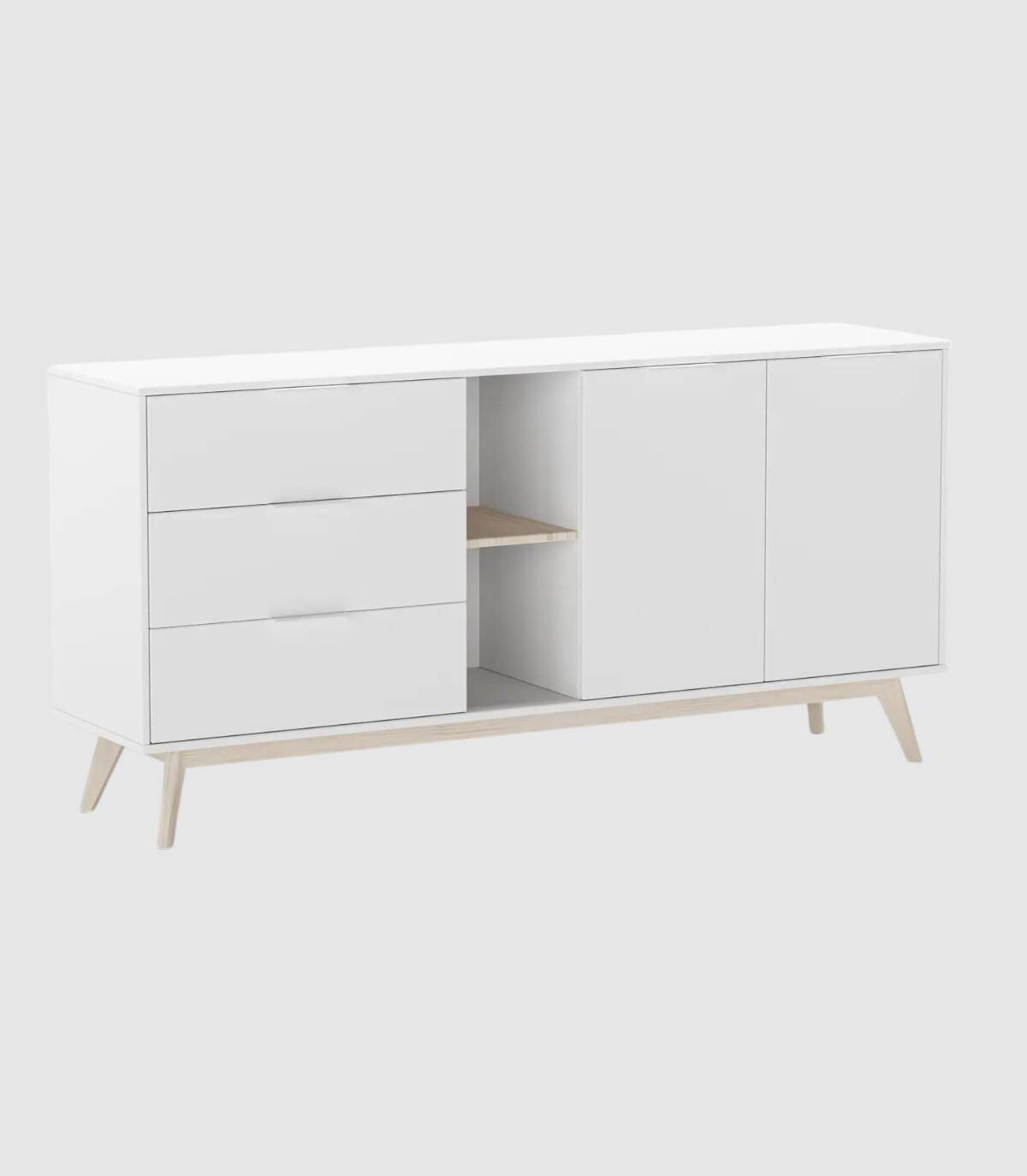 El aparador Munet se compone de dos puertas a la derecha en horizontal, tres cajones a la izquierda en vertical con tirador blanco en el extremo superior, dos huecos separados por una balda en medio y estructura de pino pintada de color blanco sobre cuatro patas de madera de pino de color natural.