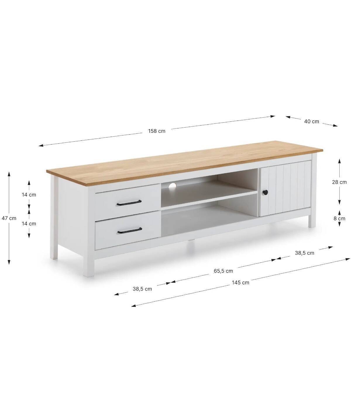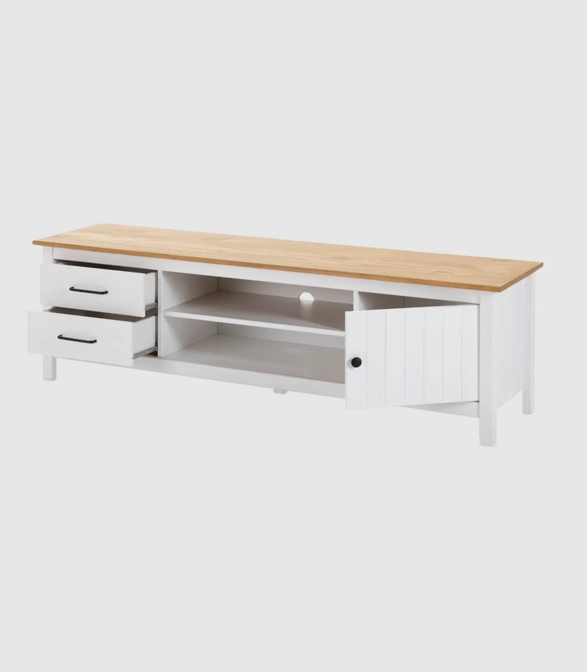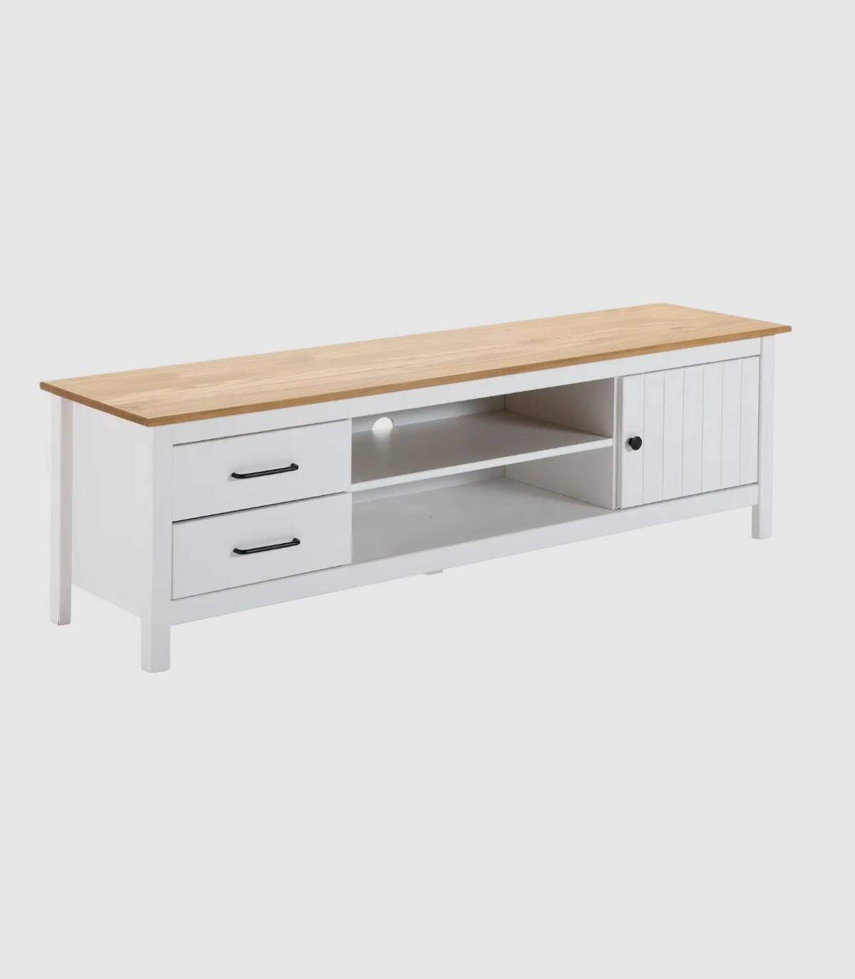 El mueble para televisores Dangal se compone de una puerta a la derecha con pomo y frontal con lineas verticales, dos cajones a la izquierda en vertical con tirador negro, dos huecos separados por una balda en el centro con hueco para cables en la trasera y tablero de color madera con estructura de madera de pino pintada de color blanco sobre cinco patas.