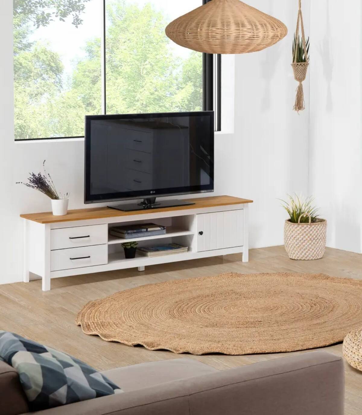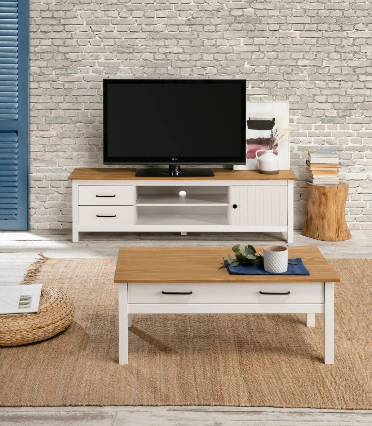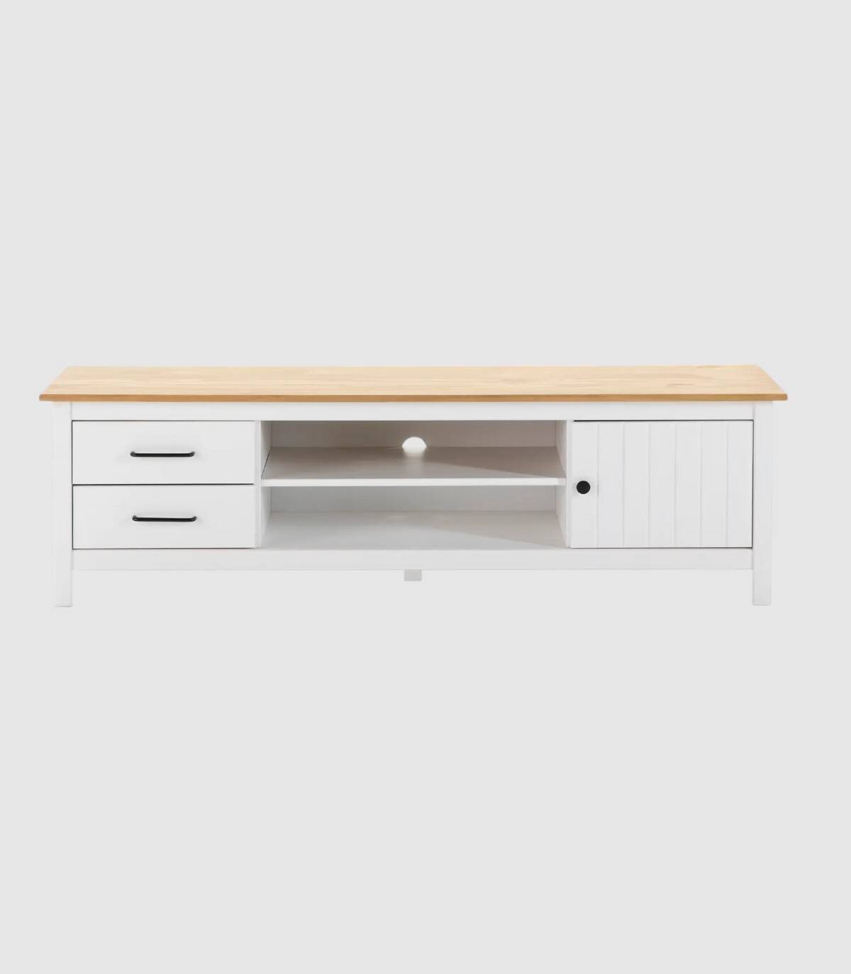 El mueble para televisores Dangal se compone de una puerta a la derecha con pomo y frontal con lineas verticales, dos cajones a la izquierda en vertical con tirador negro, dos huecos separados por una balda en el centro con hueco para cables en la trasera y tablero de color madera con estructura de madera de pino pintada de color blanco sobre cinco patas.