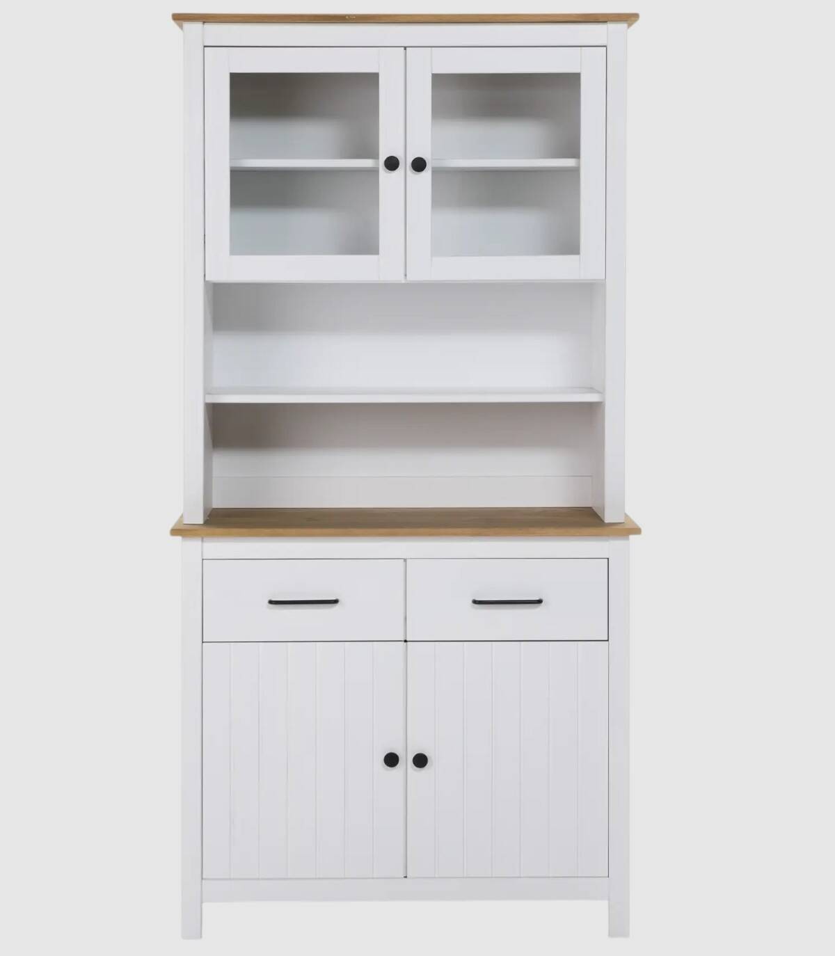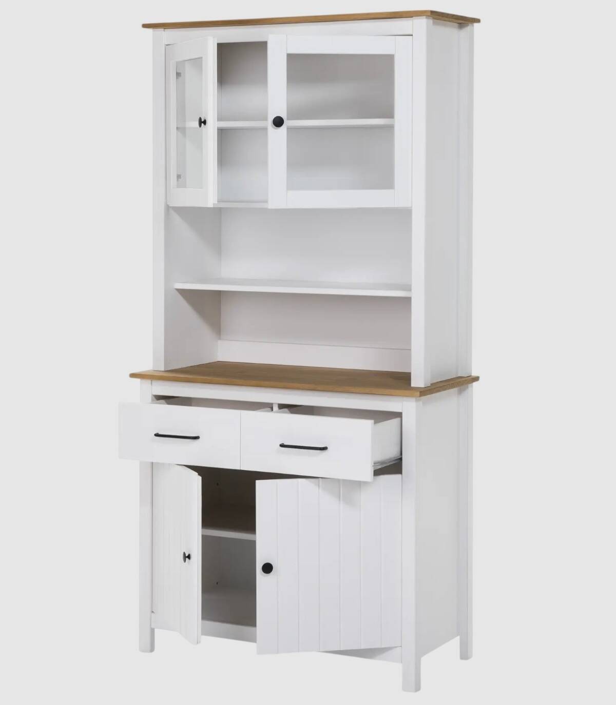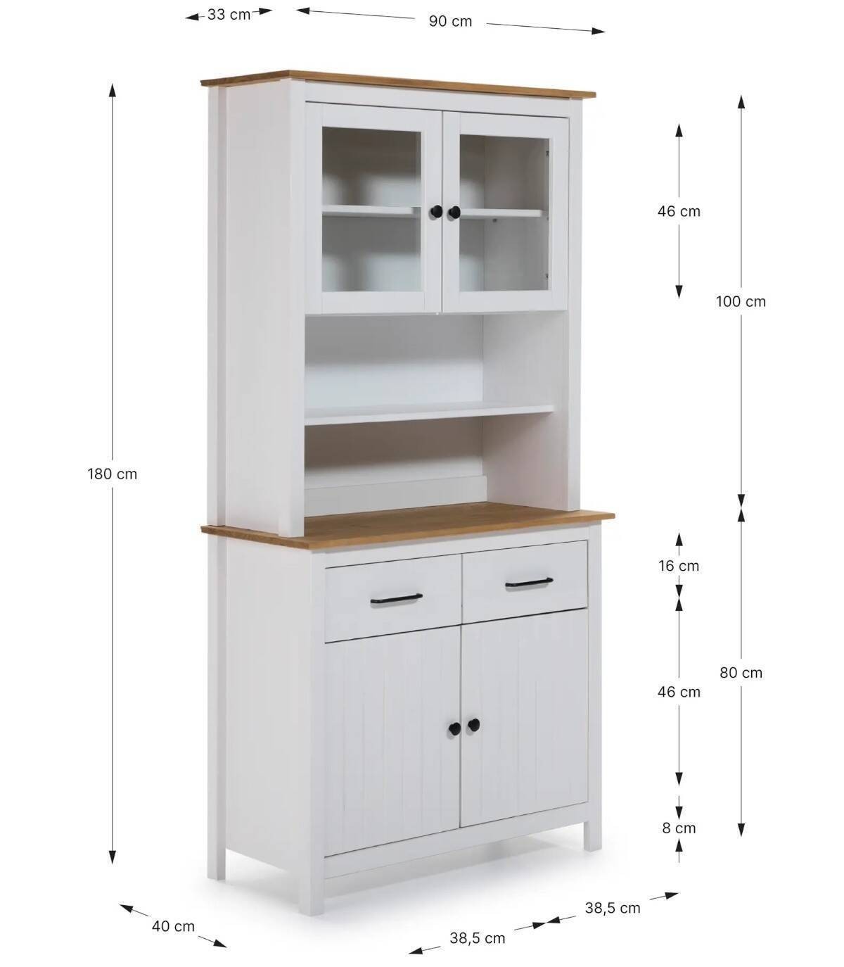 La Vitrina Dangal se compone de cuatro puertas con pomo y balda en su interior, dos arriba con cristal y dos abajo con frontal de lineas verticales, dos cajones en medio en horizontal con tirador, dos huecos separados por una balda en el centro, tablero de color madera arriba y en medio con estructura de madera de pino pintada de color blanco sobre cuatro patas.