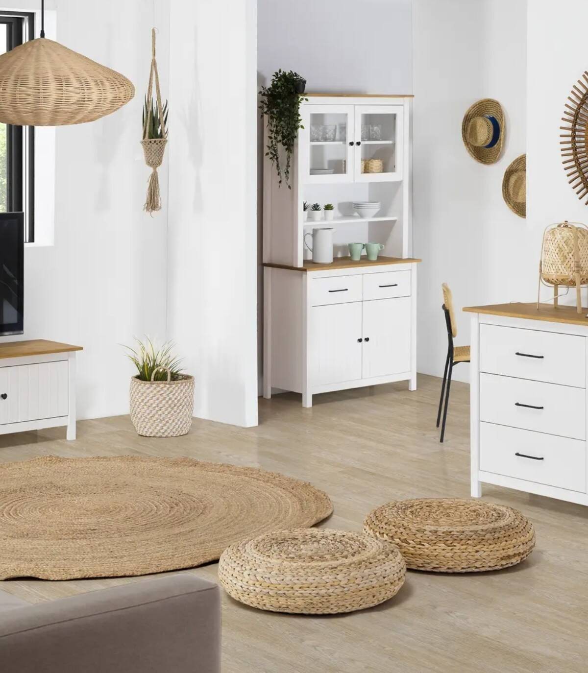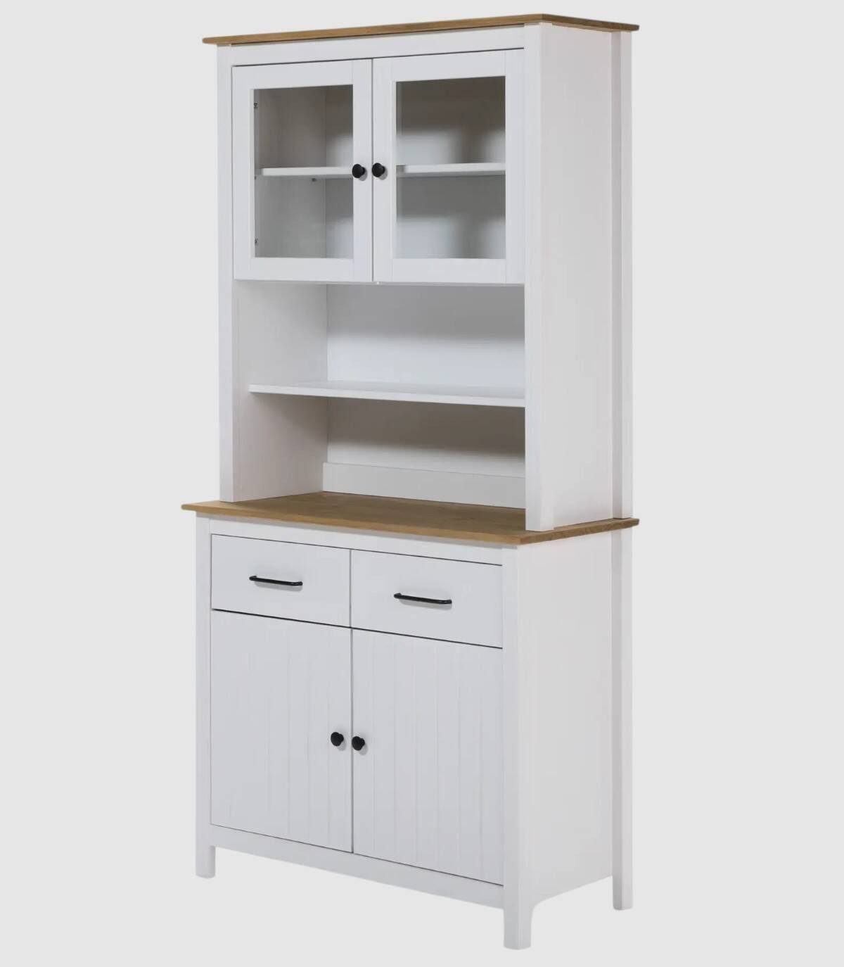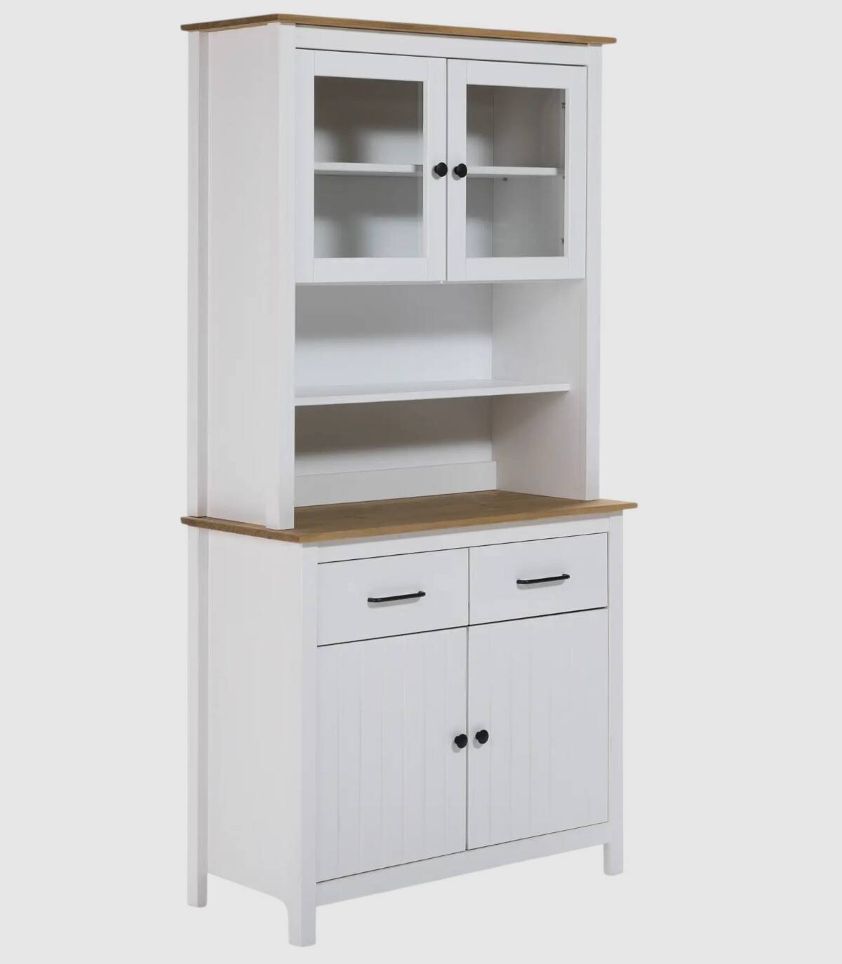La Vitrina Dangal se compone de cuatro puertas con pomo y balda en su interior, dos arriba con cristal y dos abajo con frontal de lineas verticales, dos cajones en medio en horizontal con tirador, dos huecos separados por una balda en el centro, tablero de color madera arriba y en medio con estructura de madera de pino pintada de color blanco sobre cuatro patas.