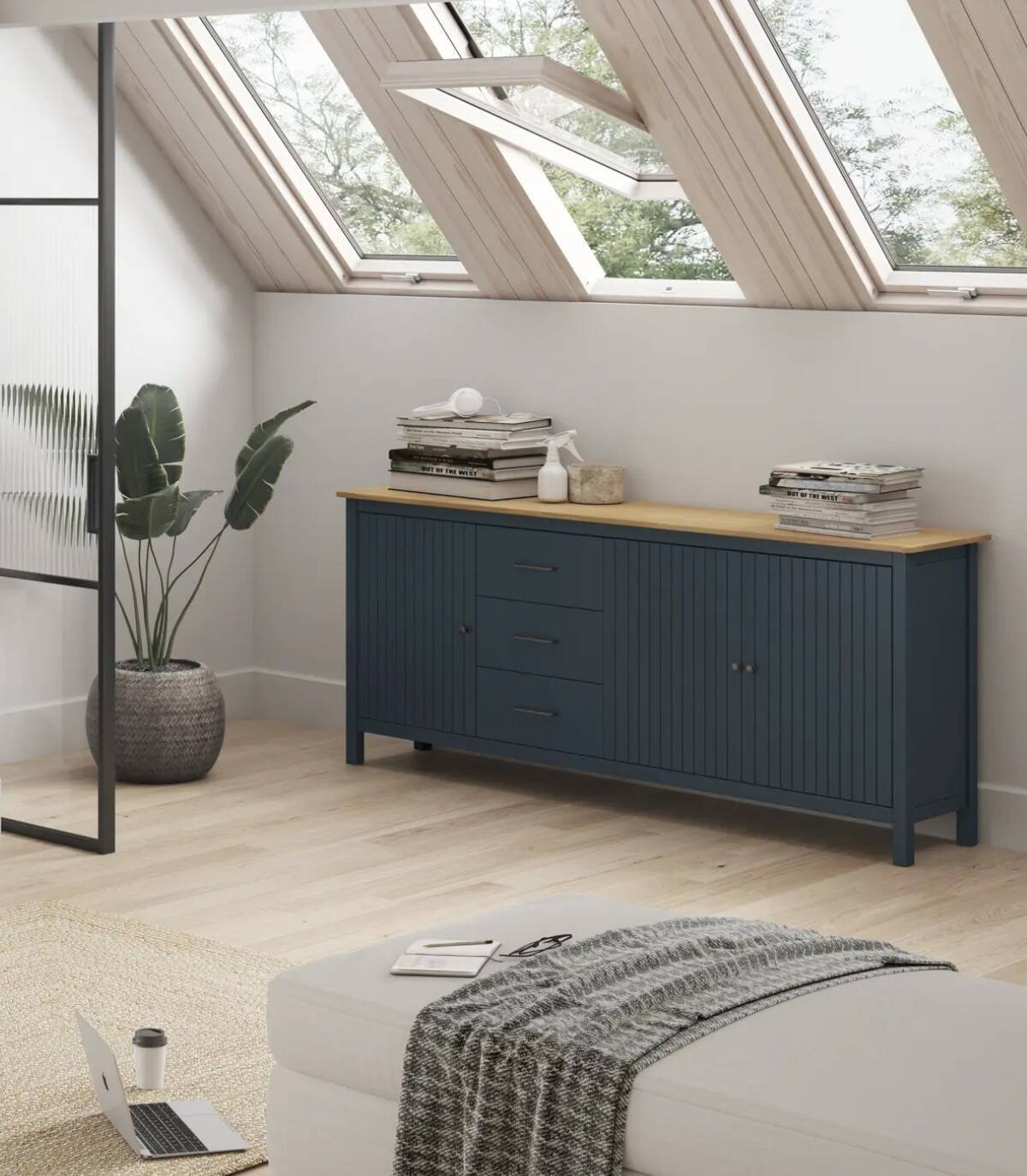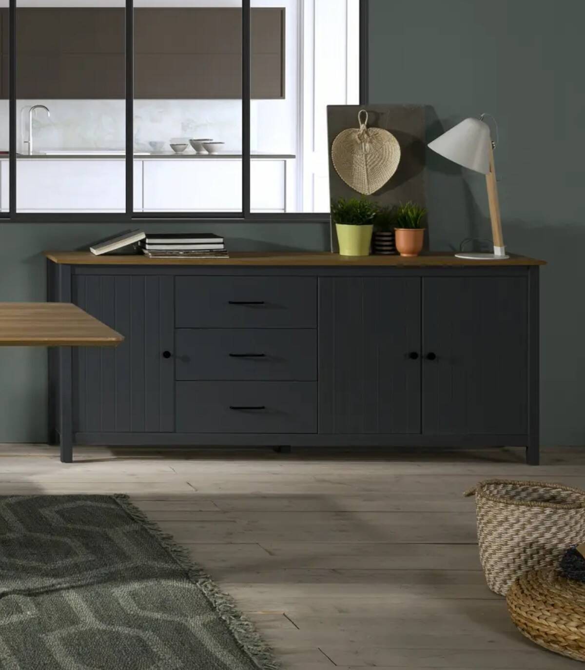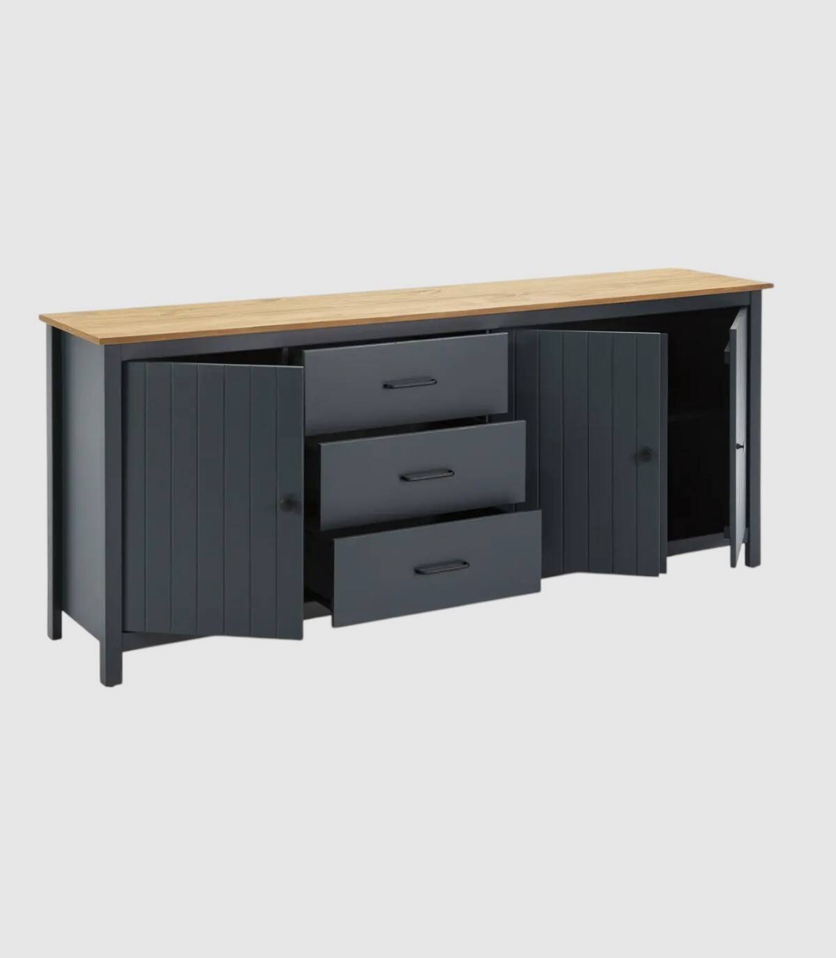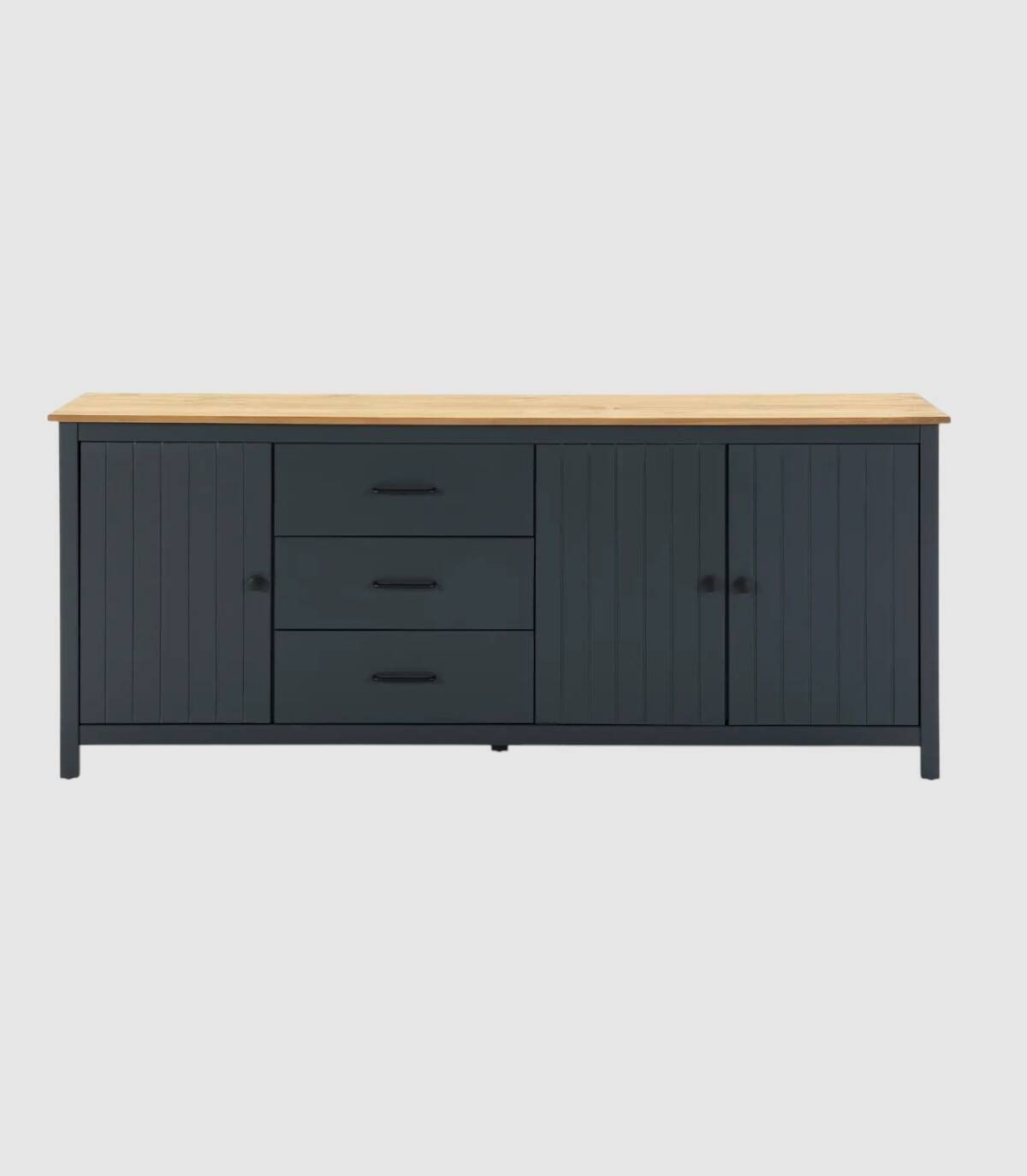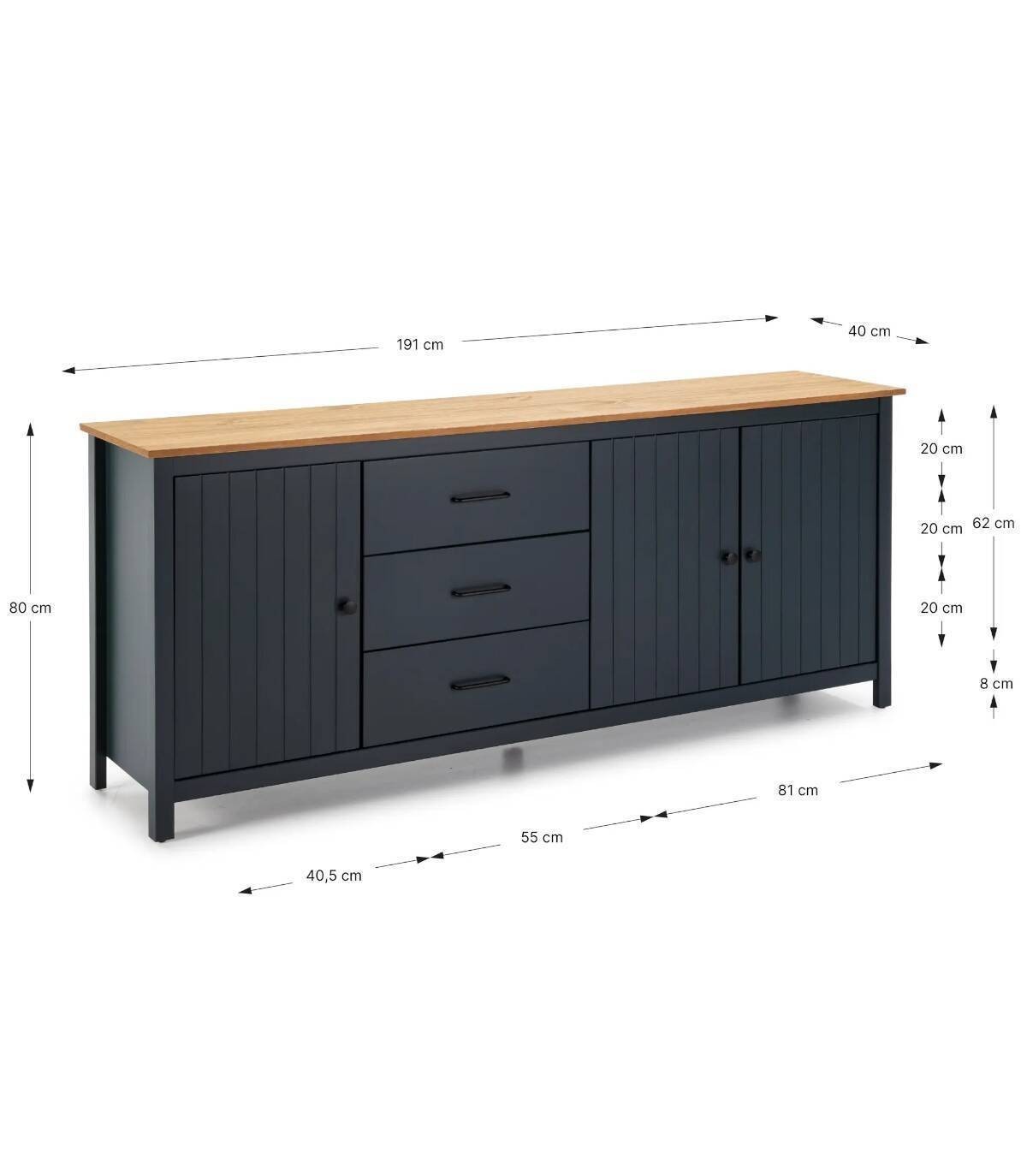 El aparador Dangal se compone de tres puertas con pomo, con frontal de lineas verticales y balda en su interior, dos a la derecha y una a la izquierda, tres cajones en medio en vertical con tirador y tablero de color madera con estructura de madera de pino pintada de color azul sobre cinco patas.