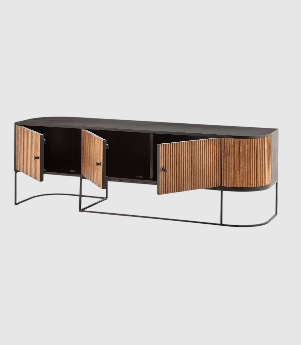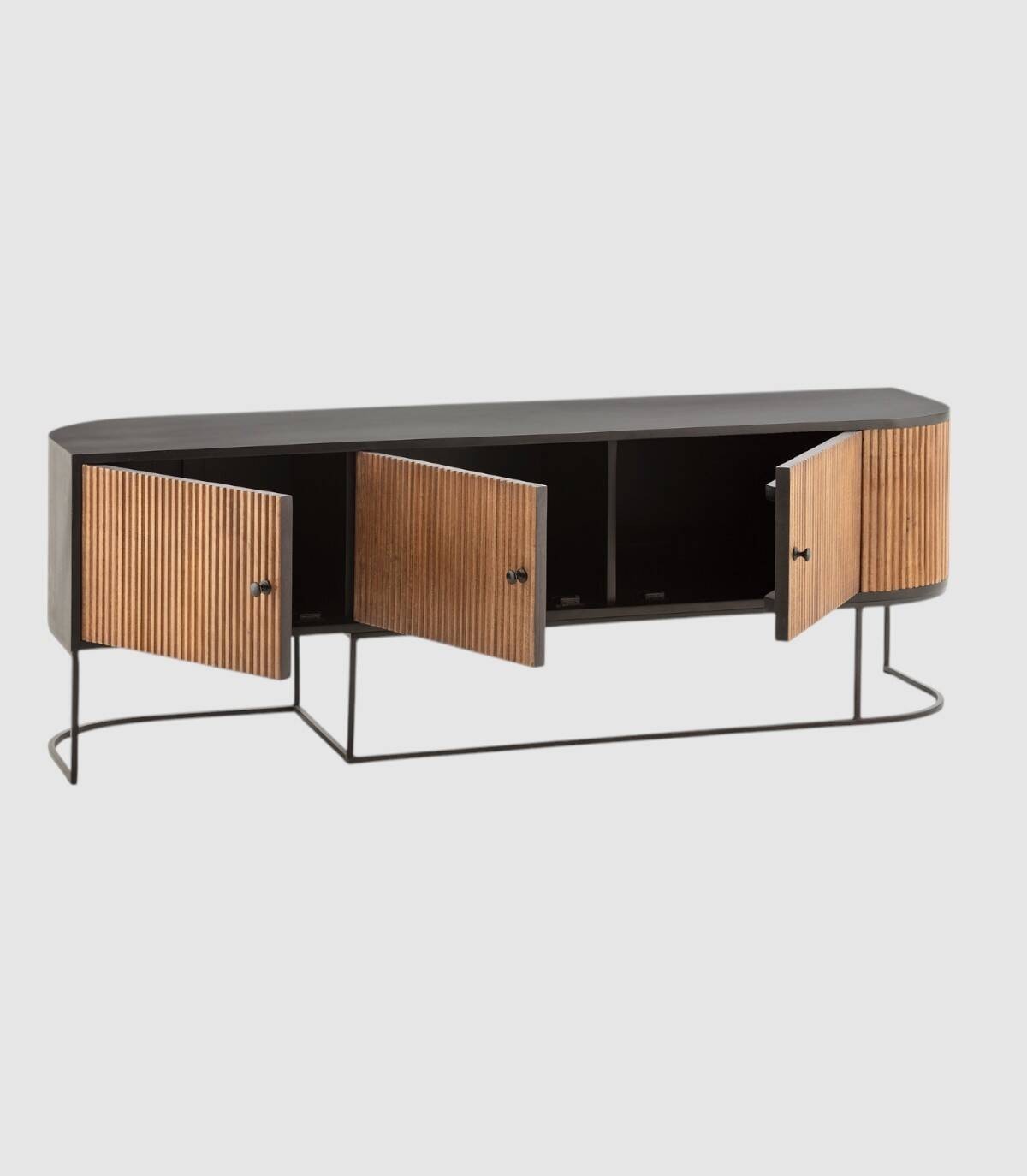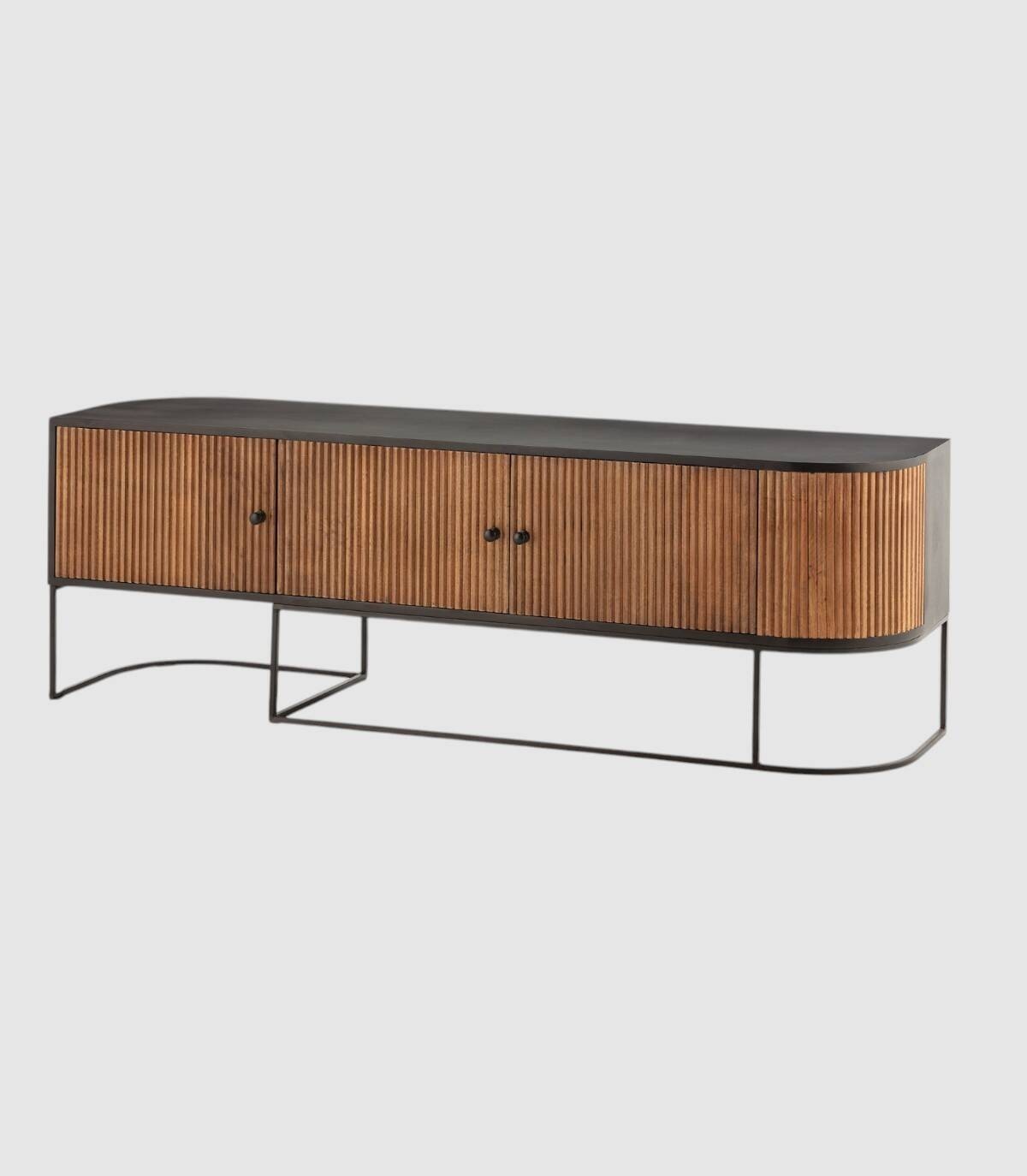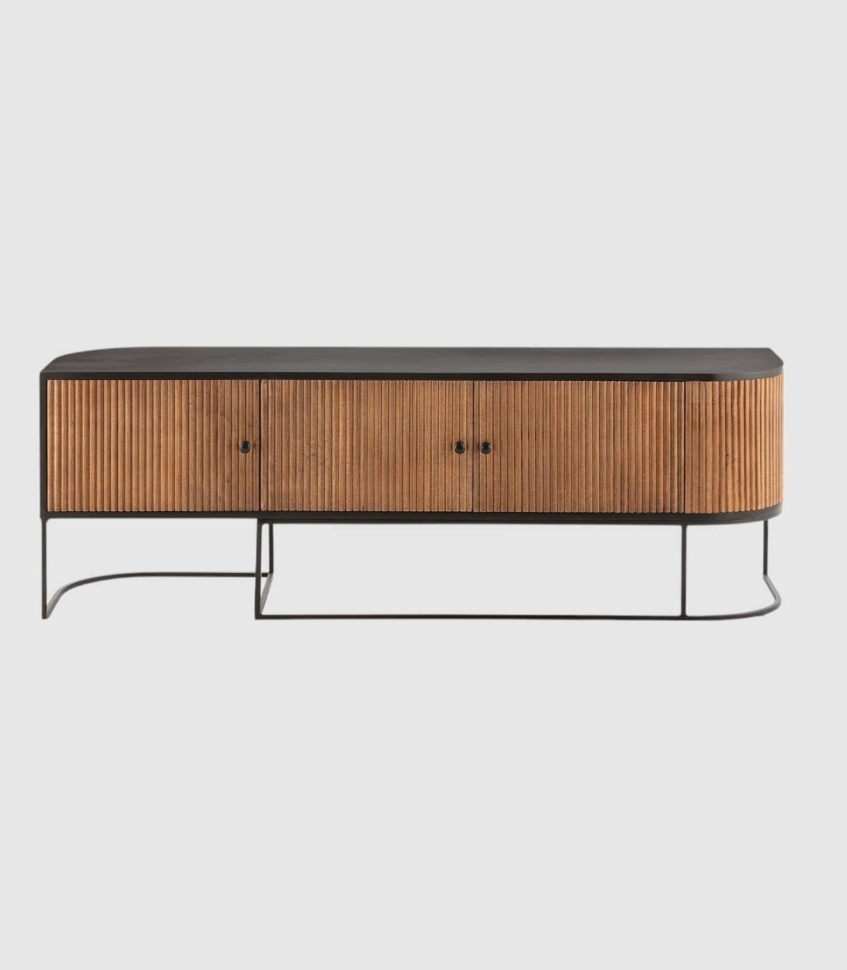 El mueble para televisores Gladstone se compone de tres puertas con tiradores, frontal con lineas verticales en relieve de madera de mango de color natural, con la esquina derecha de forma redondeada, estructura de madera de mango barnizada de color negro y patas de metal de color negro con forma de varillas curvadas.