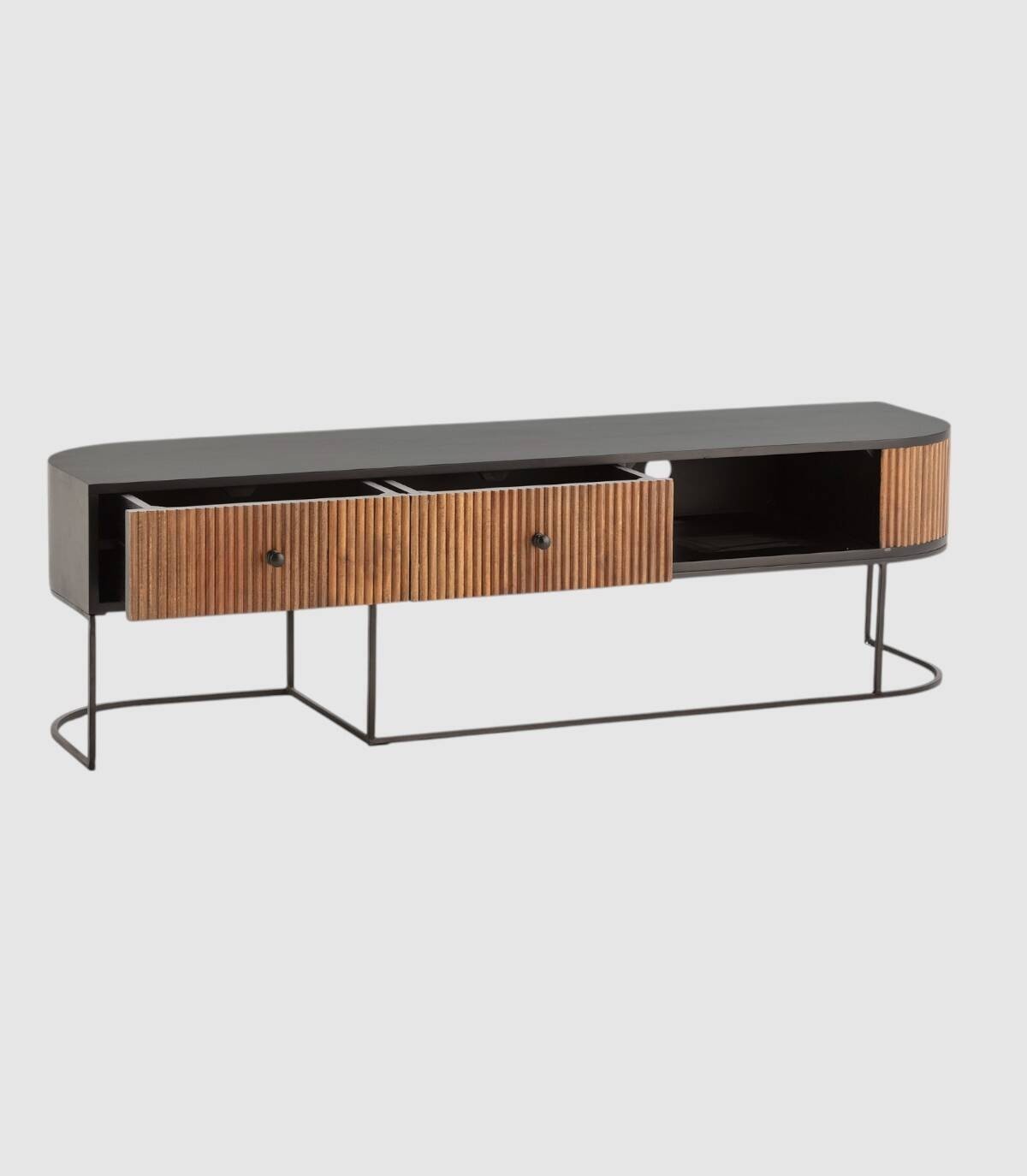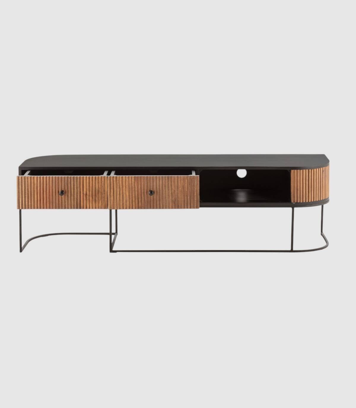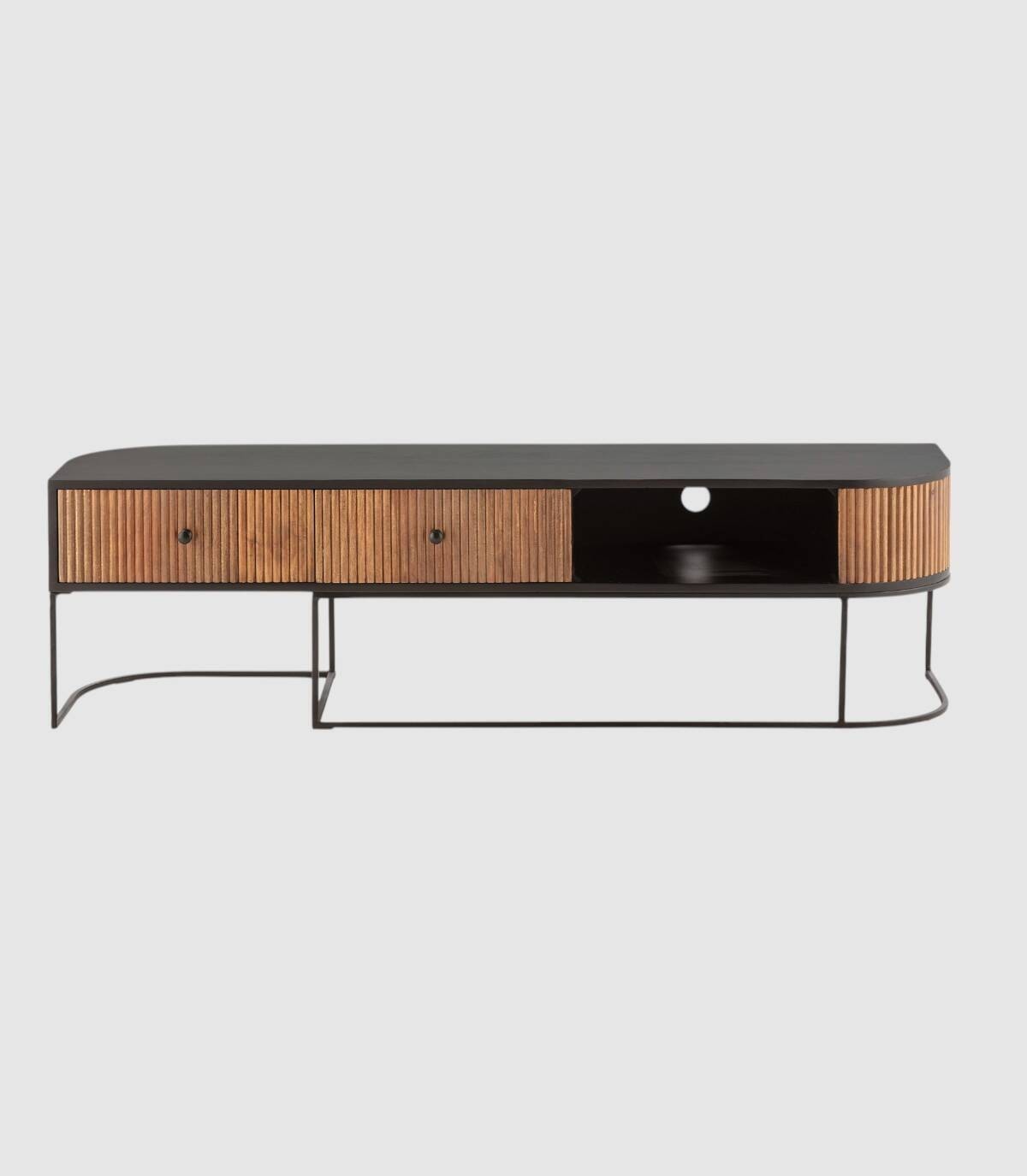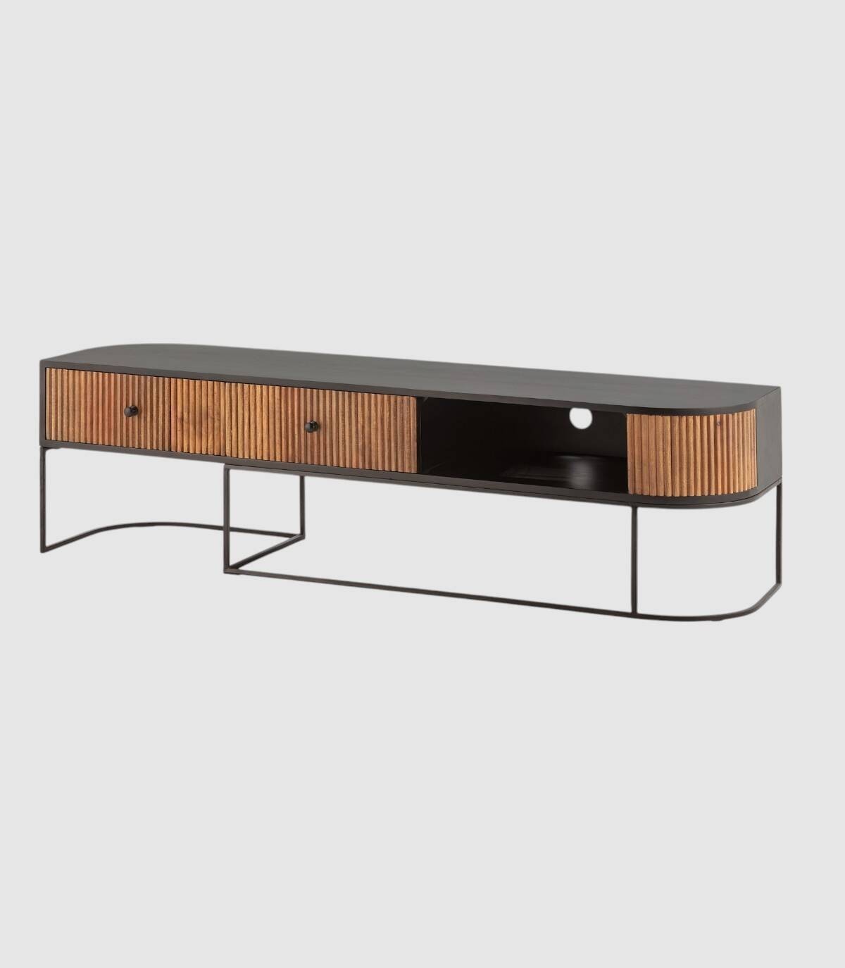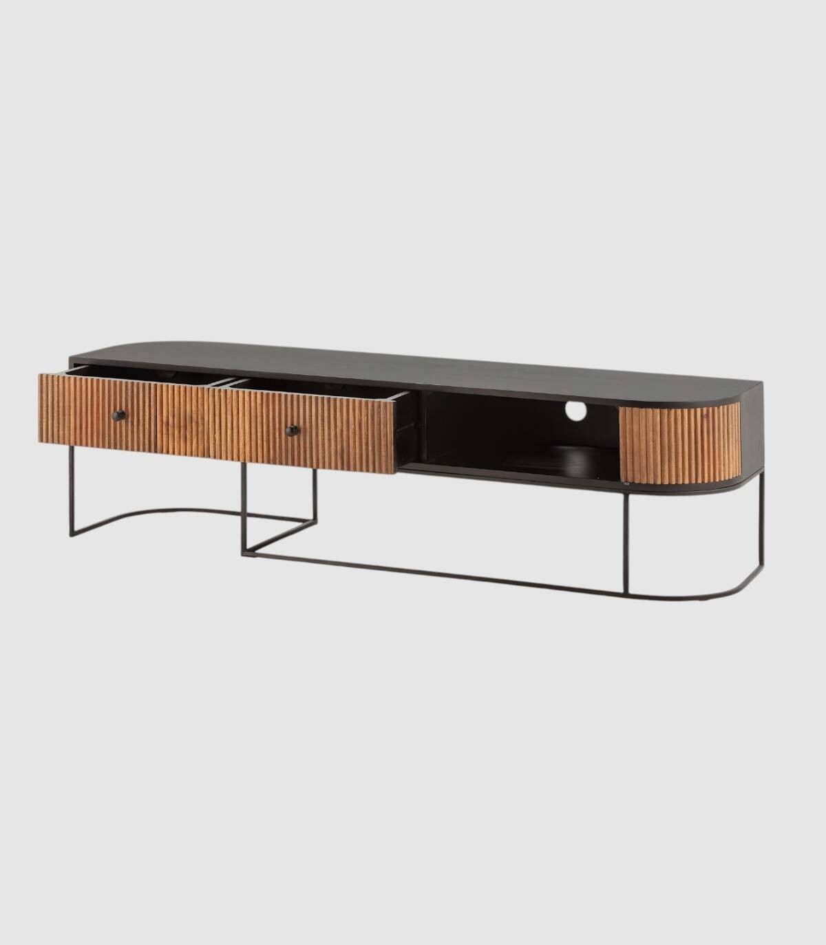 El mueble para televisores Gladstone se compone de dos cajones con tiradores, a la izquierda, frontal con lineas verticales en relieve de madera de mango de color natural, con la esquina derecha de forma redondeada, estructura de madera de mango barnizada de color negro, un hueco a la derecha con agujero en la parte trasera para los cables y patas de metal de color negro con forma de varillas curvadas.