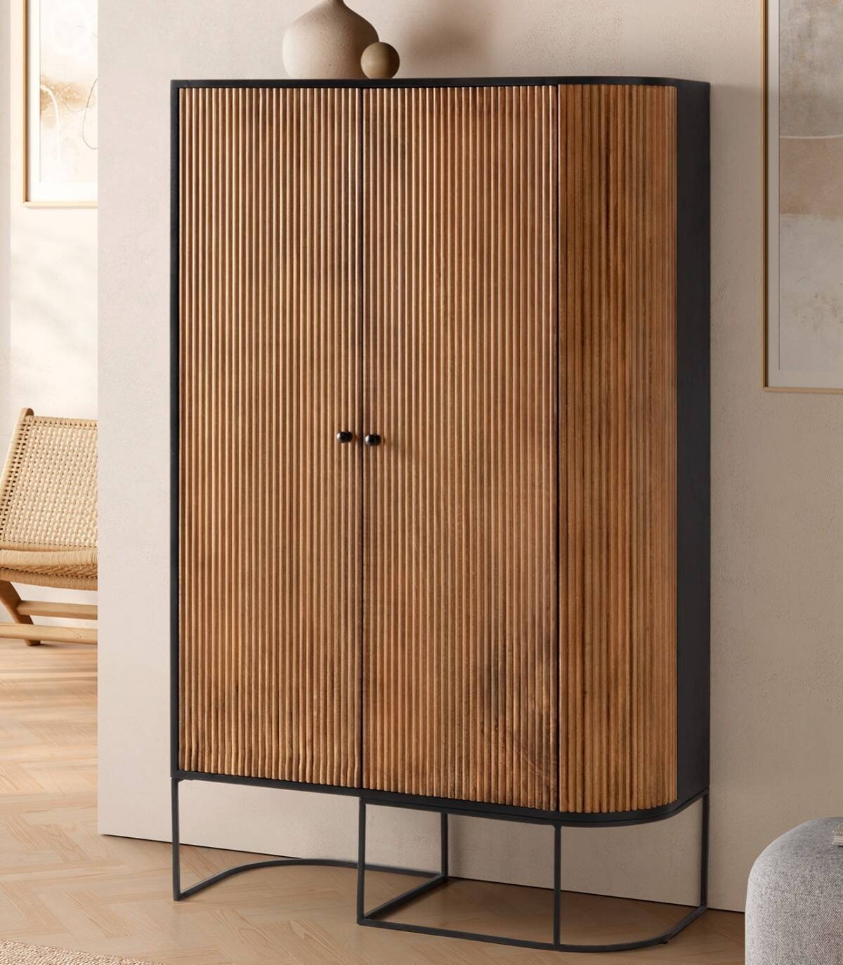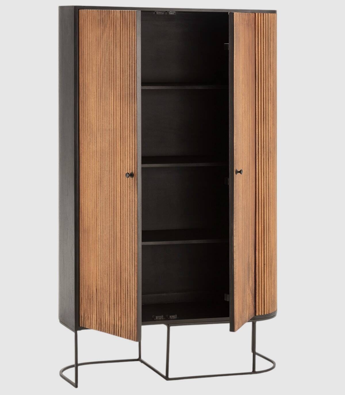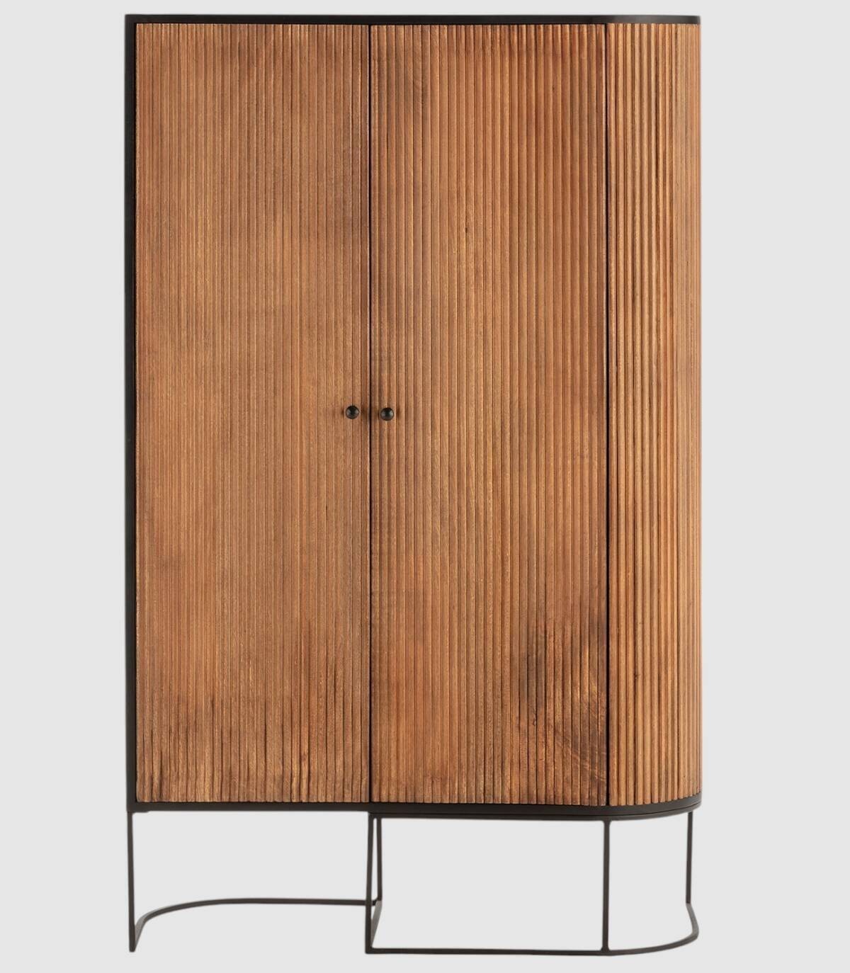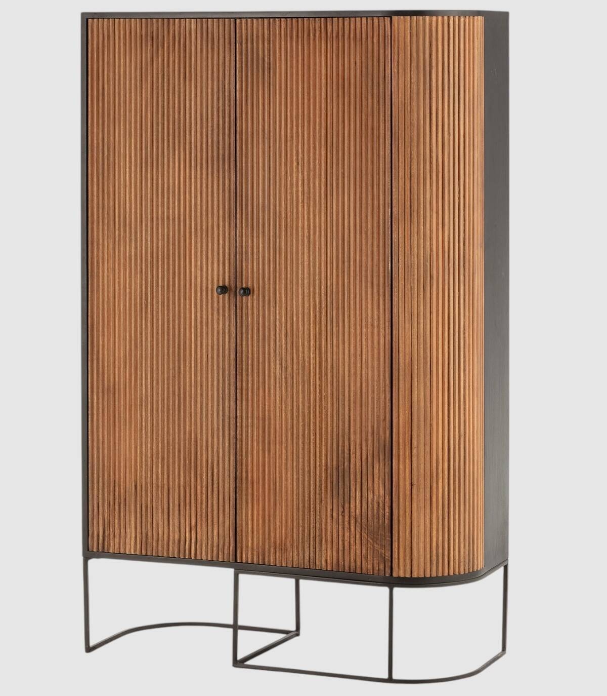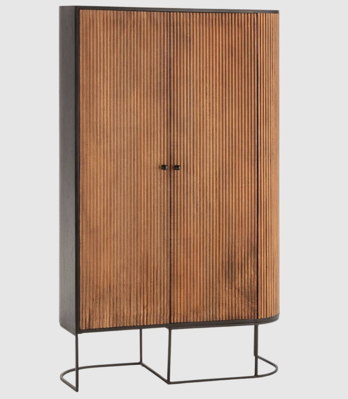 El armario Gladstone se compone de dos puertas con tiradores, frontal con lineas verticales en relieve de madera de mango de color natural, con la esquina derecha de forma redondeada, estructura de madera de mango barnizada de color negro y patas de metal de color negro con forma de varillas curvadas.