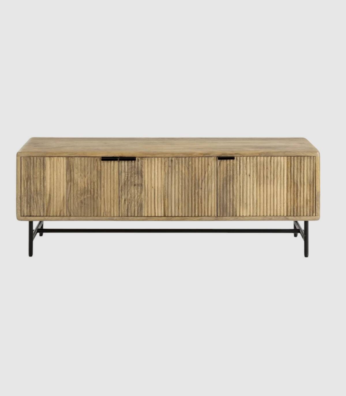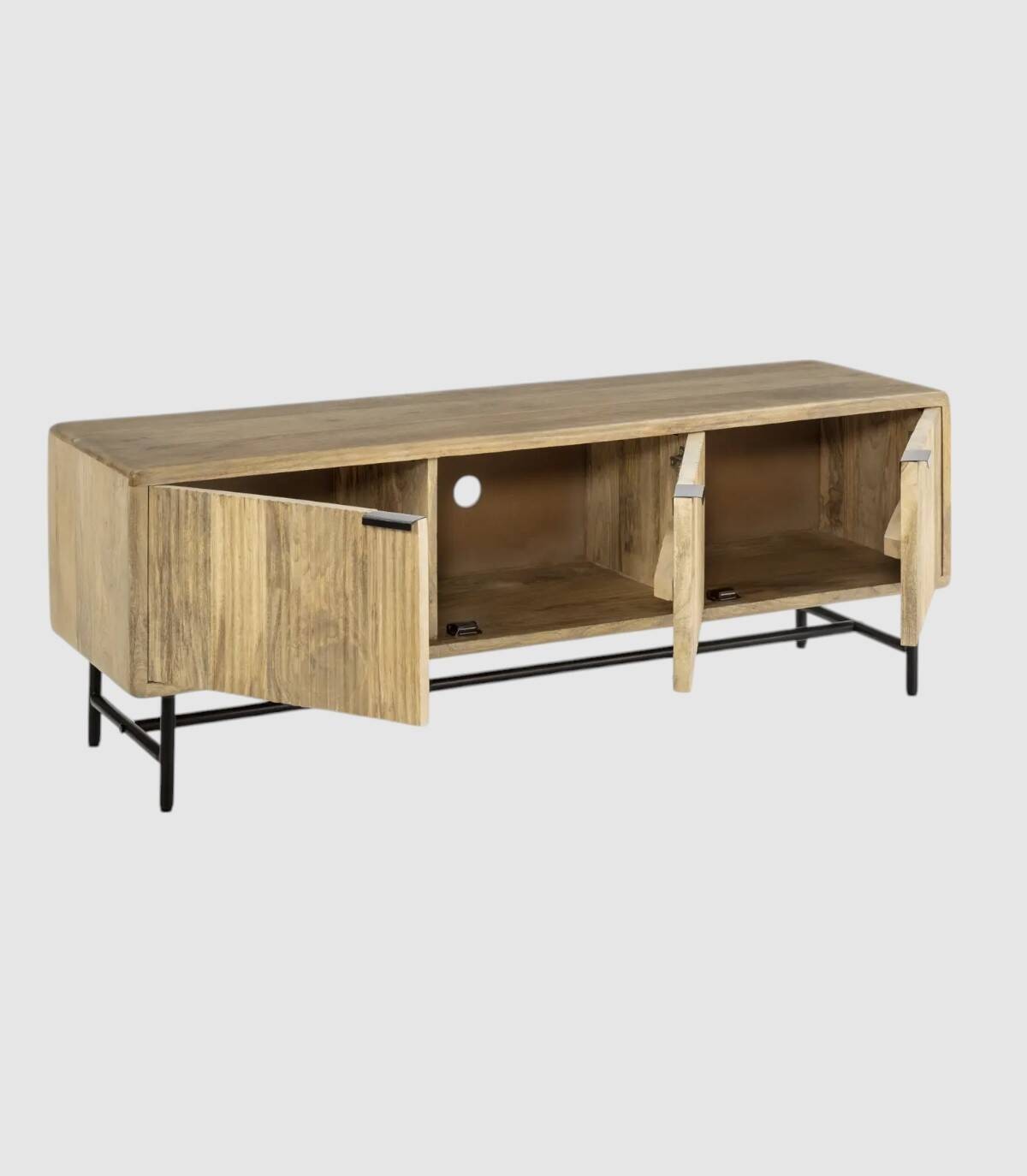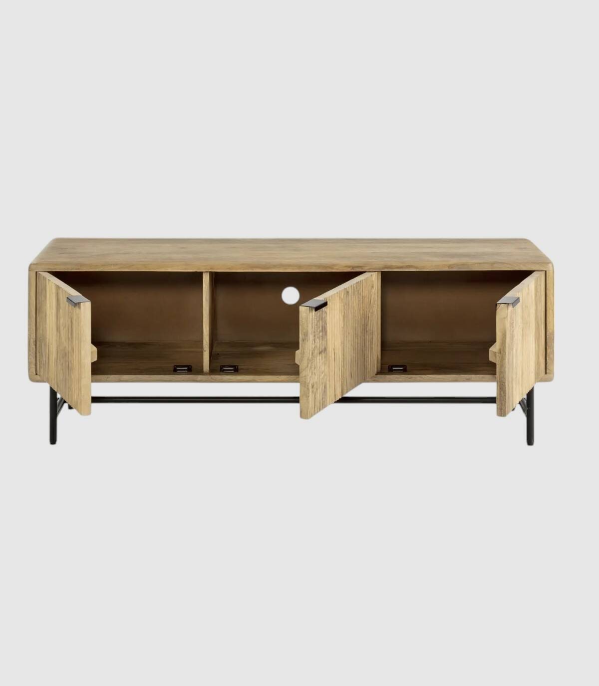 El mueble para televisores Mandurah se compone de tres puertas con tiradores negros, frontal estilo listones verticales, estructura de madera de mango barnizada de color natural y estructura con cuatro patas de metal pintado de color negro unidas por una varilla.