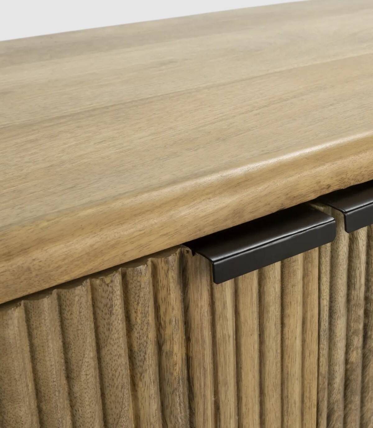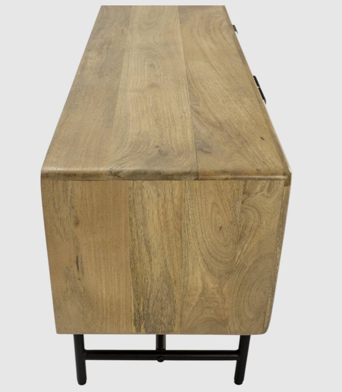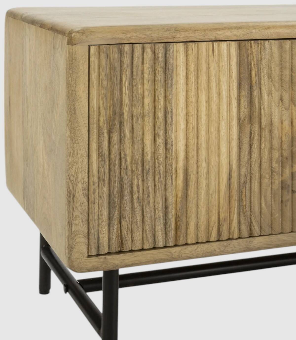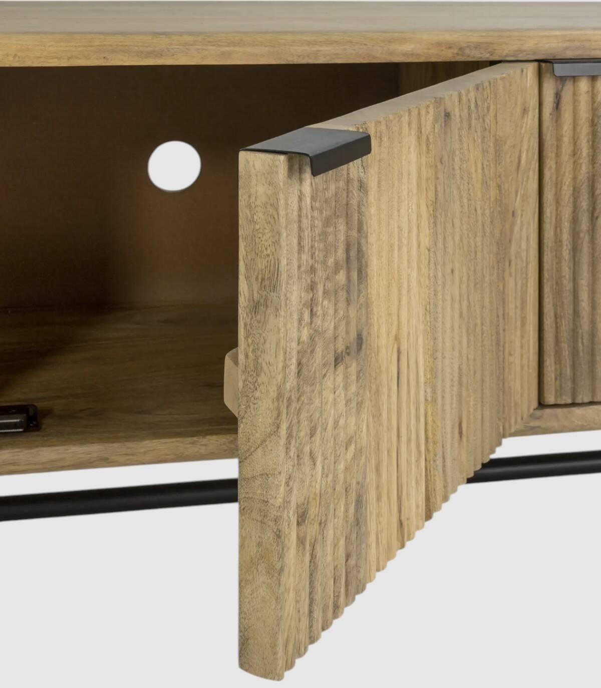 El mueble para televisores Mandurah se compone de tres puertas con tiradores negros, frontal estilo listones verticales, estructura de madera de mango barnizada de color natural y estructura con cuatro patas de metal pintado de color negro unidas por una varilla.