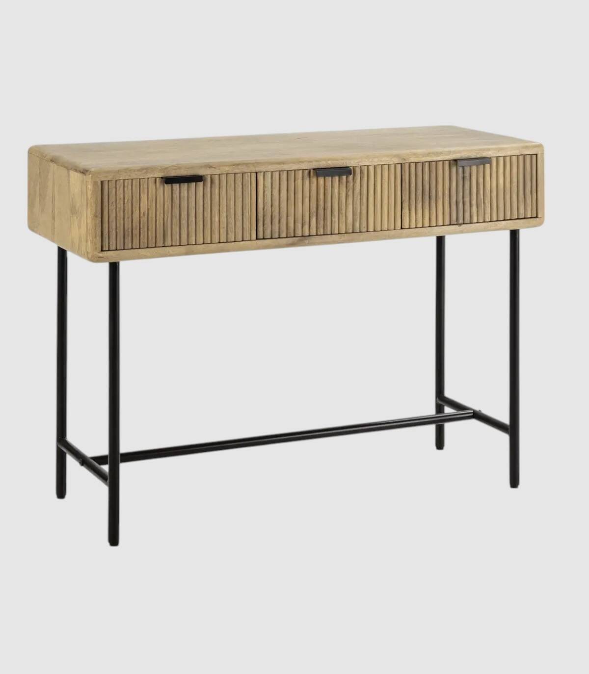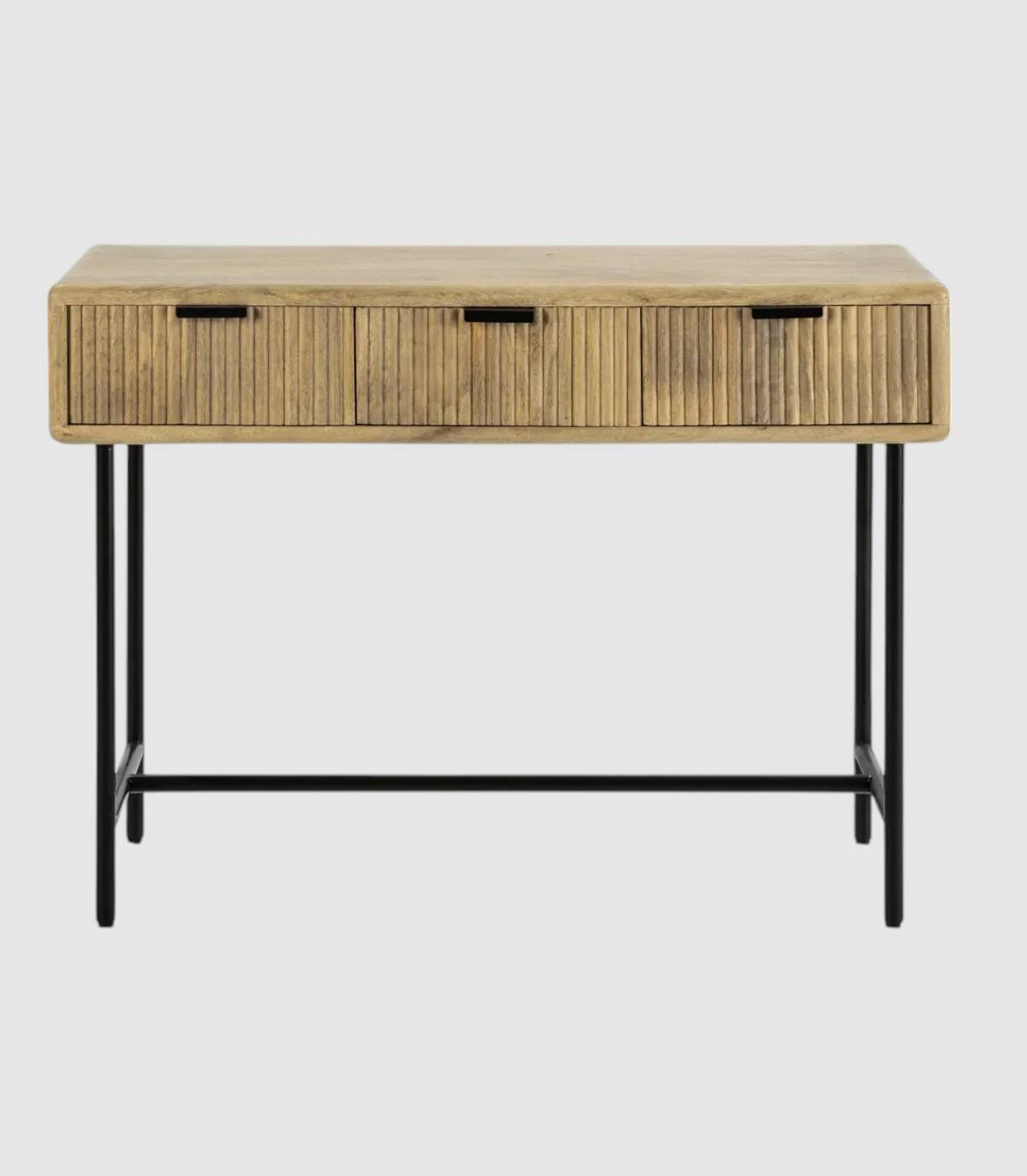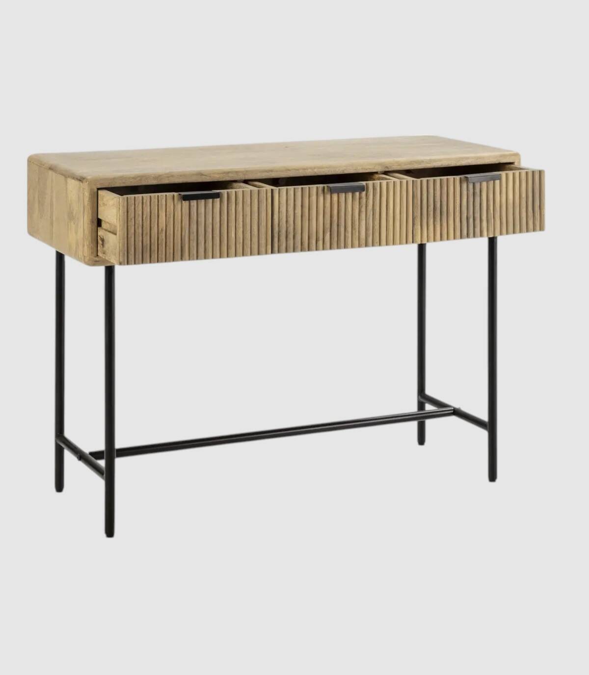 La consola Mandurah se compone de tres cajones con tiradores negros, frontal estilo listones verticales, estructura de madera de mango barnizada de color natural y estructura con cuatro patas de metal pintado de color negro unidas por una varilla.