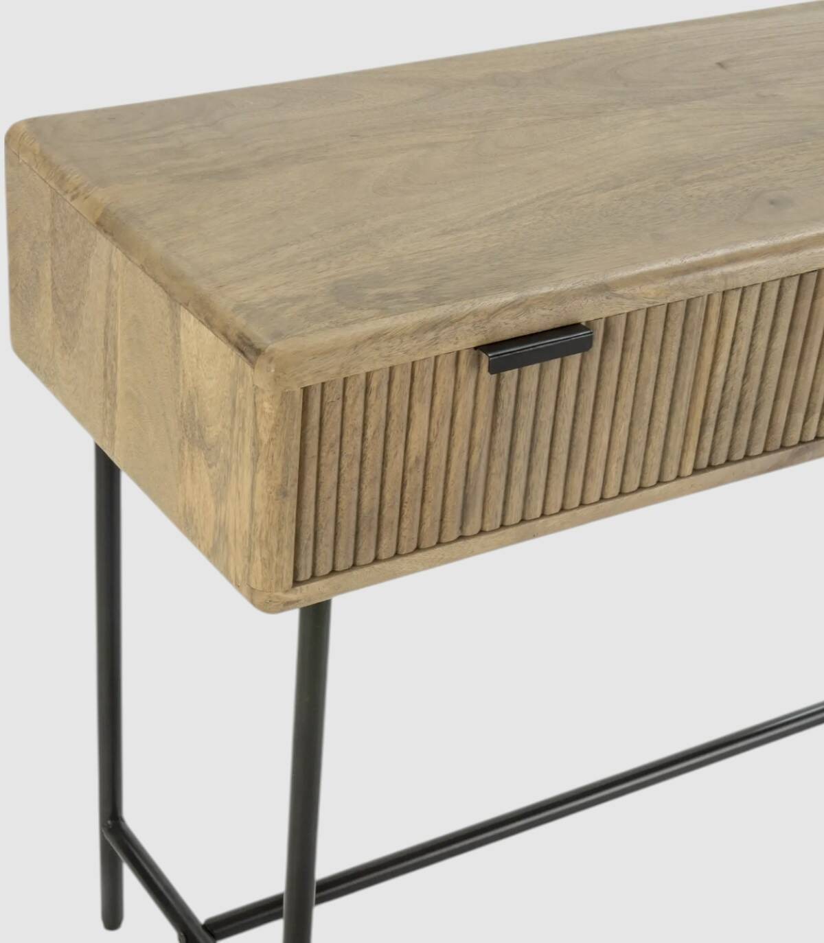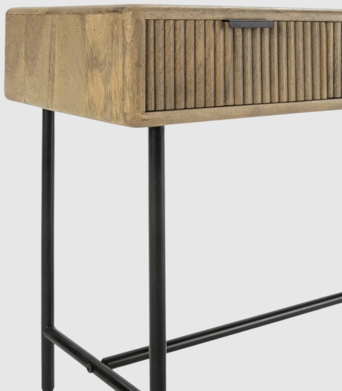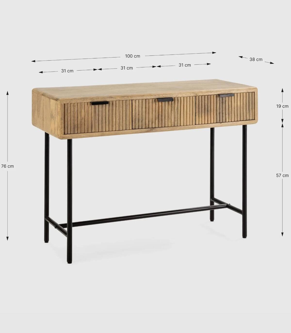 La consola Mandurah se compone de tres cajones con tiradores negros, frontal estilo listones verticales, estructura de madera de mango barnizada de color natural y estructura con cuatro patas de metal pintado de color negro unidas por una varilla.