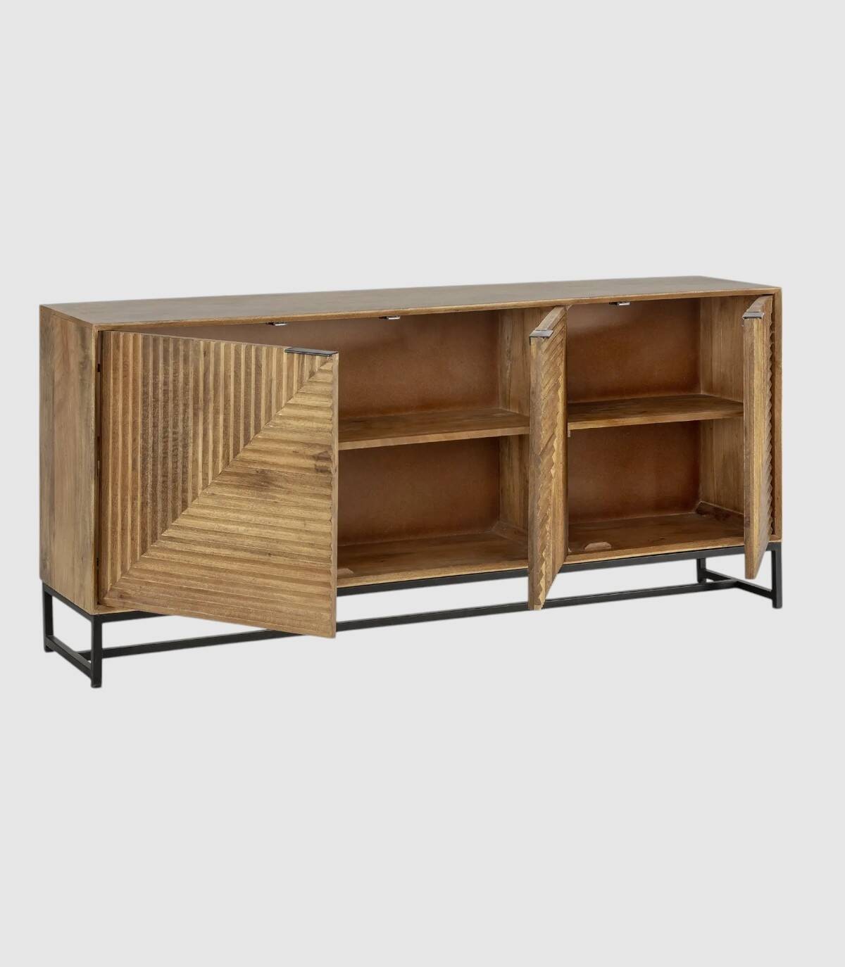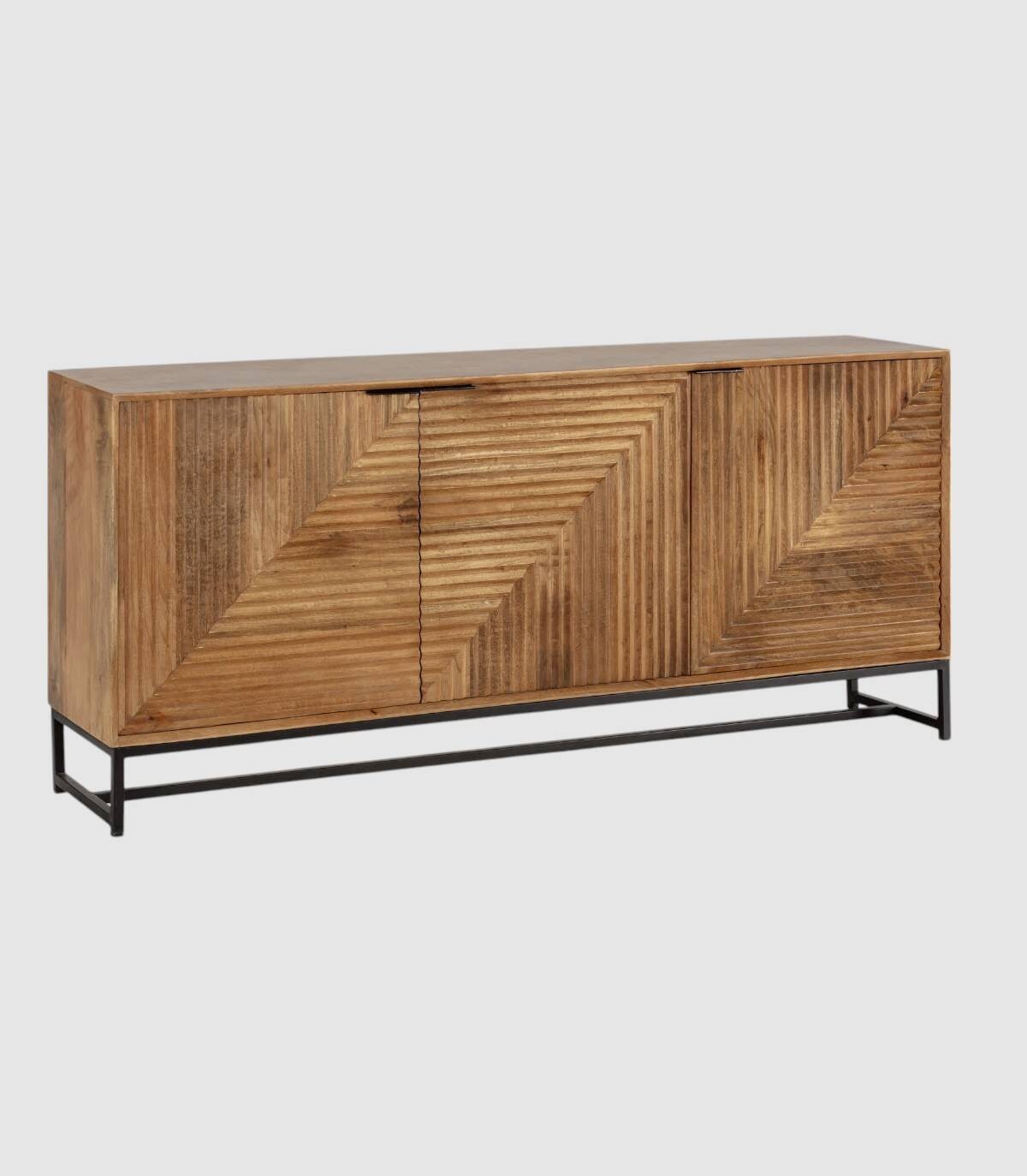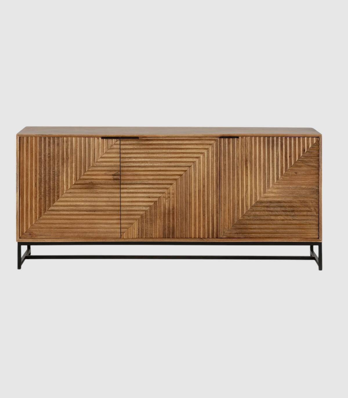 El aparador Fremantle se compone de tres puertas con tiradores negros, frontal estilo listones verticales y horizontales, estructura de madera de mango barnizada de color natural y estructura con cuatro patas de metal pintado de color negro unidas por una varilla.