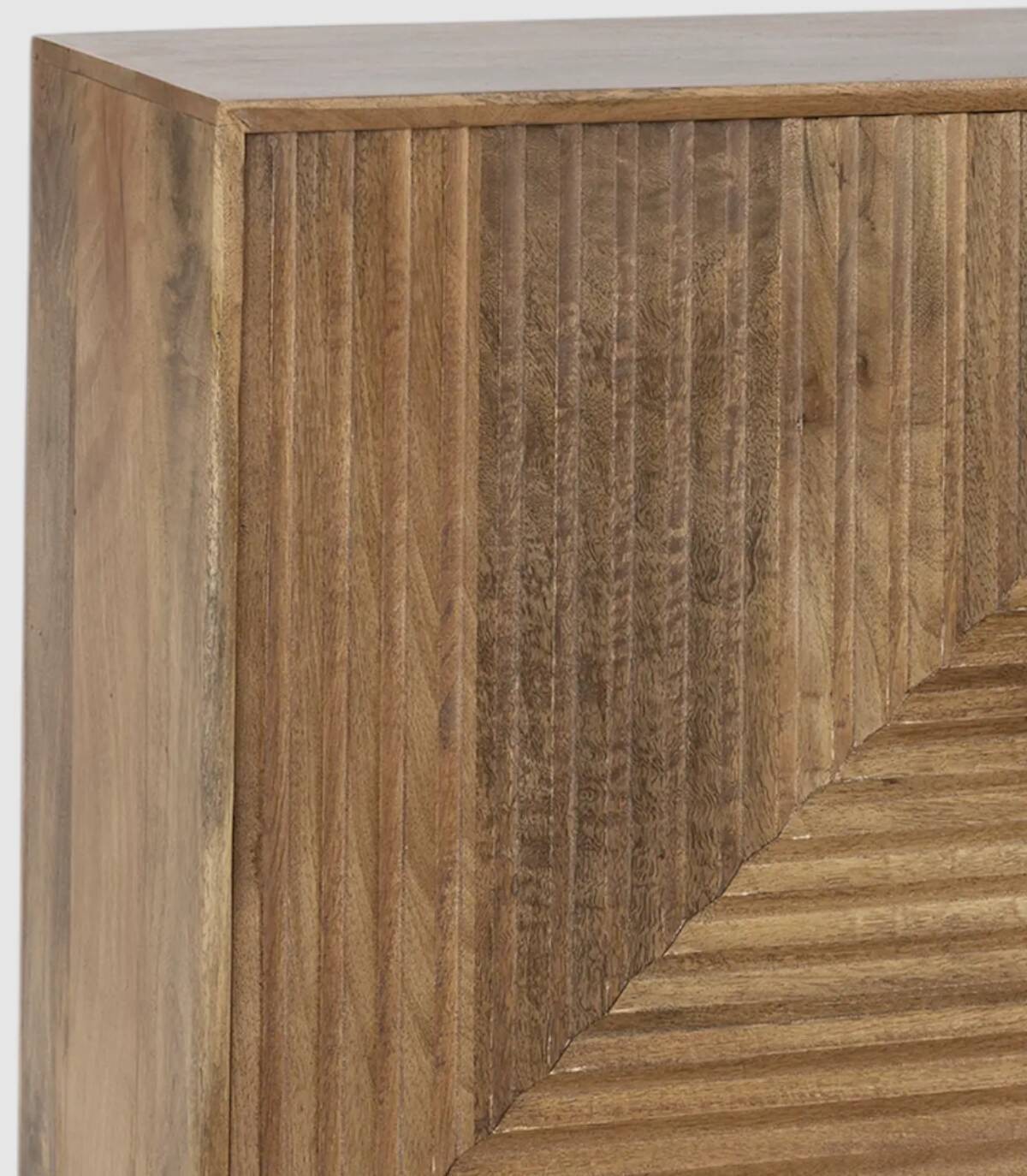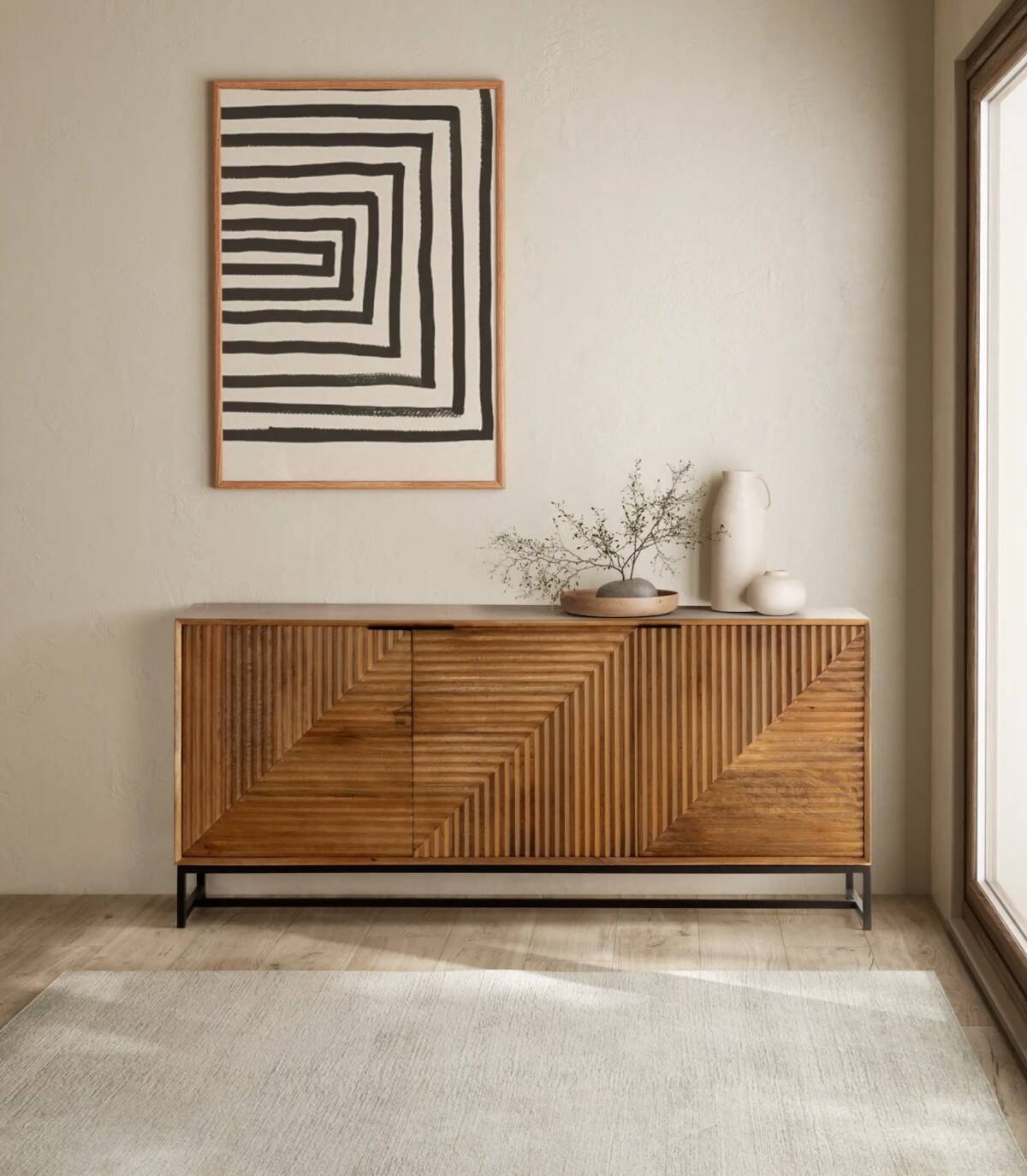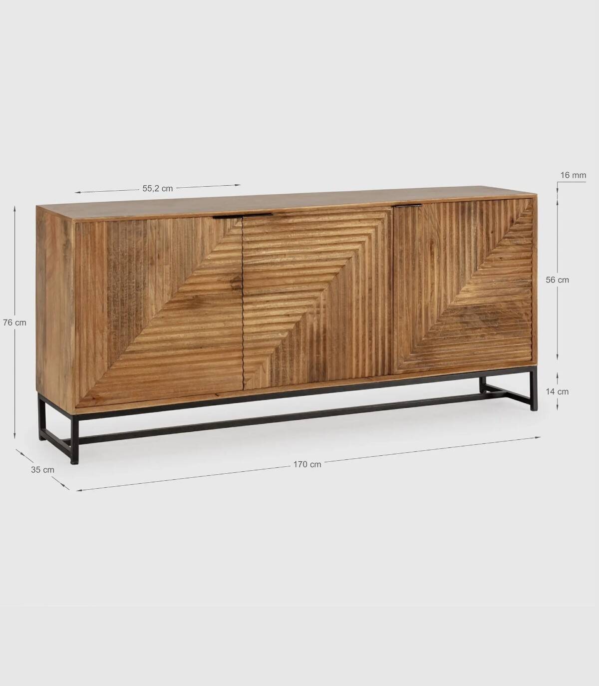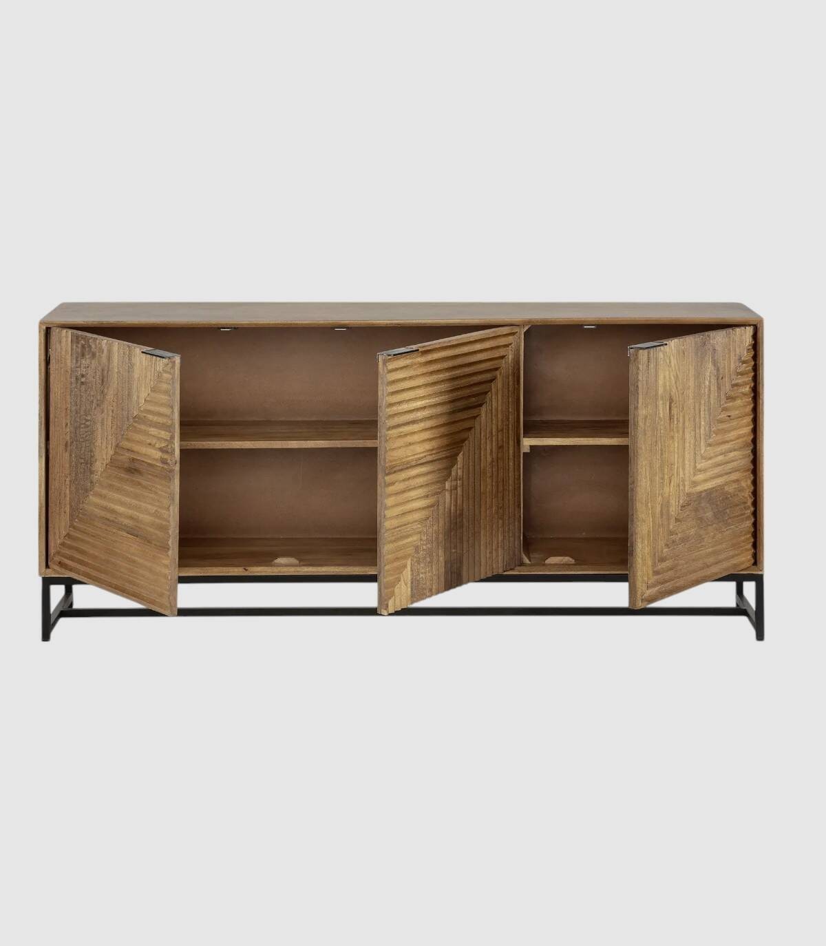 El aparador Fremantle se compone de tres puertas con tiradores negros, frontal estilo listones verticales y horizontales, estructura de madera de mango barnizada de color natural y estructura con cuatro patas de metal pintado de color negro unidas por una varilla.