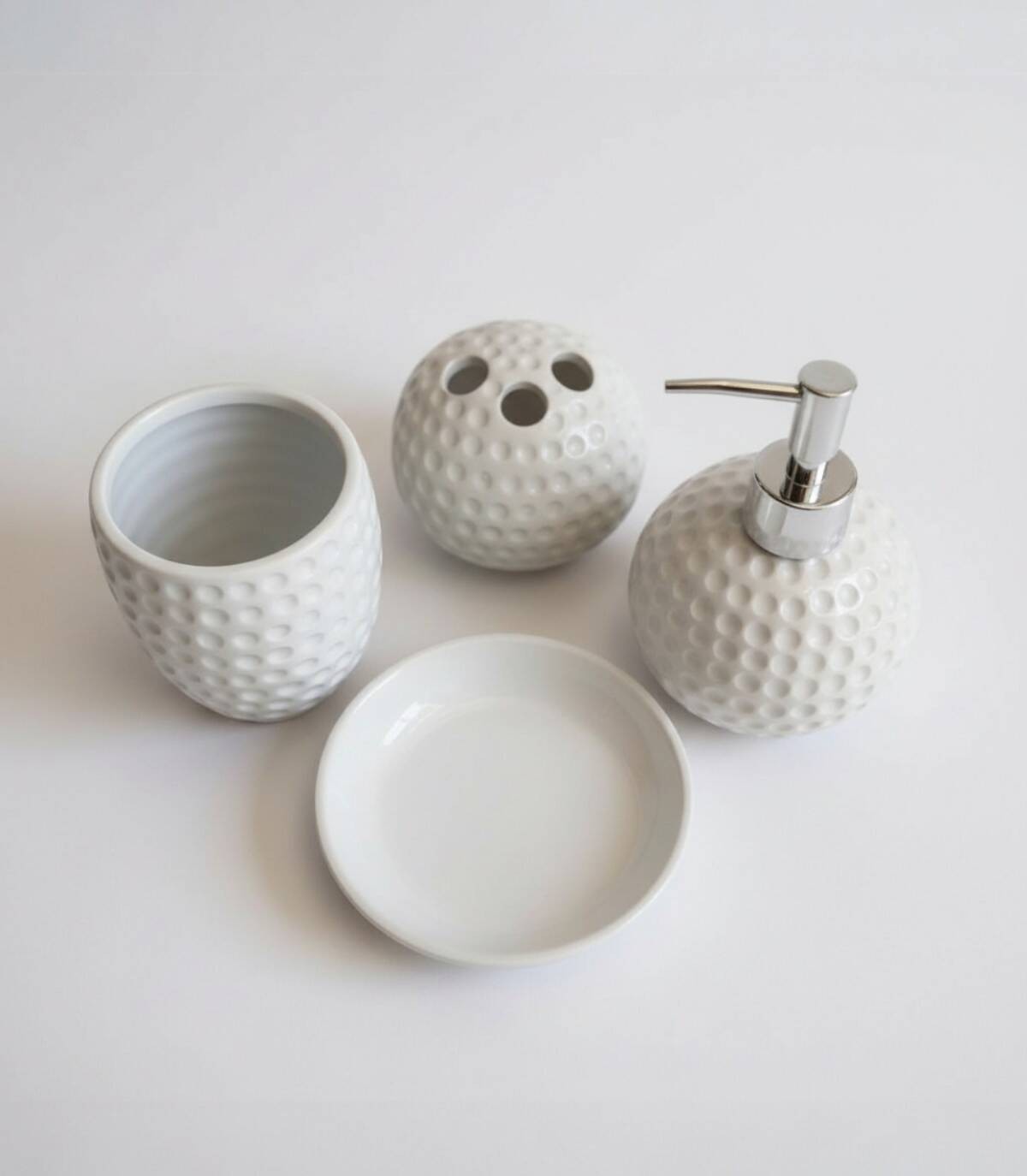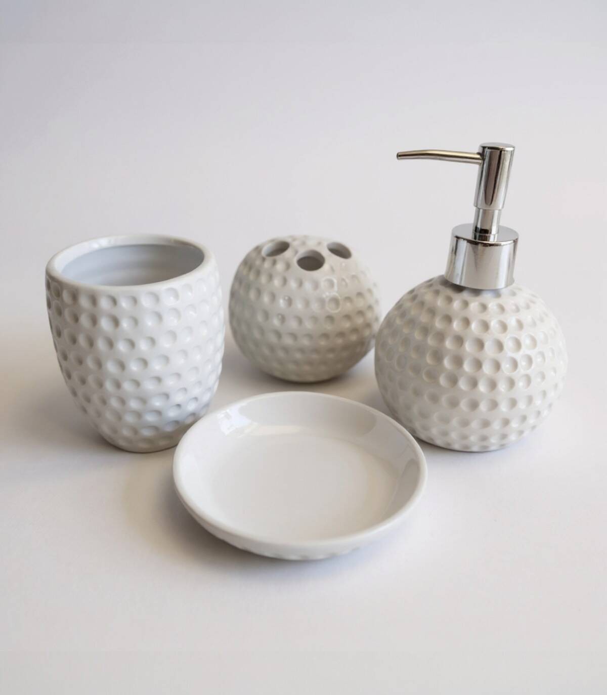 Set van 16x9cm dispenser, 9x9cm tandenborstelhouder, 10x8cm glas en 11x2,5cm zeepbakje in wit keramiek
