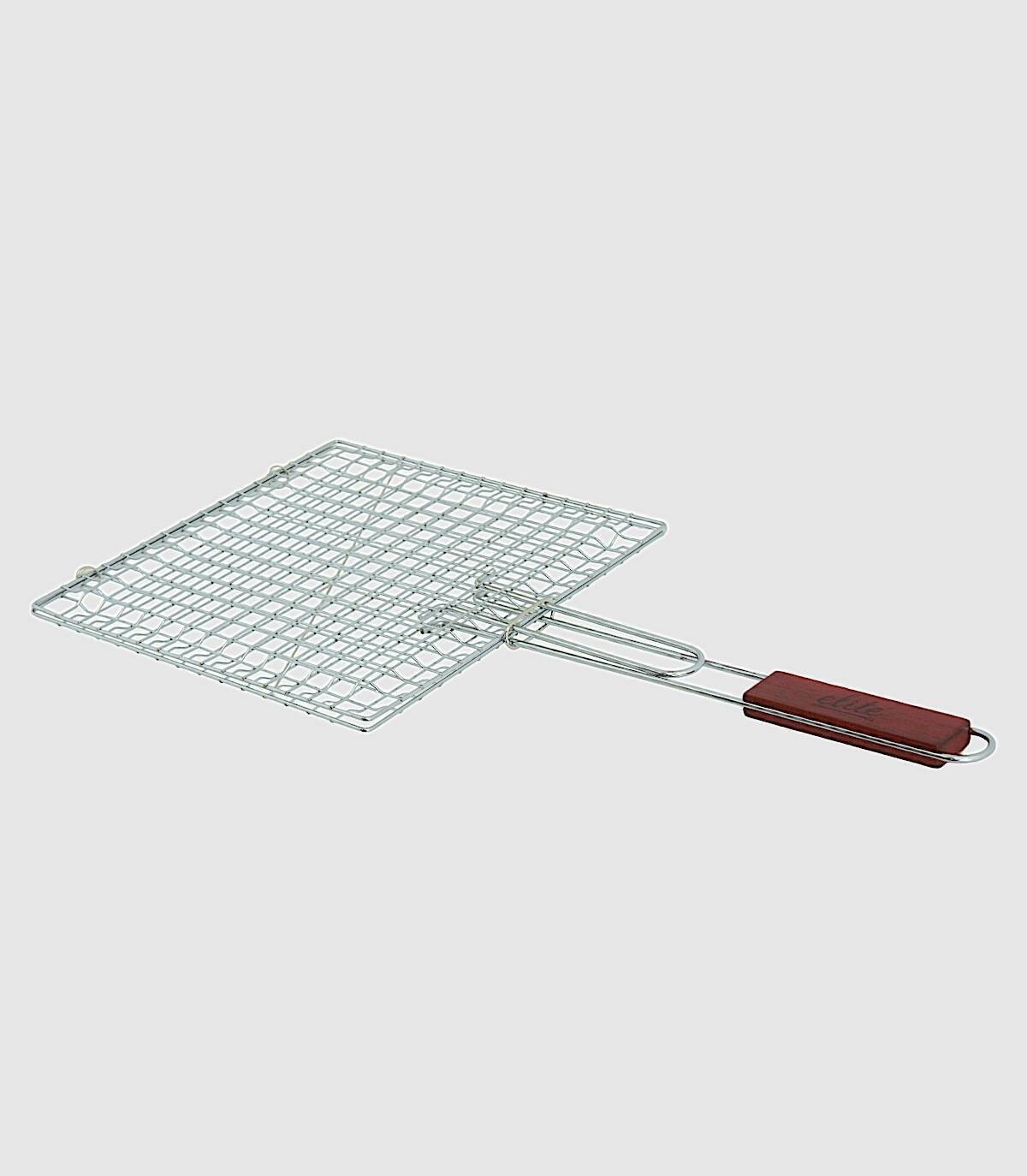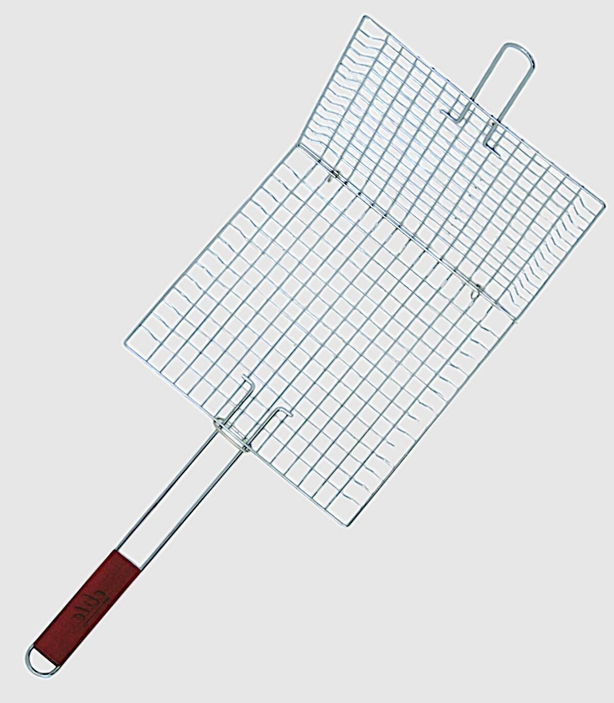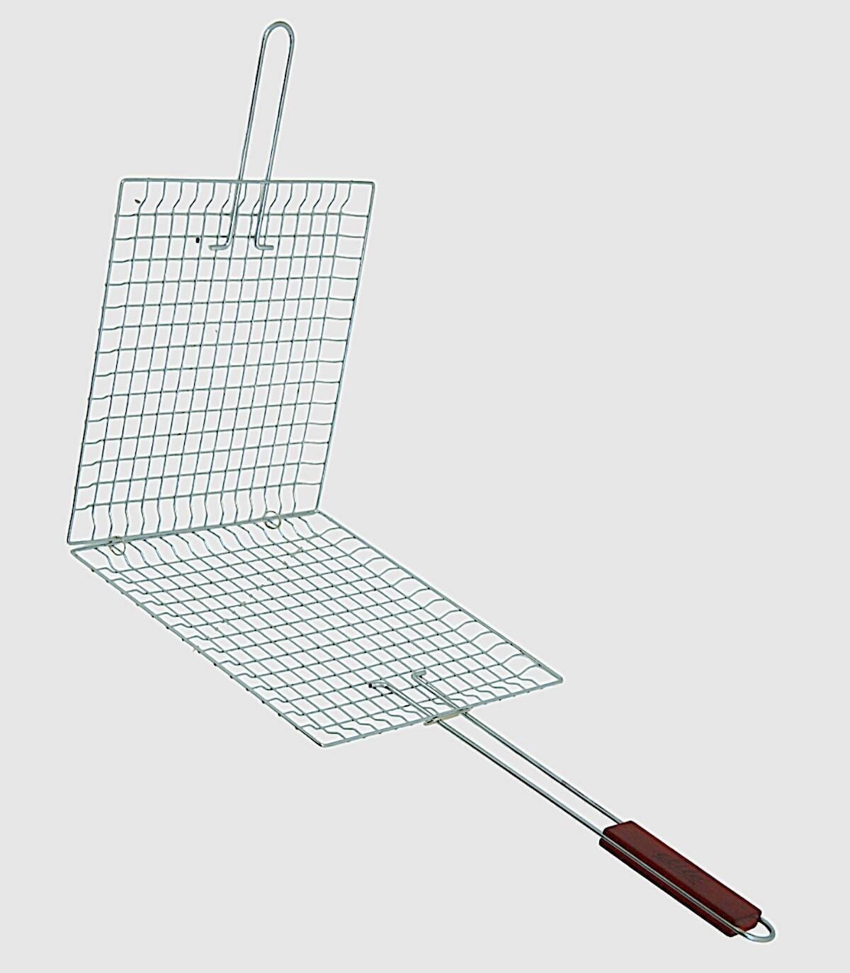 Parrilla de tamaño mediano con mango visagras para abrir y cierre para asar comida en la barbacoa de forma comoda. Superficie de cocinado 28 x 28 cm.
