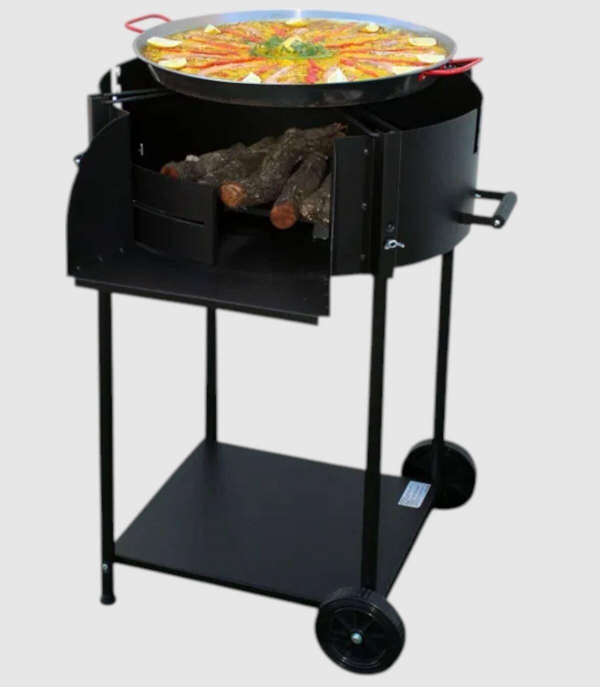 La barbacoa Mi Paella con ruedas se compone de quemador de carbón o leña con ladrillos refractarios, parrilla regulable en tres alturas de acero inoxidable con dos bandejas y triador.