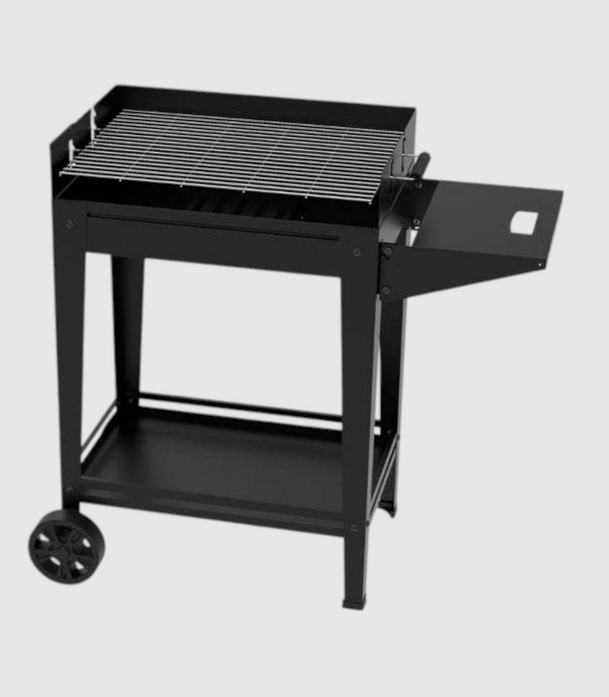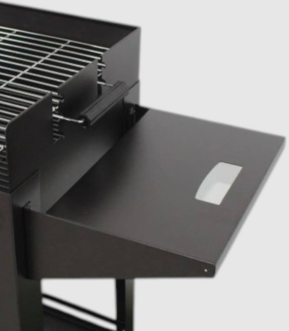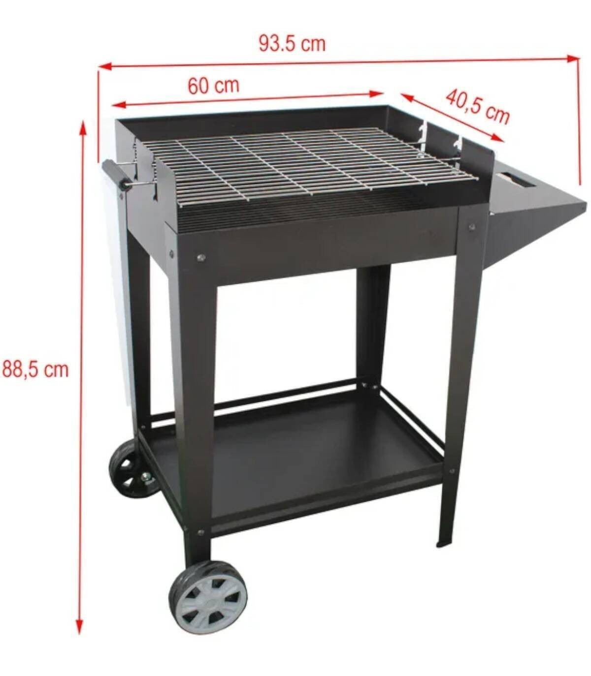 La barbacoa con ruedas Denia se compone de estructura de acero, quemador para carbón o leña, parrilla de acero inoxidable con asas ajustable en tres alturas, dos bandejas, una lateral con asa y dos ruedas.