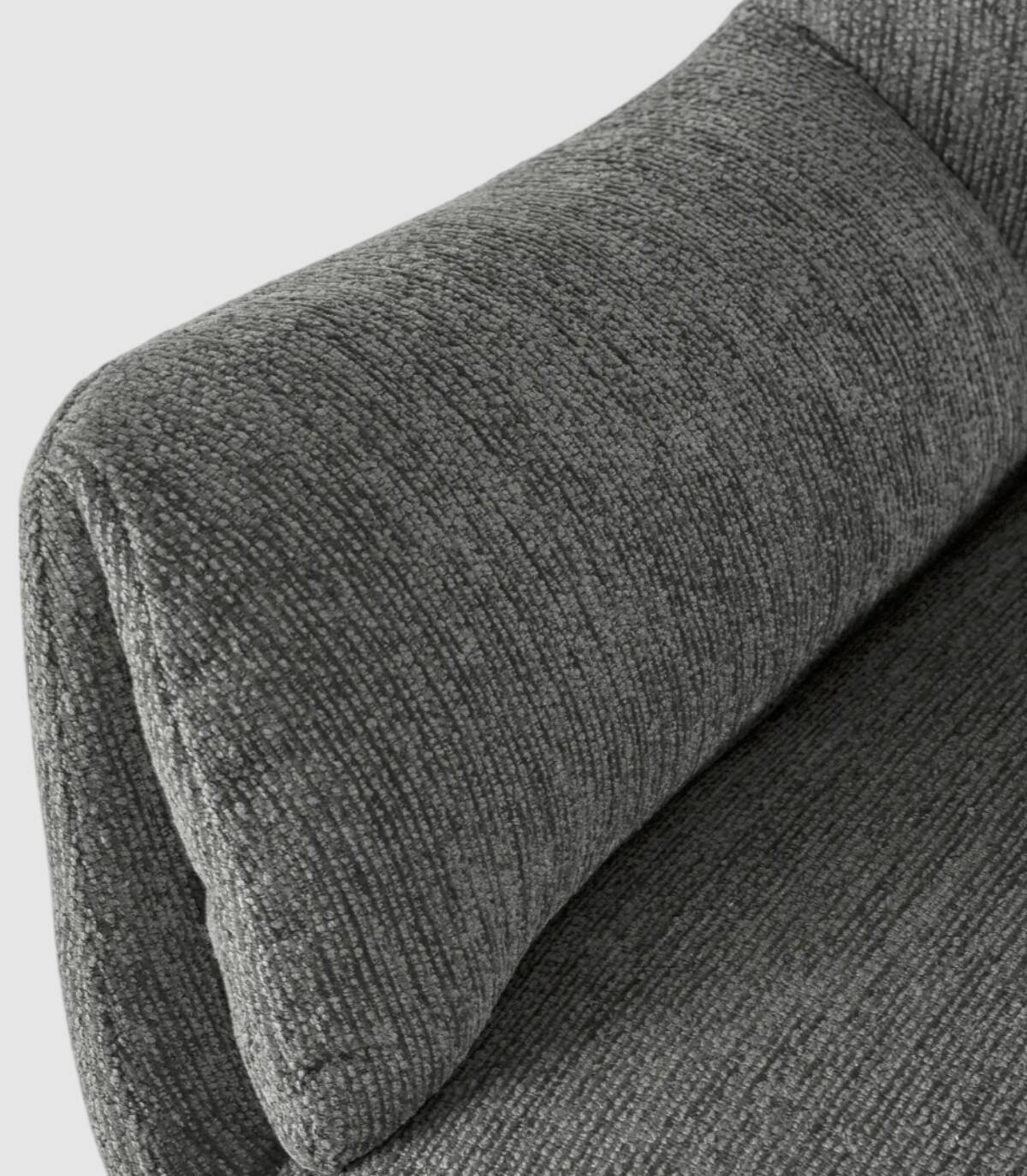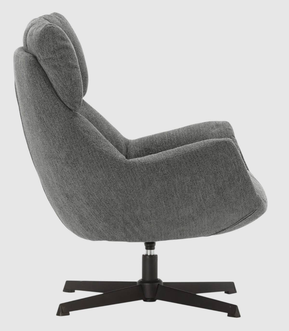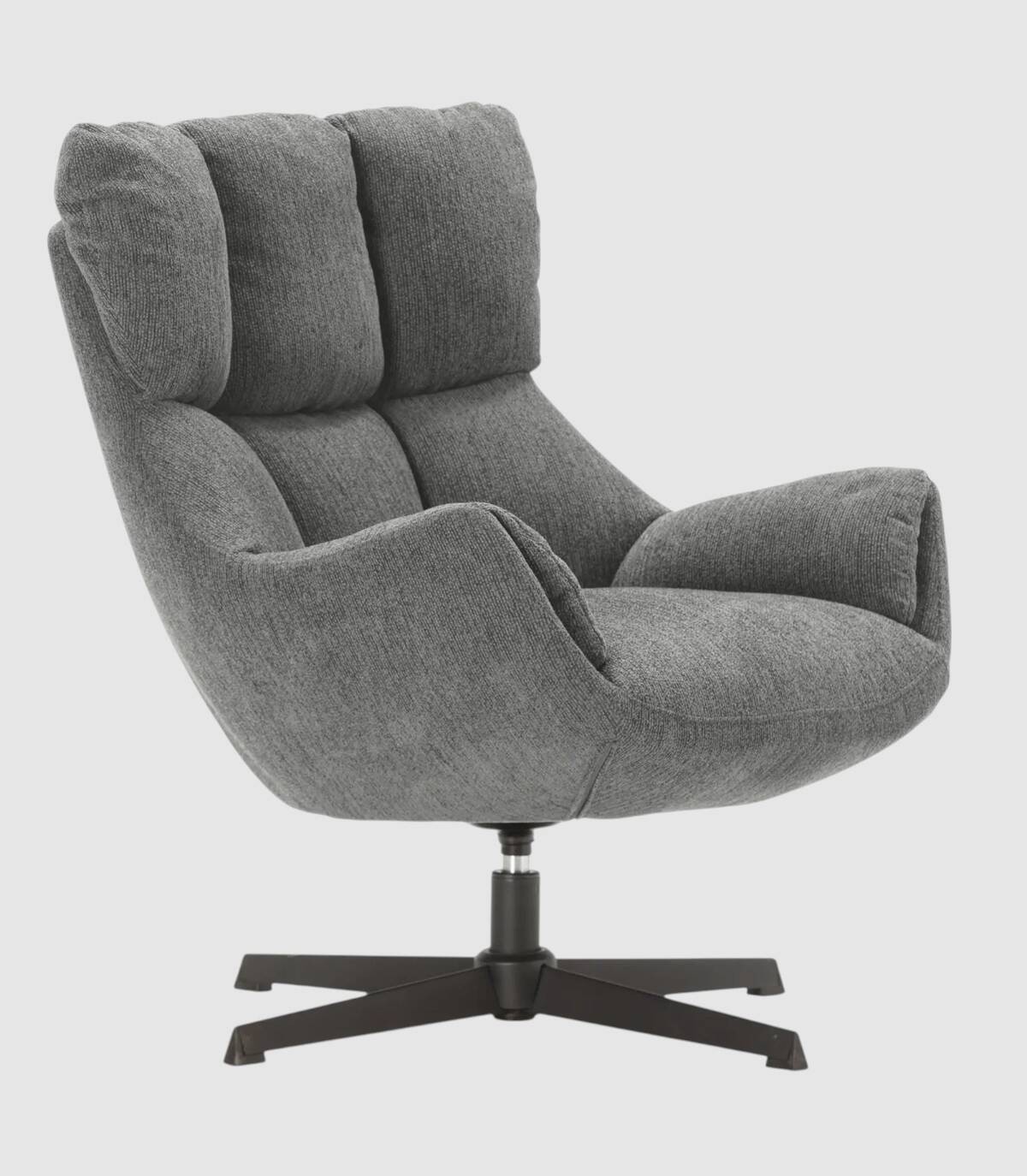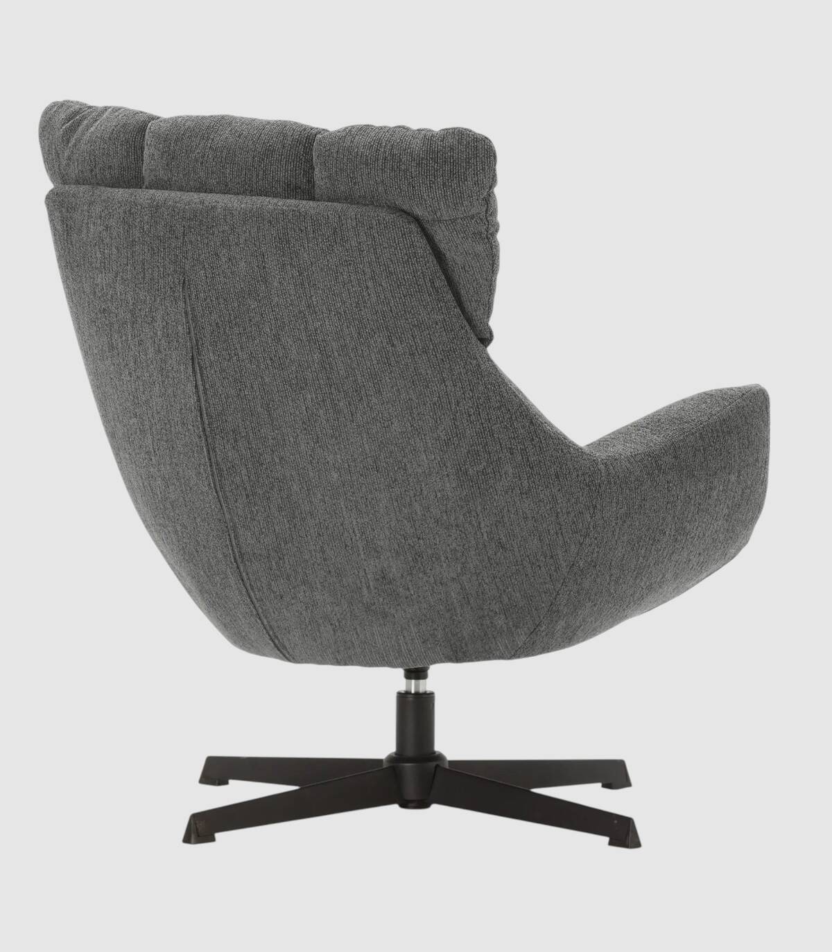 El sillón Tepey se compone de asiento, respaldo y reposabrazos tapizados de color gris sobre estructura de metal giratoria con cuatro patas de color negro.