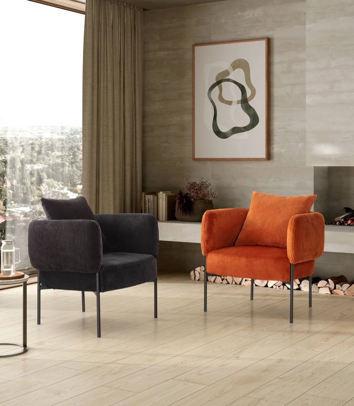 El sillón Tugan se compone de asiento, respaldo y reposabrazos tapizados de color negro sobre estructura de metal con cuatro patas de color negro.