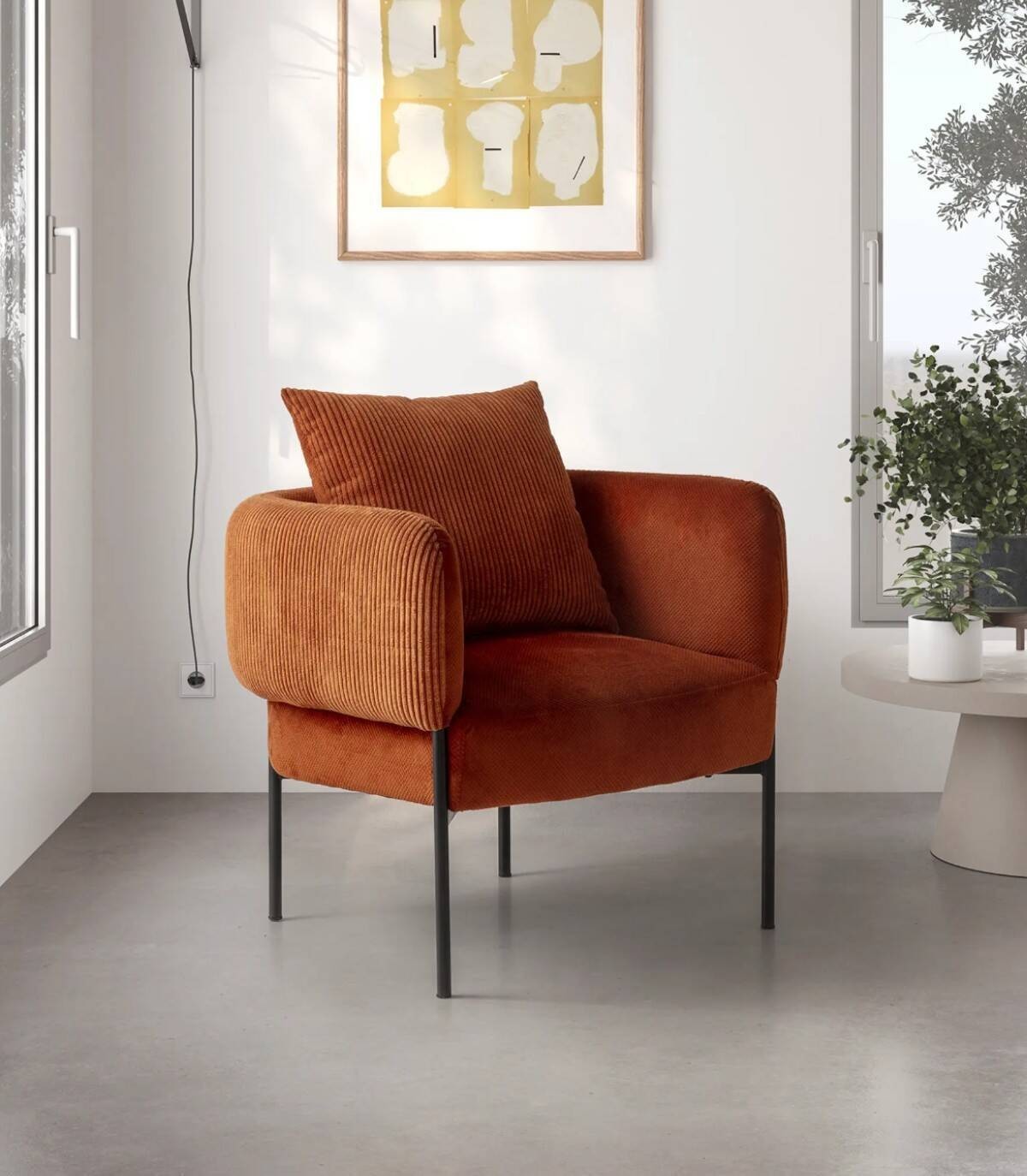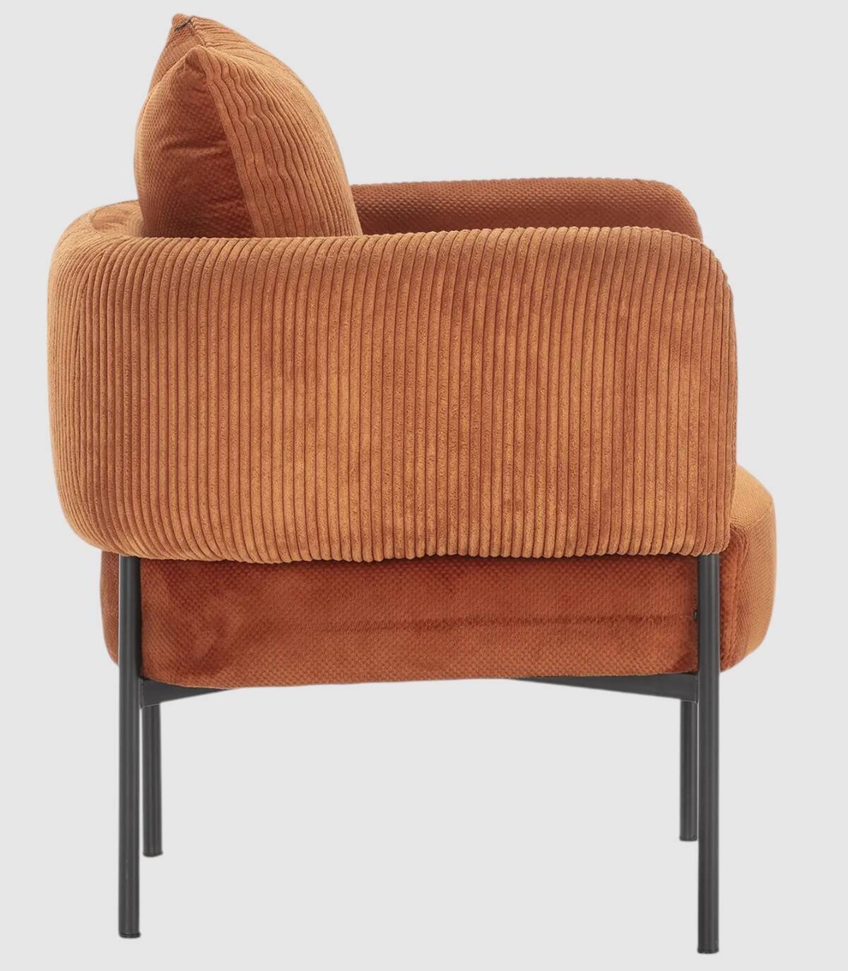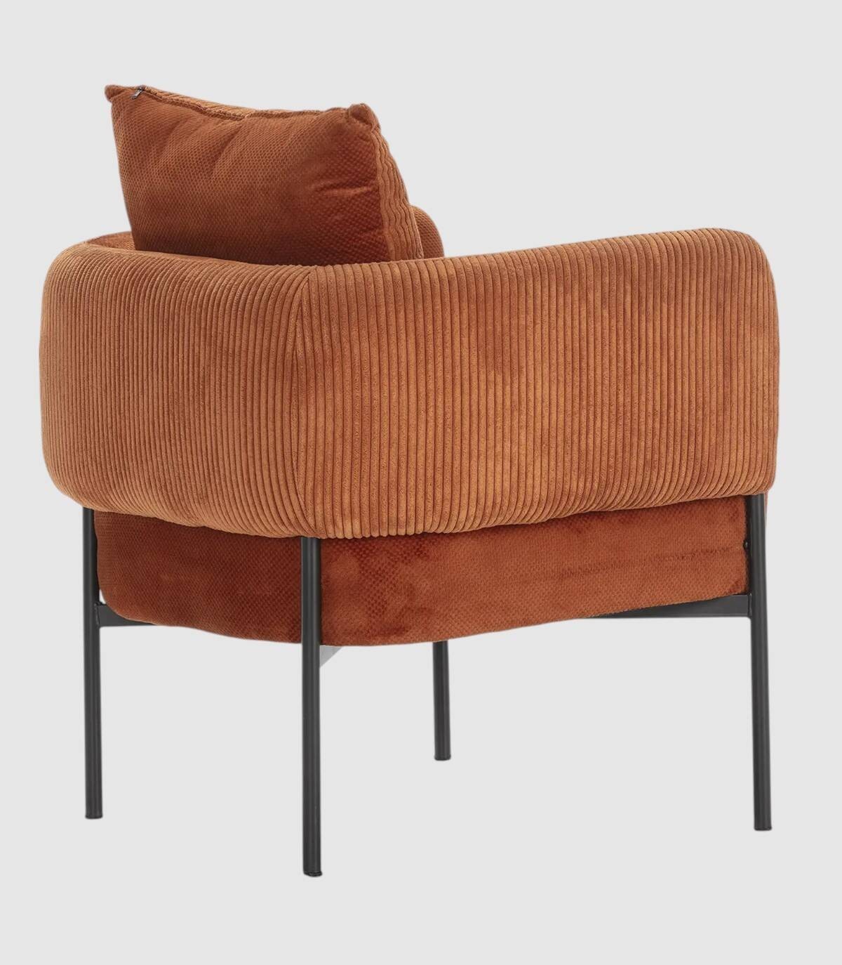 El sillón Tugan se compone de asiento, respaldo y reposabrazos tapizados de color teja sobre estructura de metal con cuatro patas de color negro.