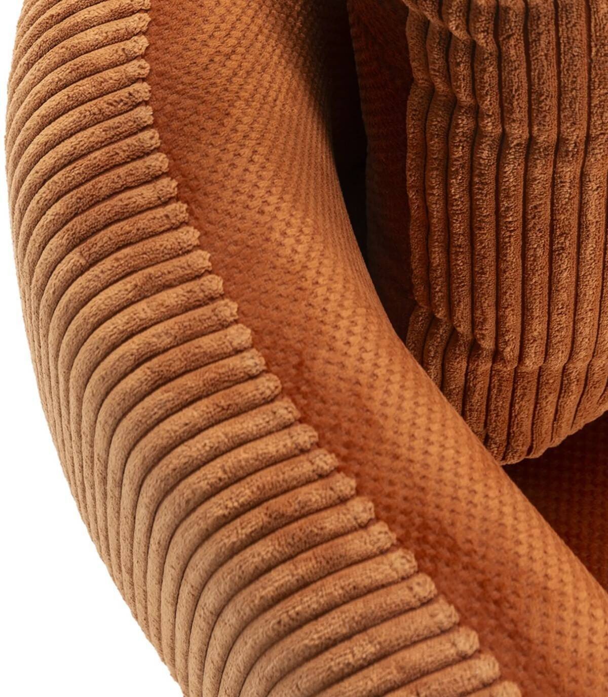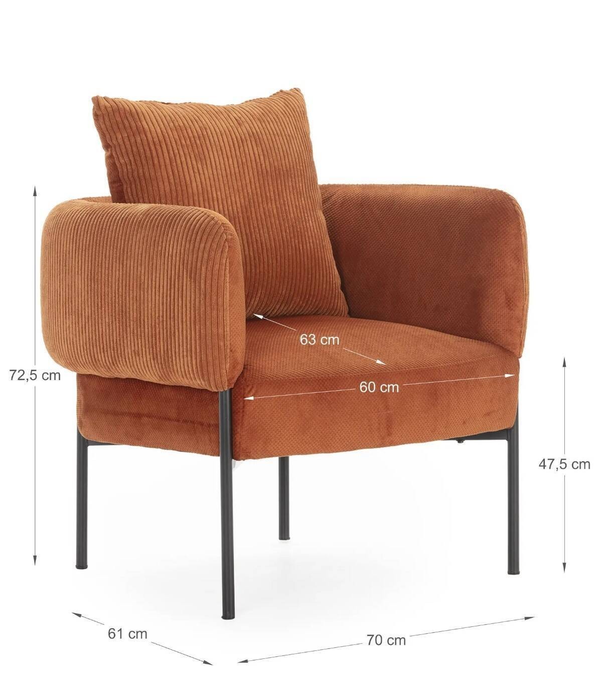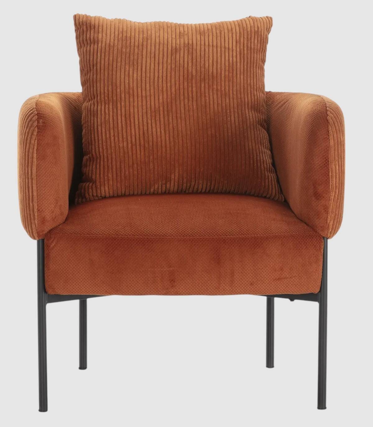 El sillón Tugan se compone de asiento, respaldo y reposabrazos tapizados de color teja sobre estructura de metal con cuatro patas de color negro.