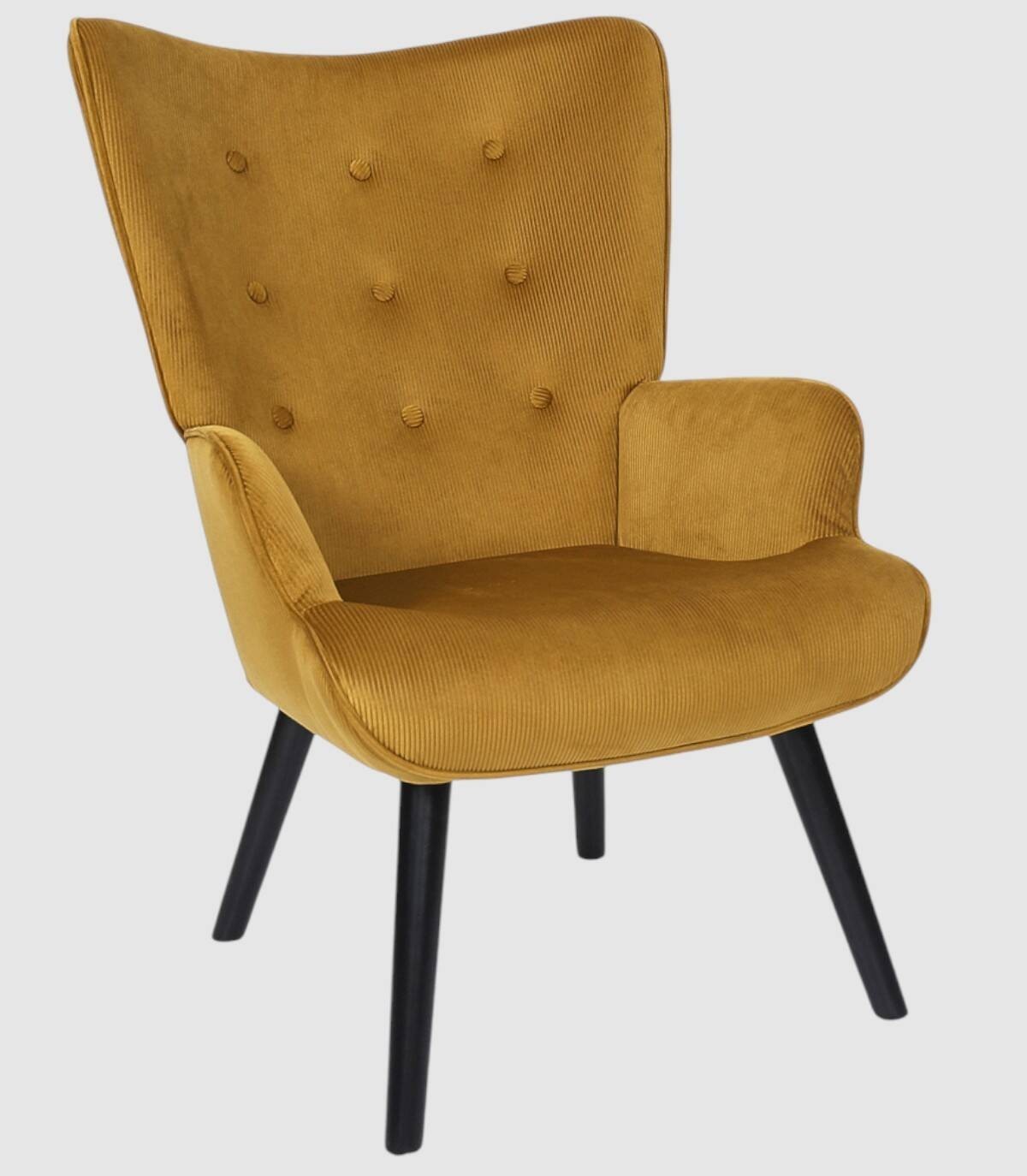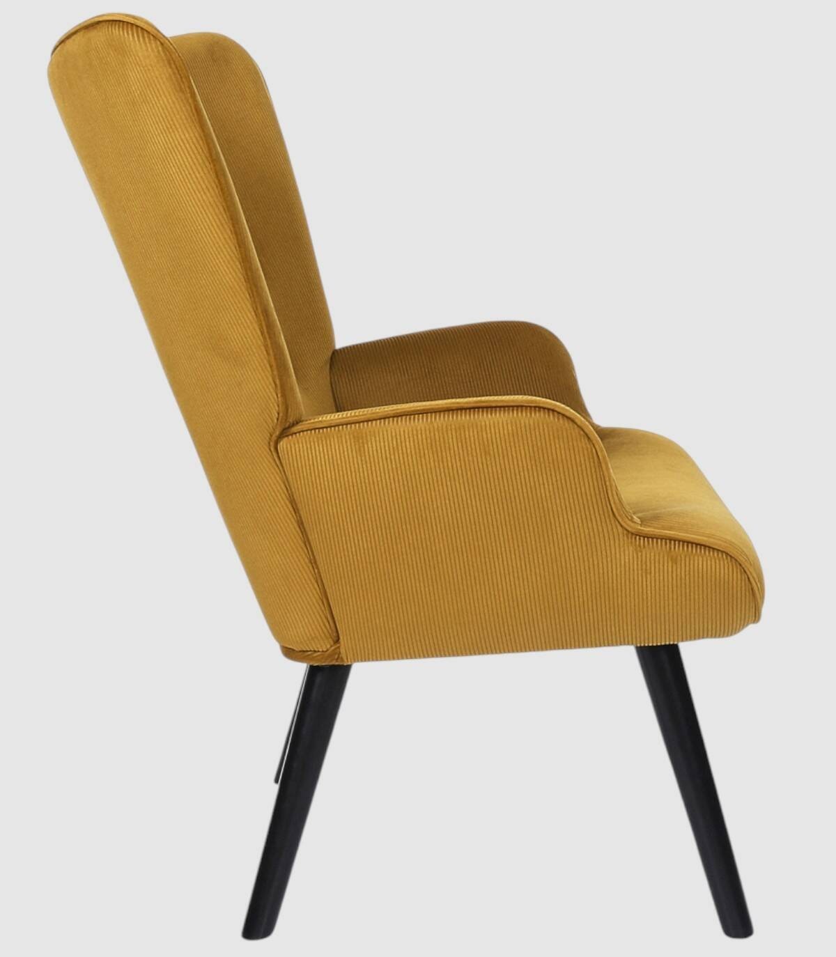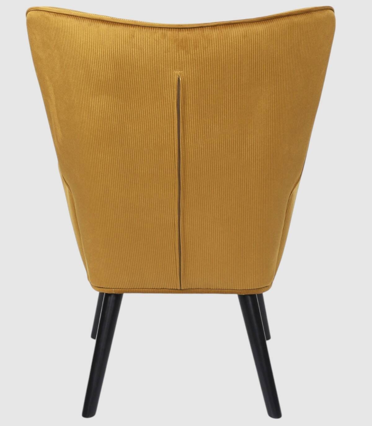 La butaca Giulia se compone de asiento, respaldo y reposabrazos tapizado de poliéster de color mostaza relleno de poliuretano con estructura de acero y patas de madera de árbol de la goma pintadas de negro.