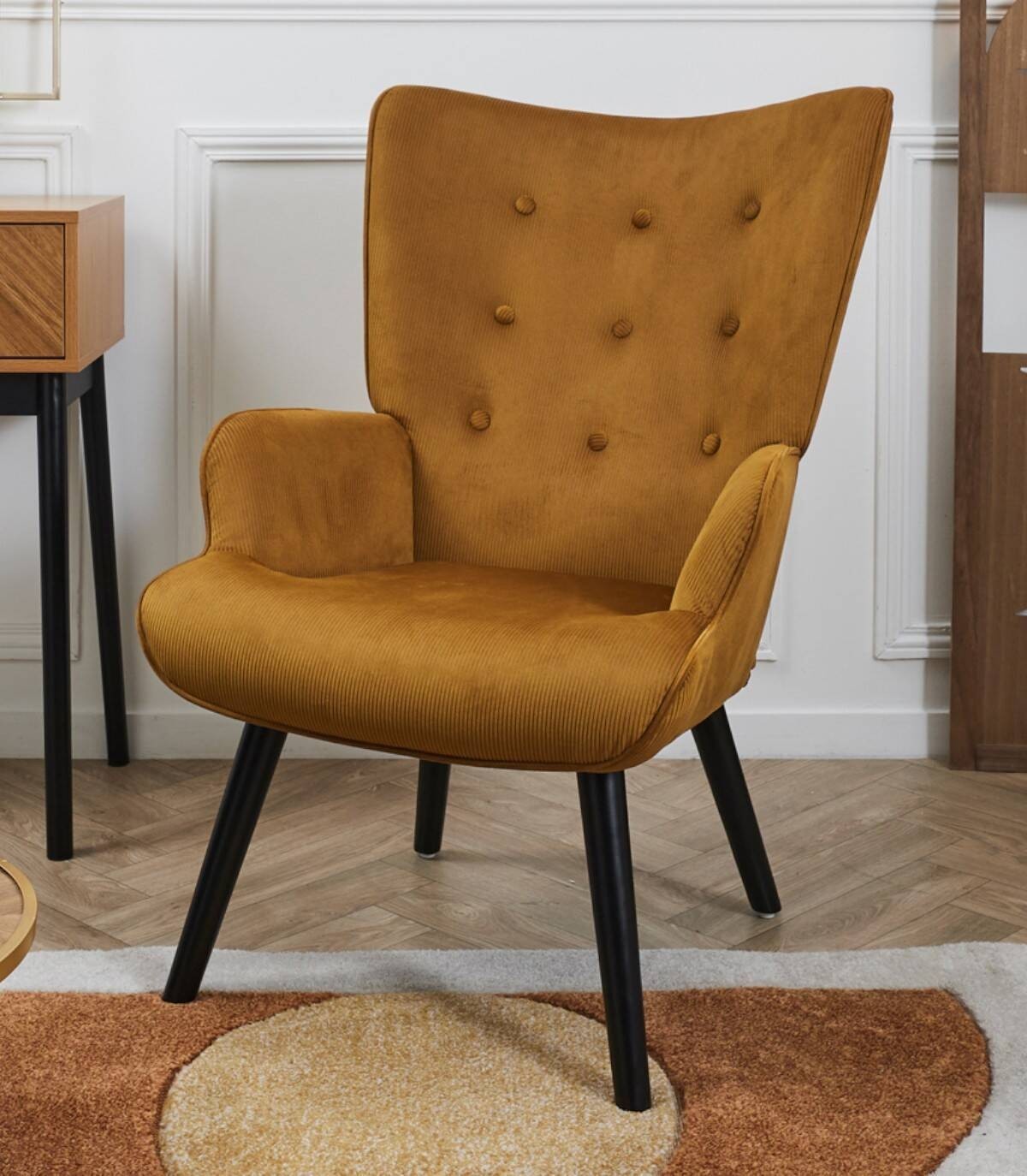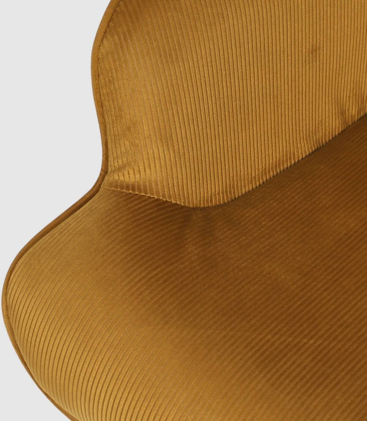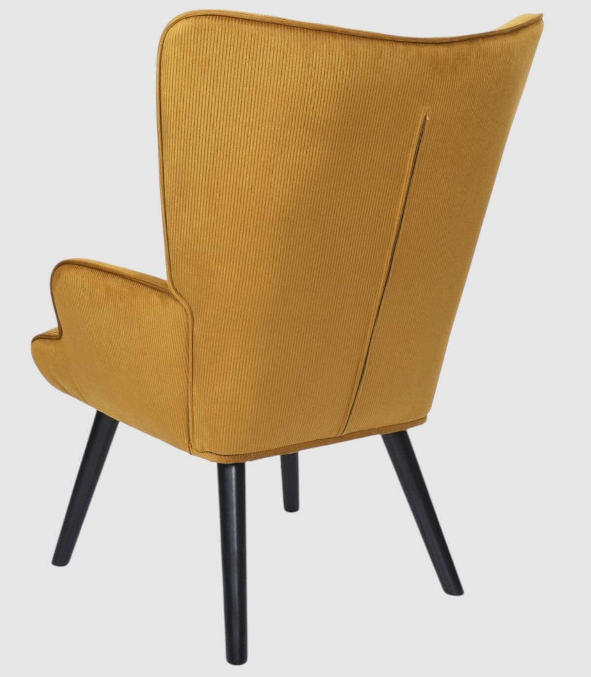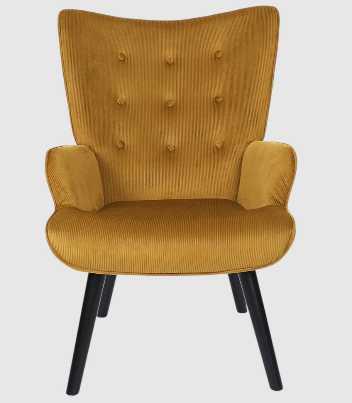 La butaca Giulia se compone de asiento, respaldo y reposabrazos tapizado de poliéster de color mostaza relleno de poliuretano con estructura de acero y patas de madera de árbol de la goma pintadas de negro.