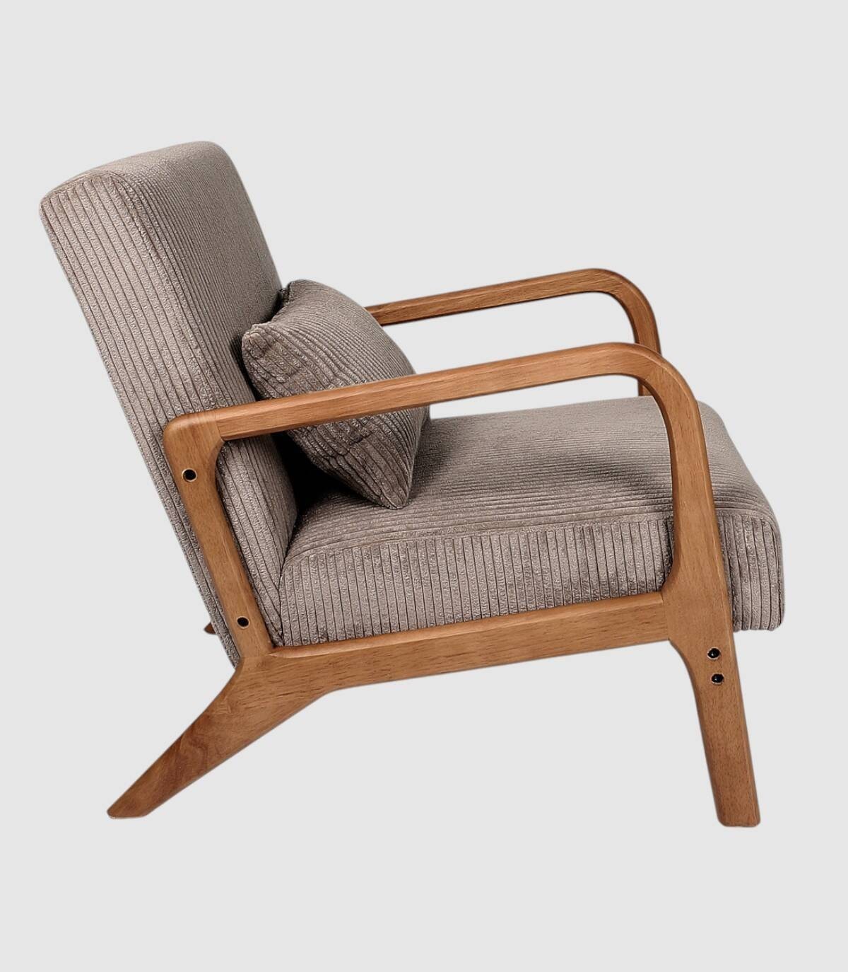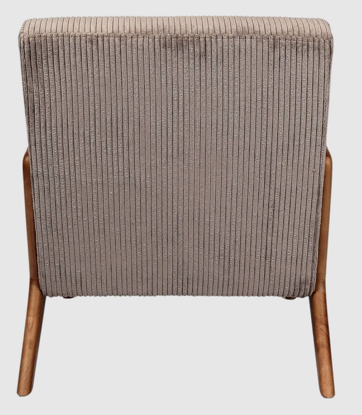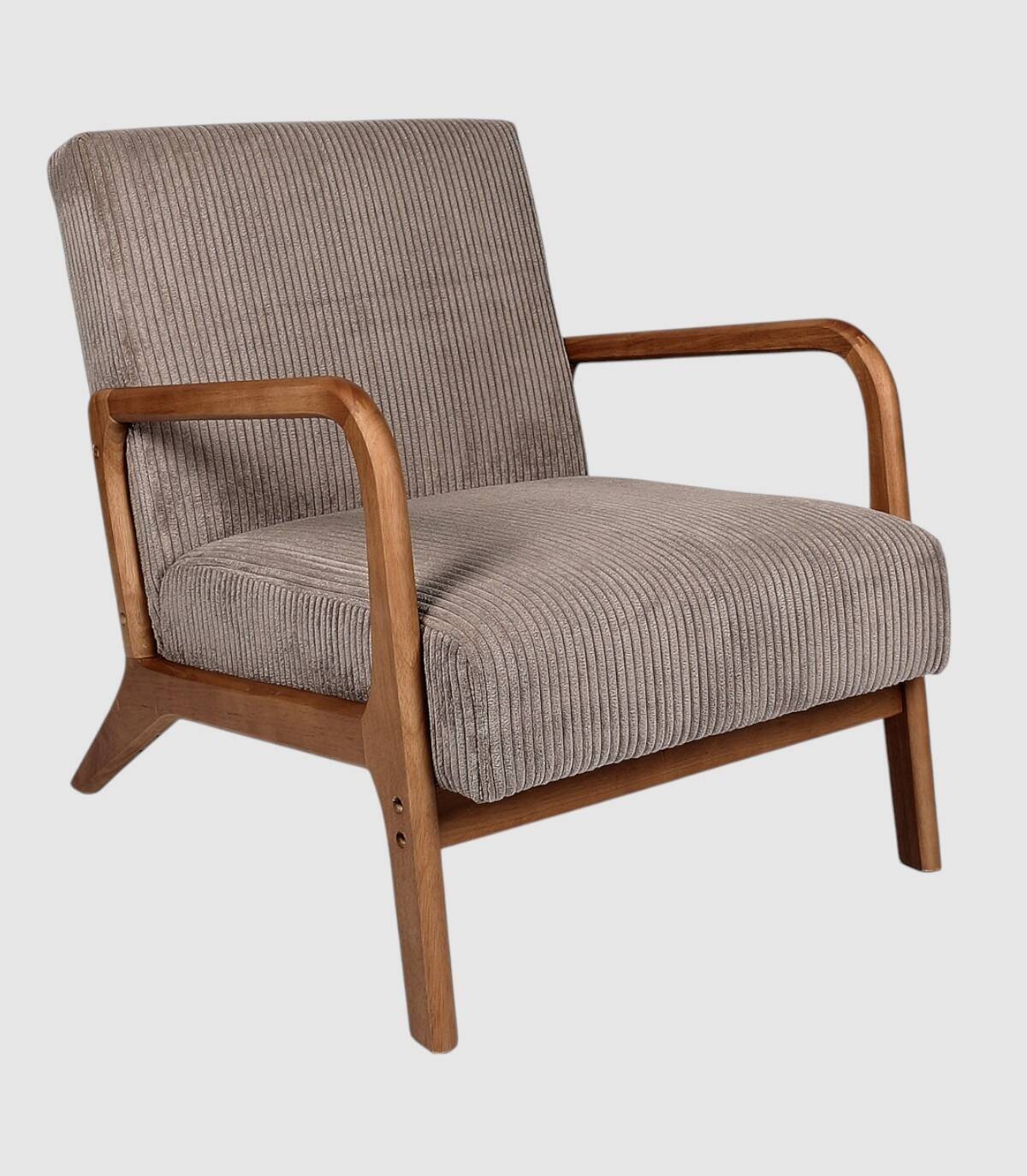 La butaca Scott se compone de asiento y respaldo tapizado estilo acanalado de color marrón en poliéster relleno de poliuretano con estructura, reposabrazos y cuatro patas de madera de arbol de la goma y contrachapado.