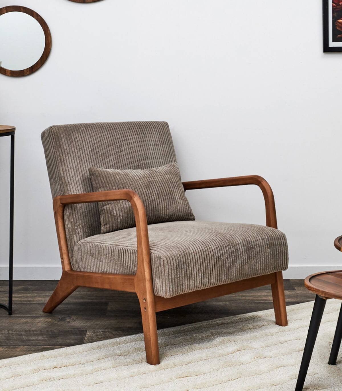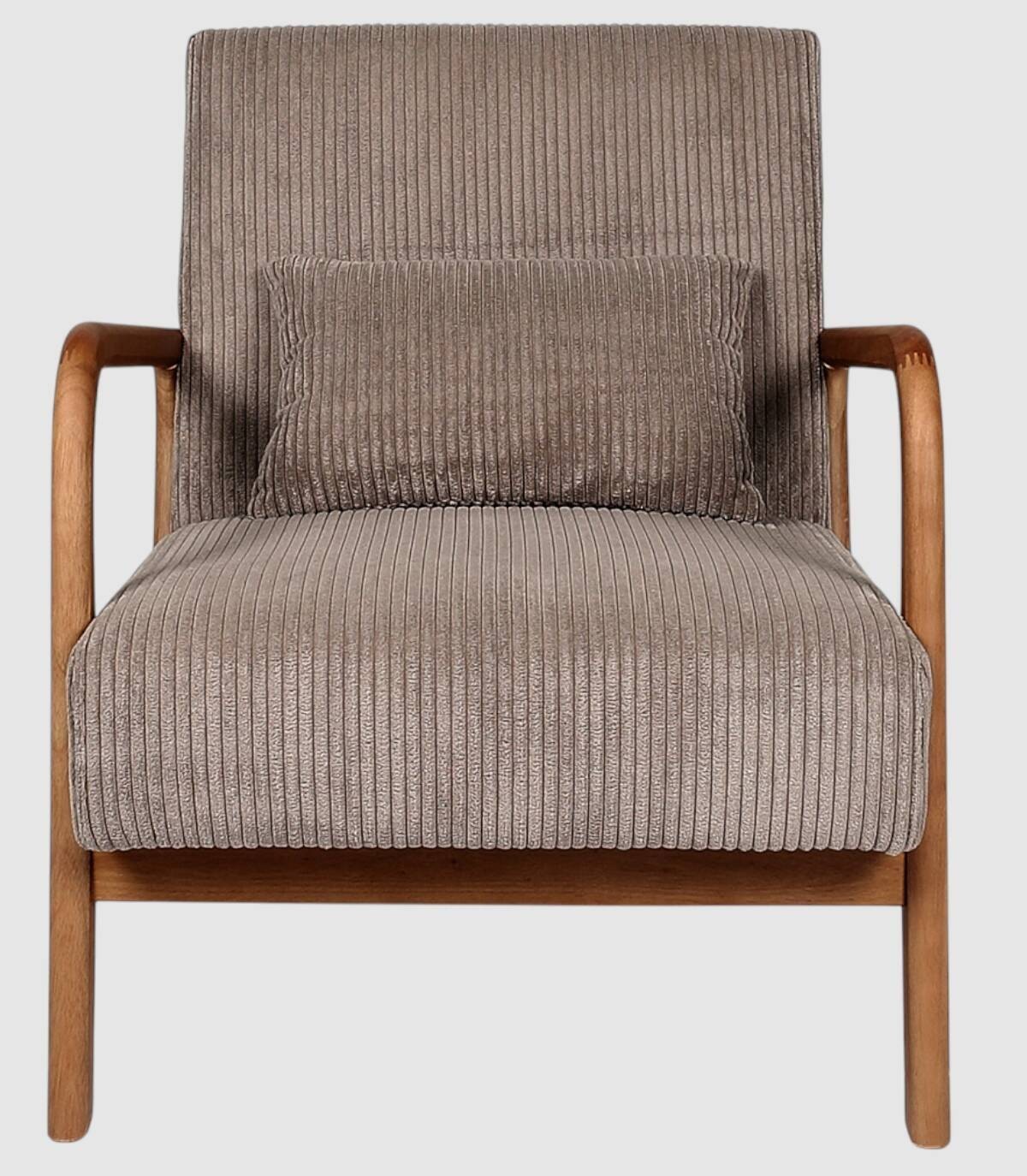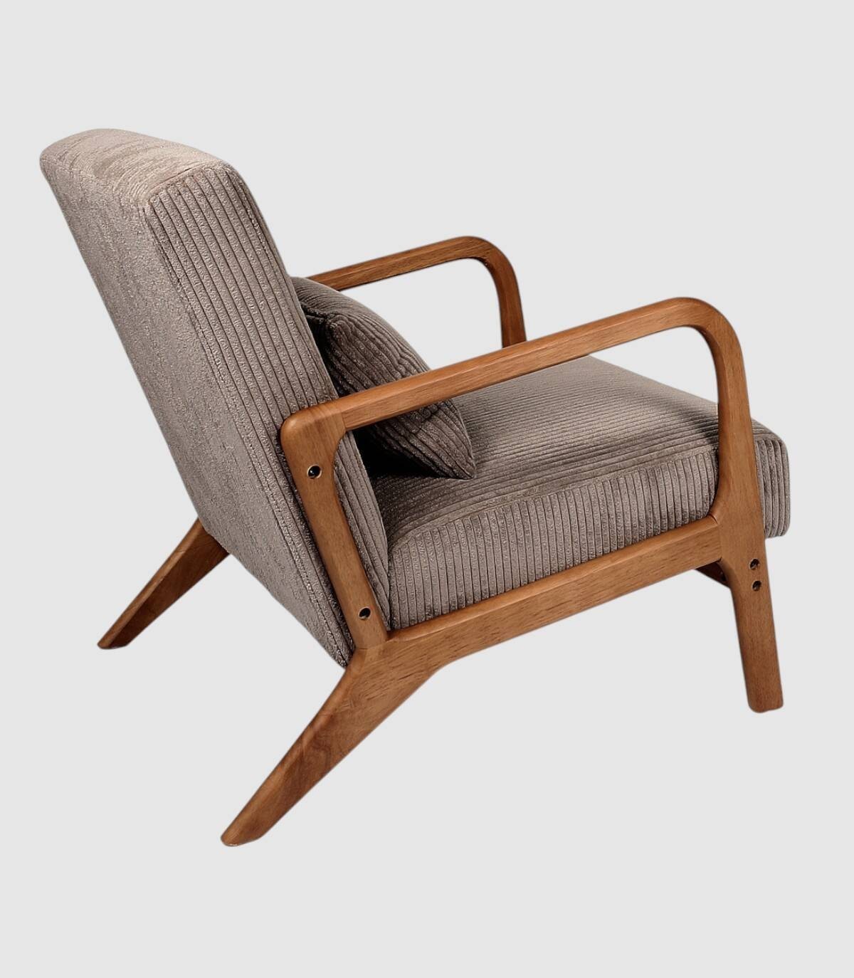 La butaca Scott se compone de asiento y respaldo tapizado estilo acanalado de color marrón en poliéster relleno de poliuretano con estructura, reposabrazos y cuatro patas de madera de arbol de la goma y contrachapado.
