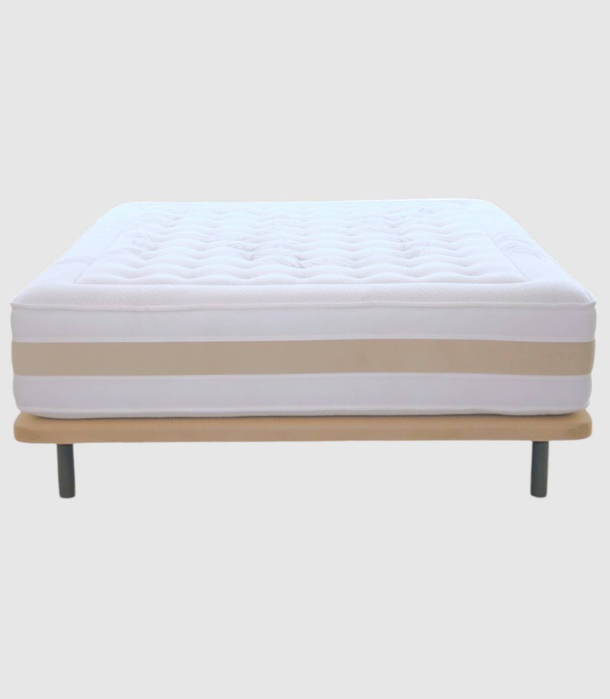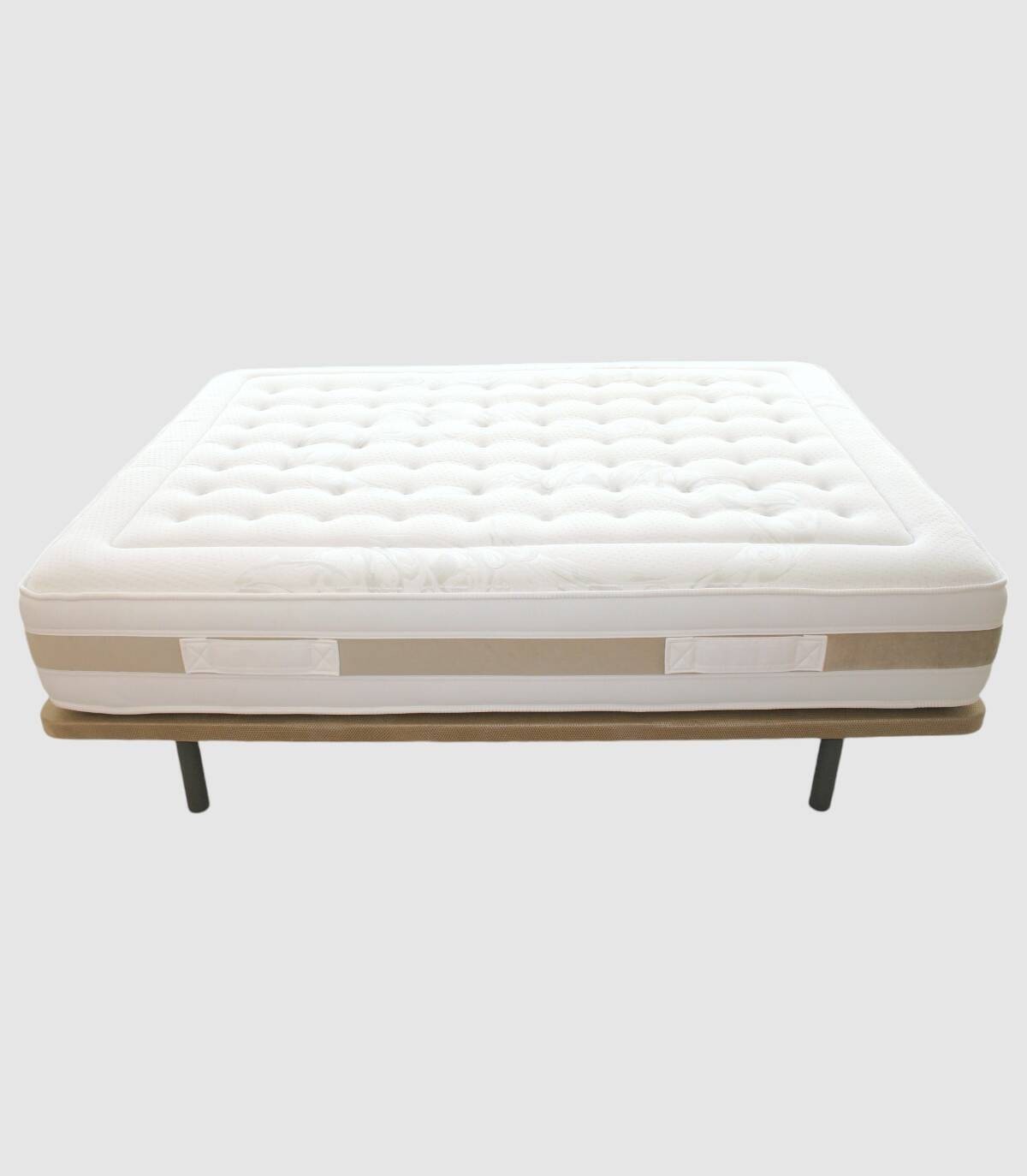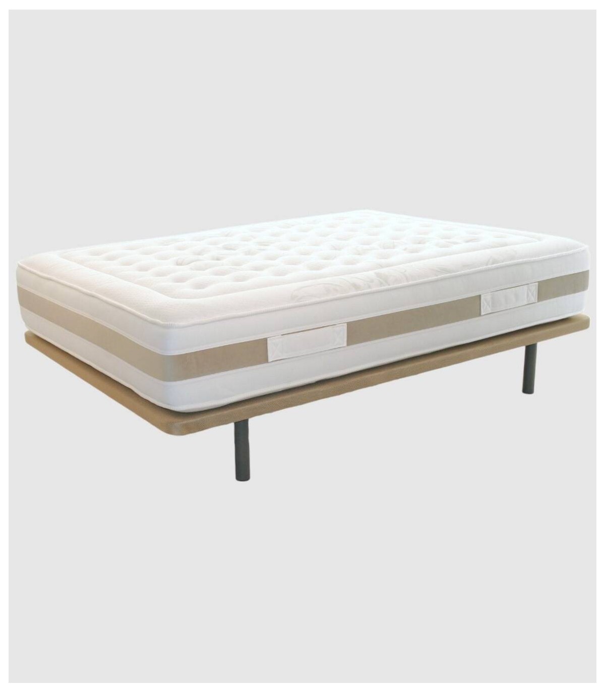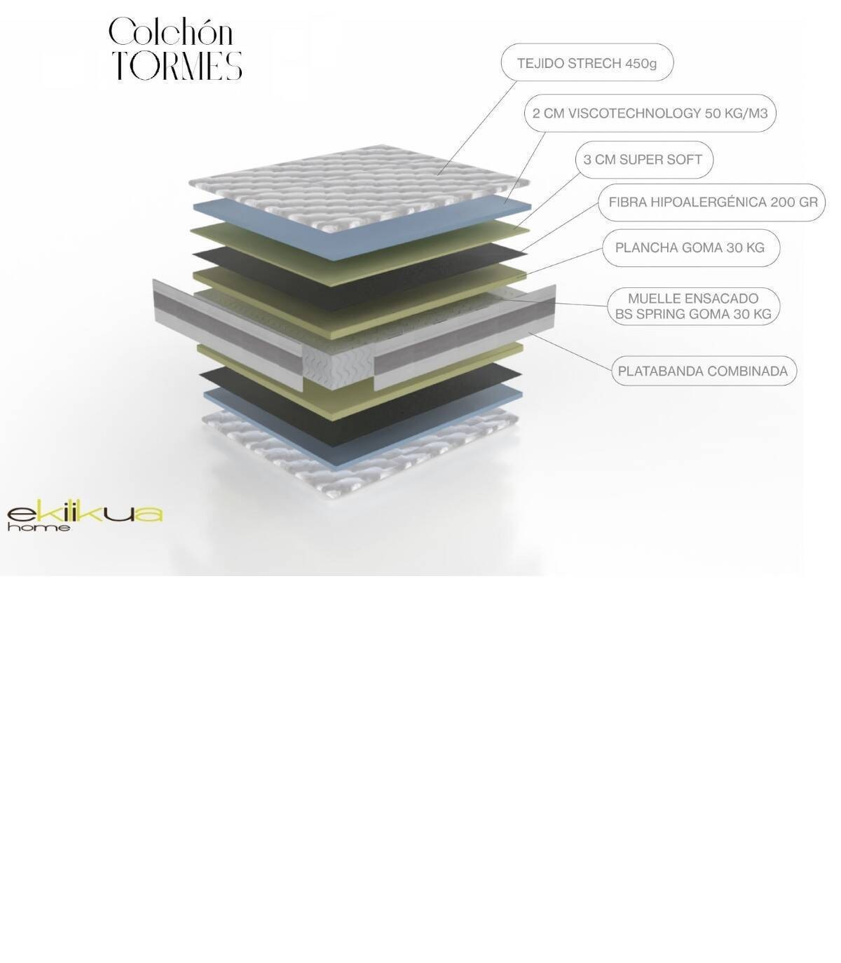 -Muelle ensacado: BS Spring goma 30 kg. extraduro en perímetro.-Platabanda: tejido blanco con 4 asas en franja gris.