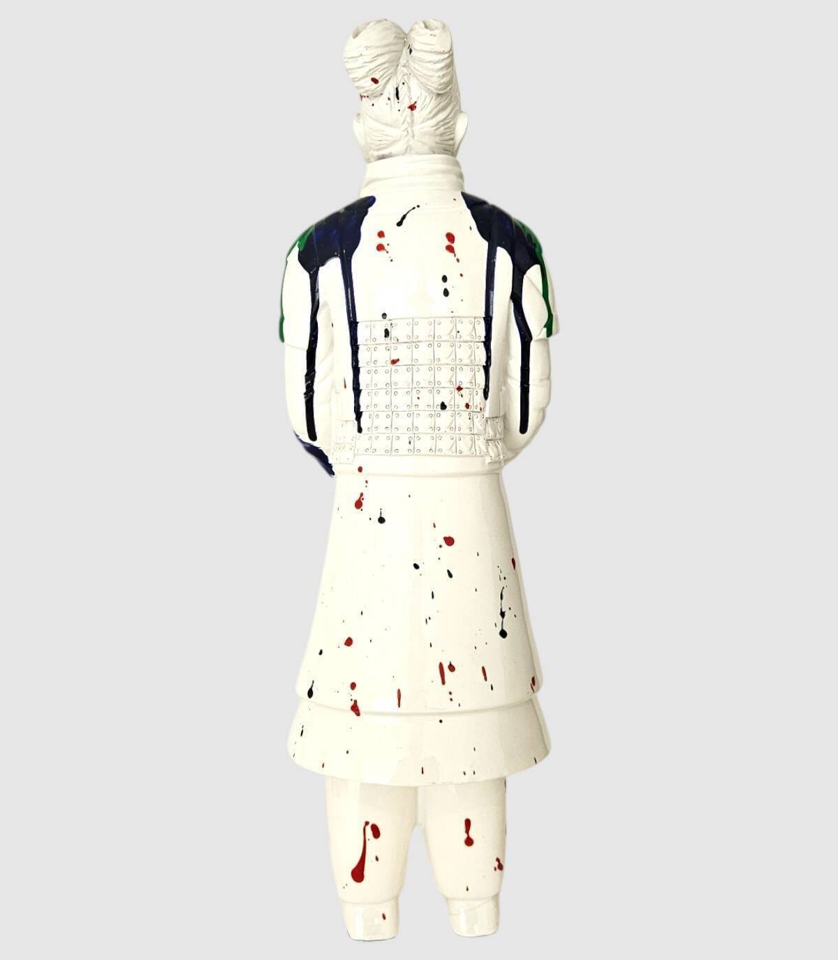 Read moreShow lessDit unieke decoratiestuk toont een terracotta soldaat met een versleten en bevlekt uiterlijk van rode, blauwe en groene verf. De witte keramische figuur vertoont minutieuze details zoals een gebeeldhouwd gezicht, een sjaal om de nek en een schort met een geruit patroon. Dit boeiende artistieke stuk is ideaal voor hedendaagse kunstverzamelaars die provocerende en avant-gardistische werken waarderen. Hij is ongeveer 50 cm hoog en het wordt aanbevolen dat u er voorzichtig mee omgaat vanwege de kwetsbare aard ervan.