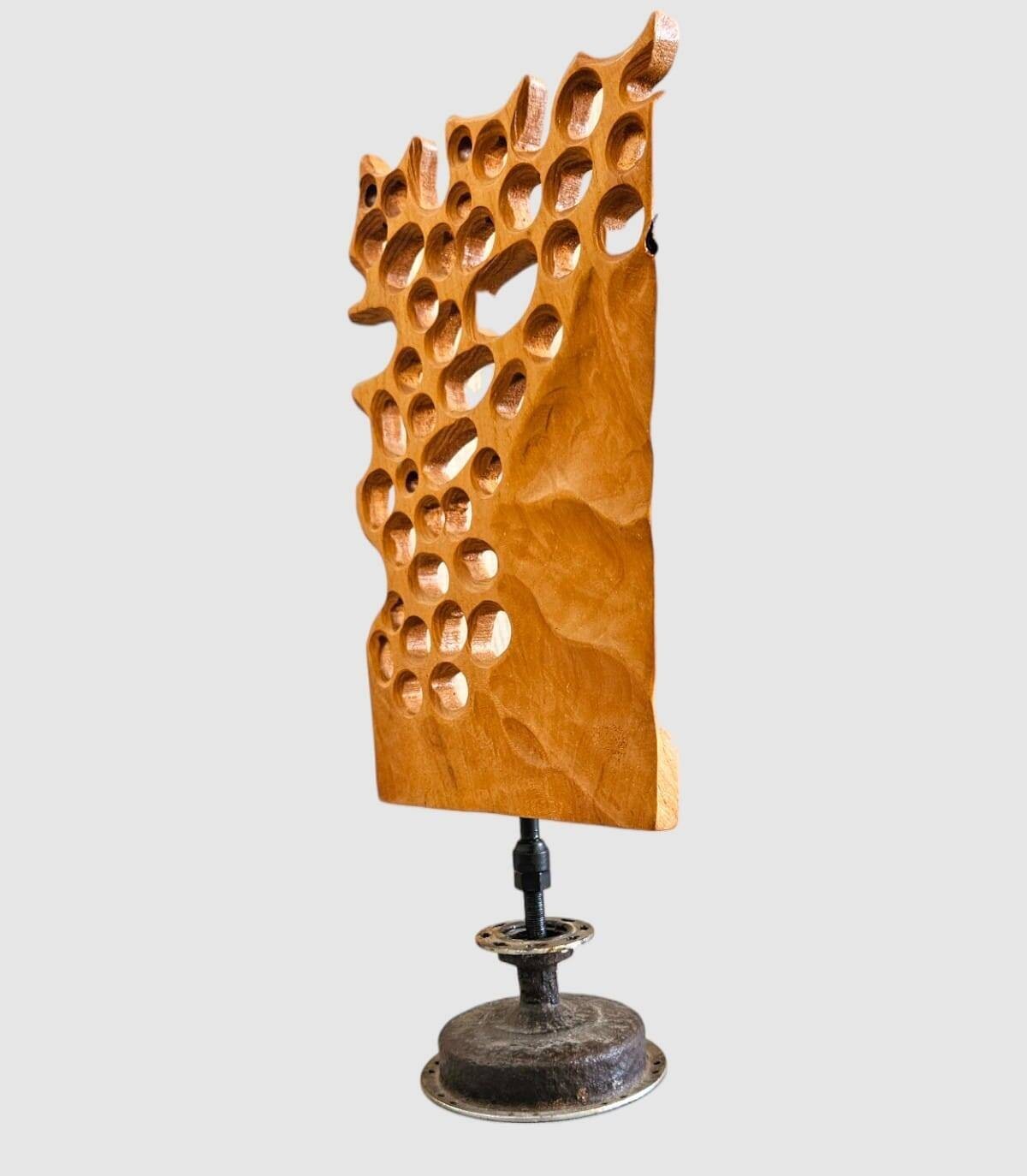 Tafeldecoratie bestaande uit een rechthoekig hout met gaten en een tandwielvormige metalen voet.
