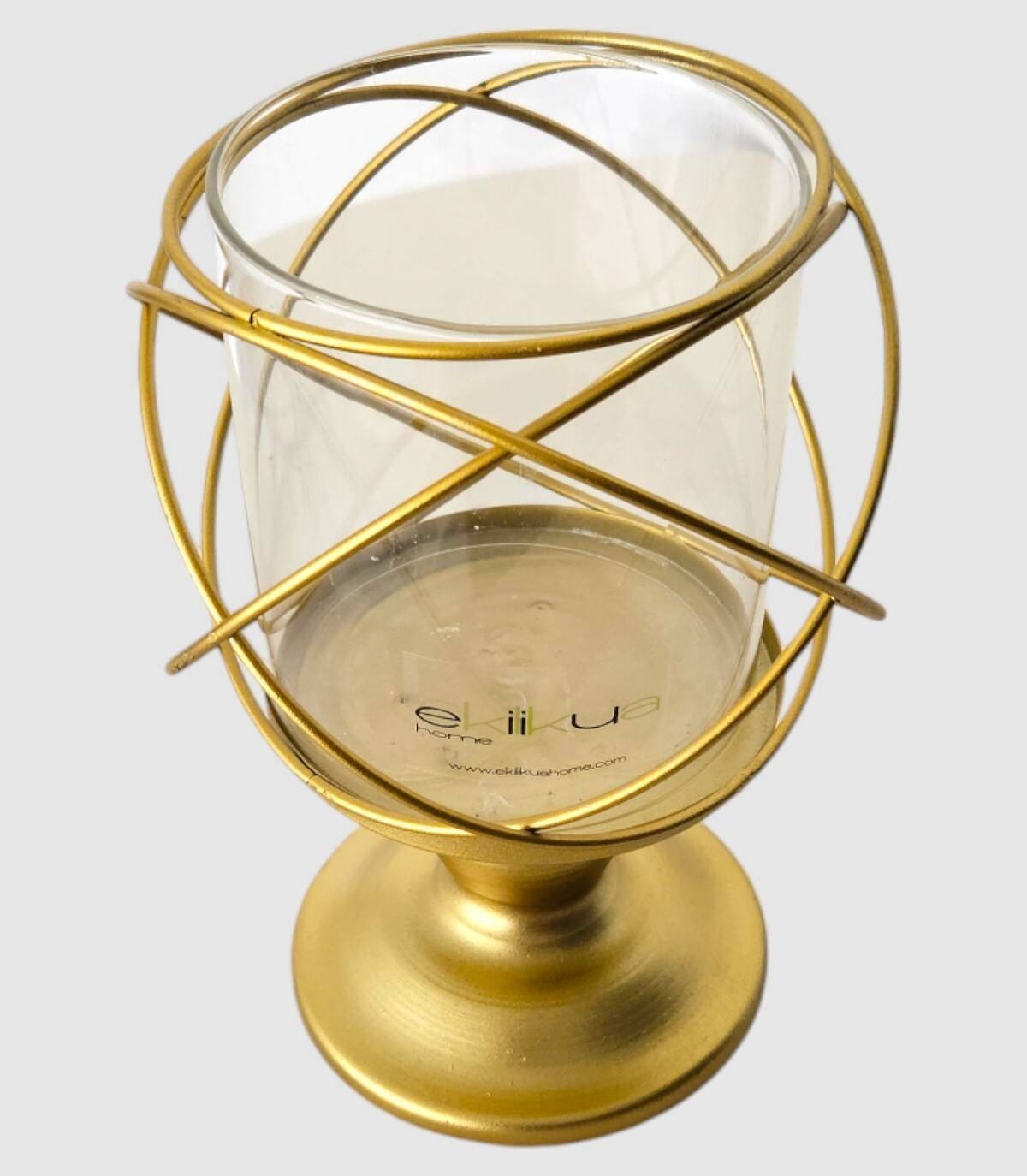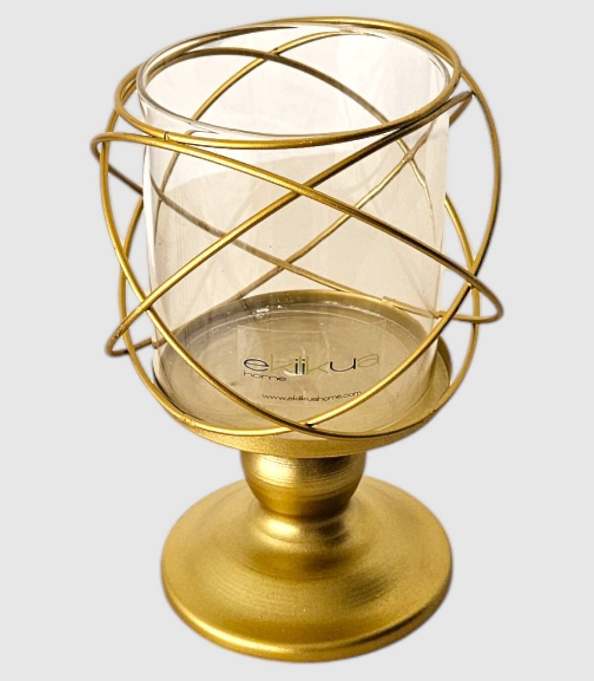 Deze elegante metalen lantaarn met glazen vaas is een prachtig decoratief stuk dat een vleugje verfijning aan elke ruimte zal toevoegen. Het ingewikkelde, met elkaar verweven ontwerp van gouden draden creëert een boeiend visueel effect, terwijl het heldere glazen vat het licht er zachtjes doorheen laat filteren. Geplaatst op de gouden metalen voet, wordt deze lantaarn een centraal element dat de aandacht trekt. Perfect voor het decoreren van salontafels, planken of zelfs als sfeerlamp, dit veelzijdige item combineert op harmonieuze wijze stijl en functionaliteit. De elegante lijnen en glanzende afwerking maken het een tijdloze toevoeging aan elk interieur.