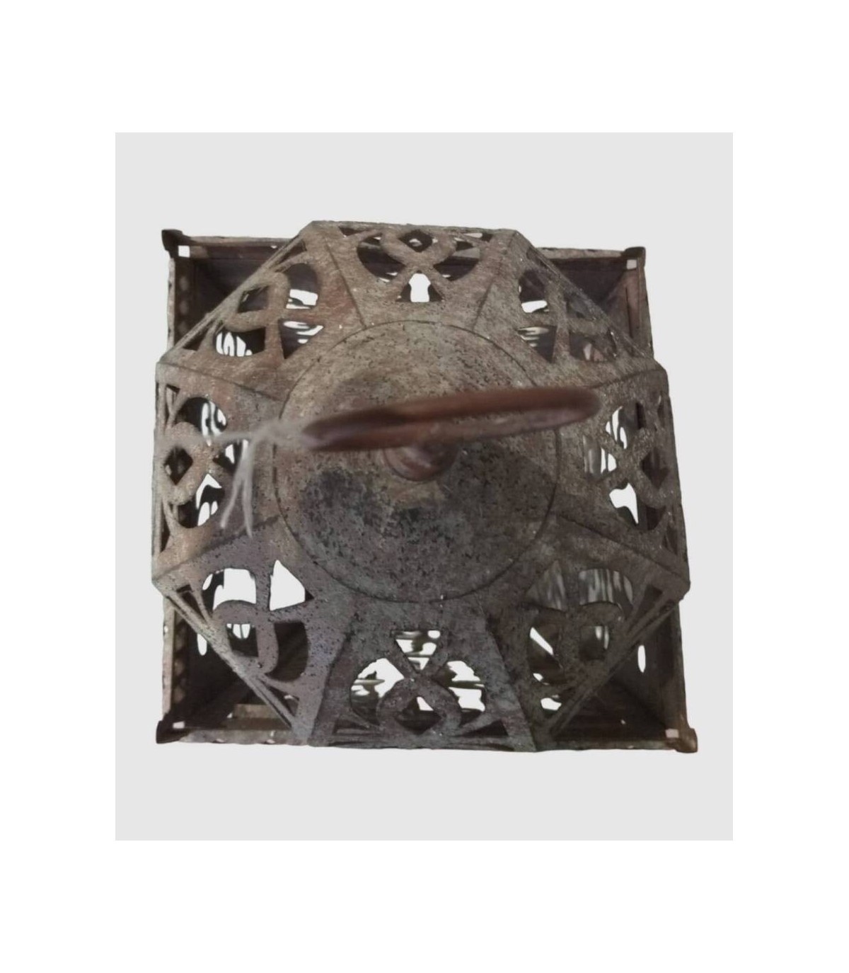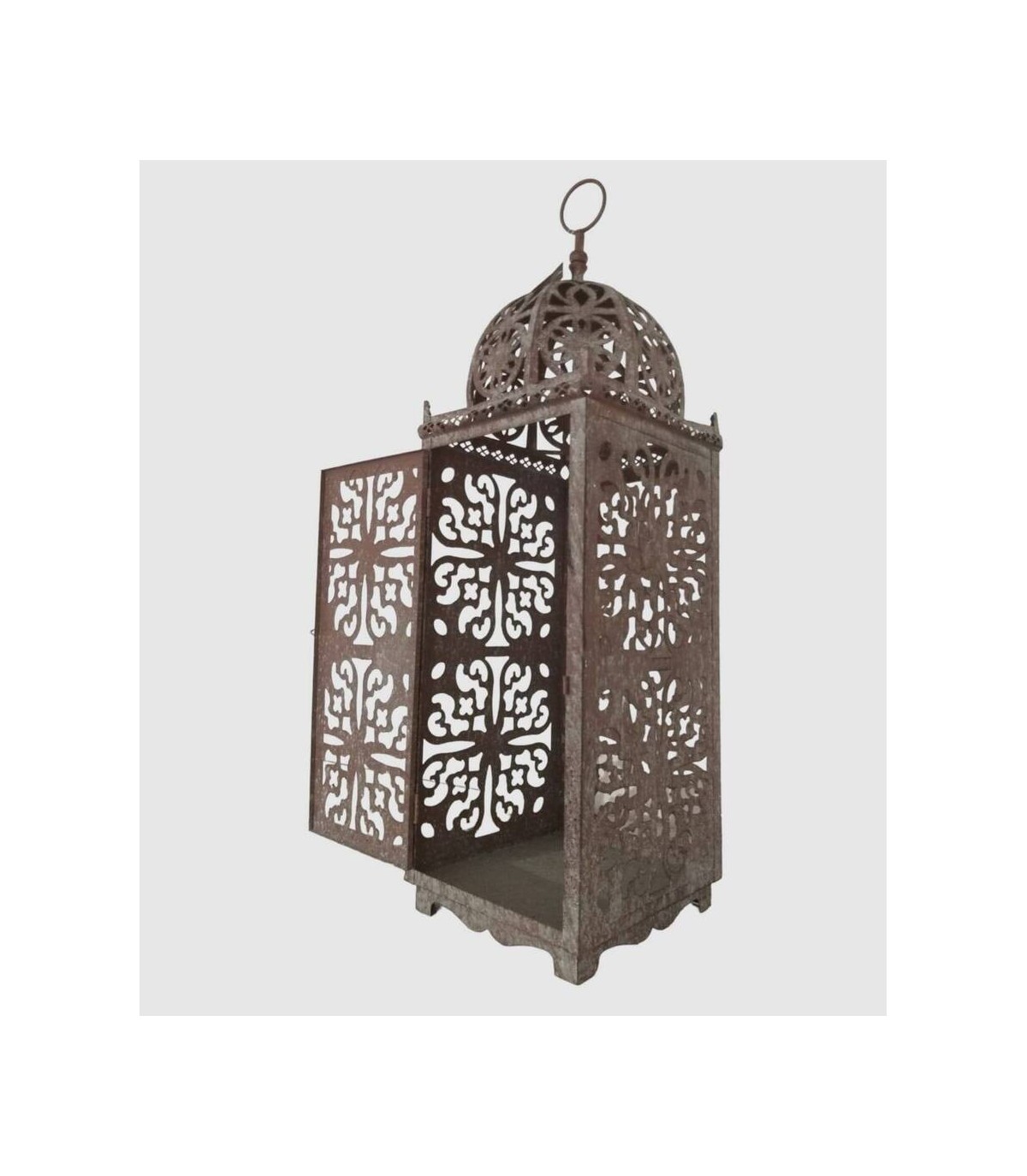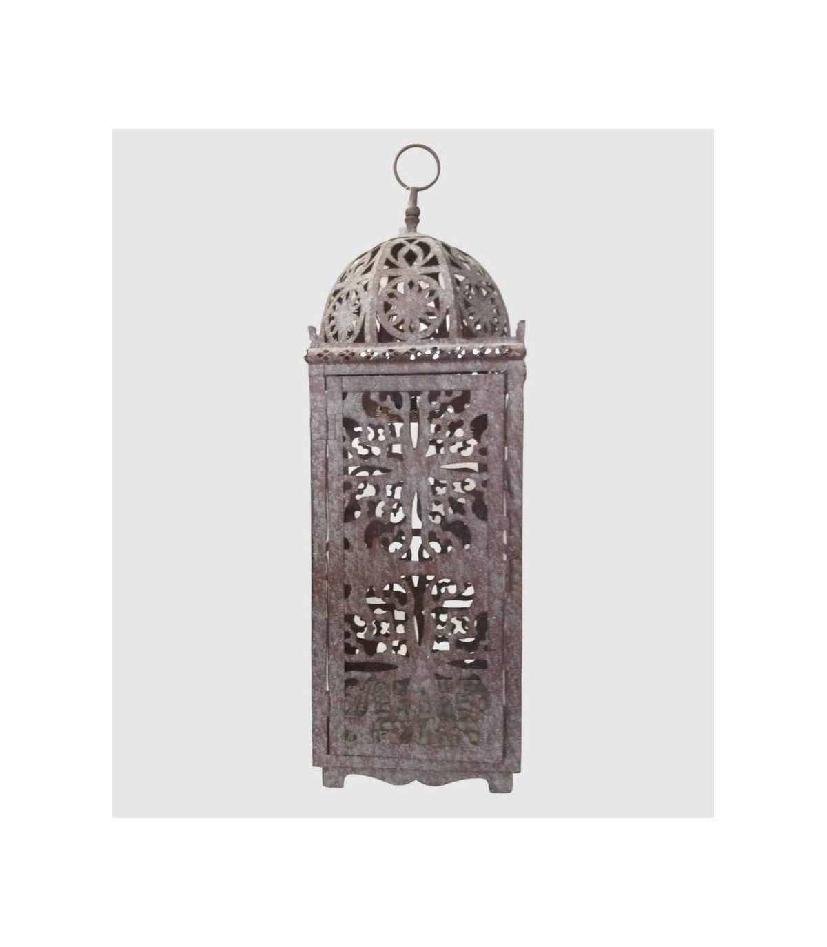 Rechthoekige metalen lantaarn met deur gegraveerd met tekeningen. Het heeft afmetingen van 65x22x22 centimeter.