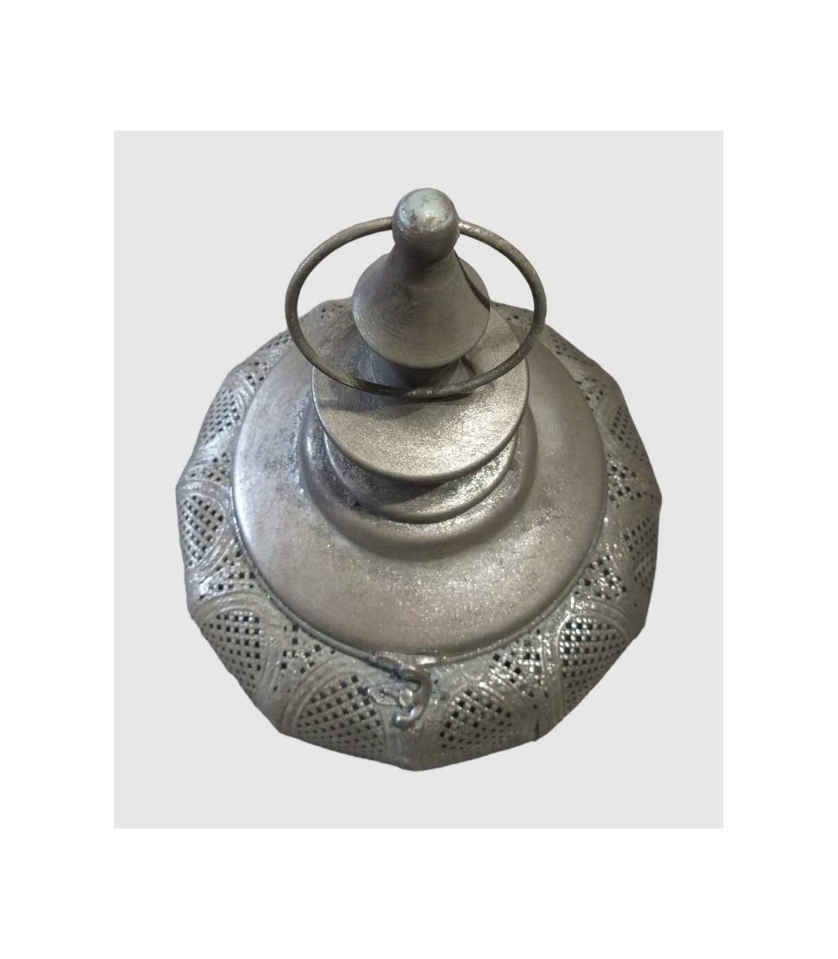 Metalen lantaarn in de vorm van een cilinder gesneden met tekeningen, het opent aan de bovenkant en bevat een glazen vaas. Het heeft afmetingen van 64x25x25 centimeter.