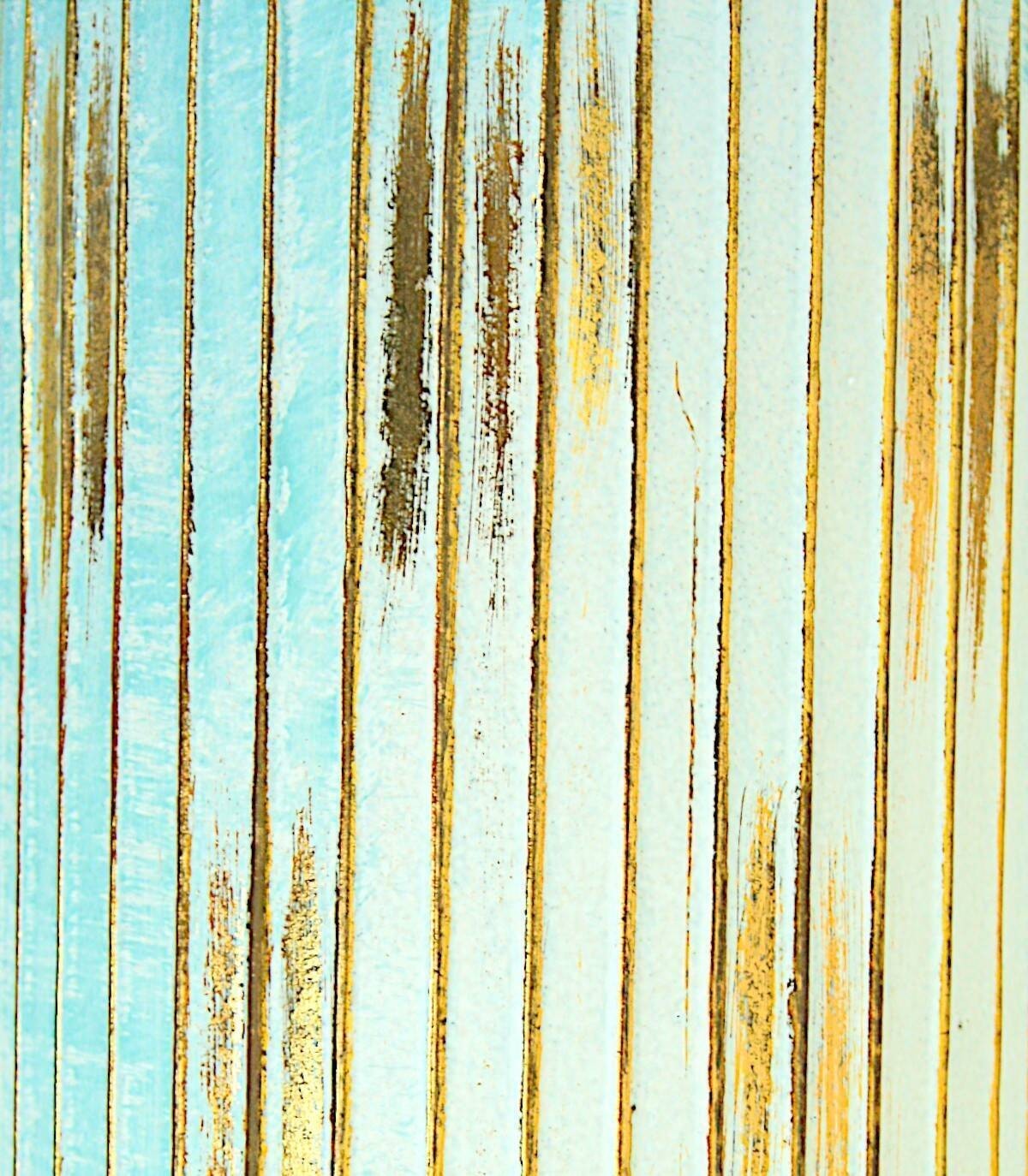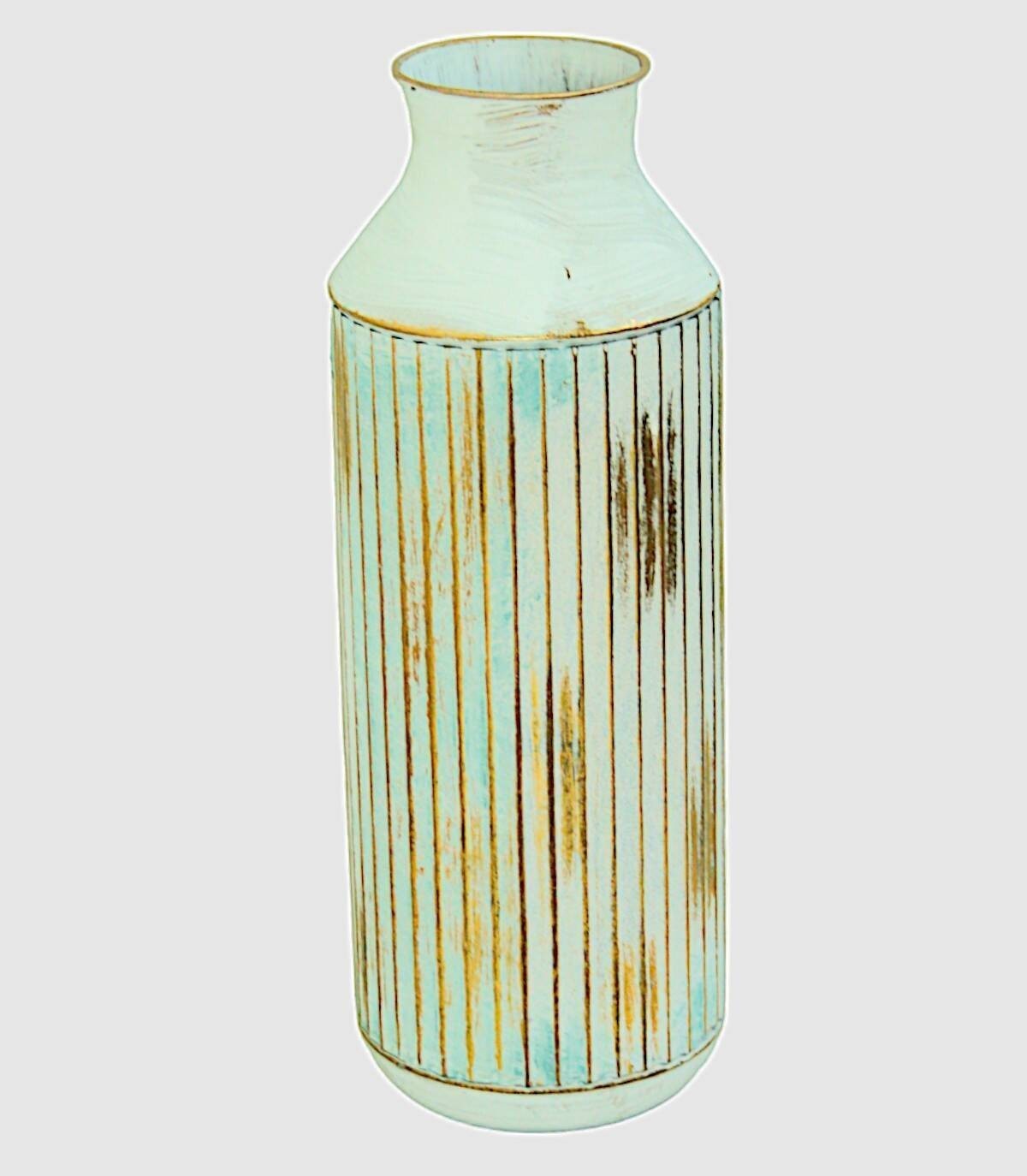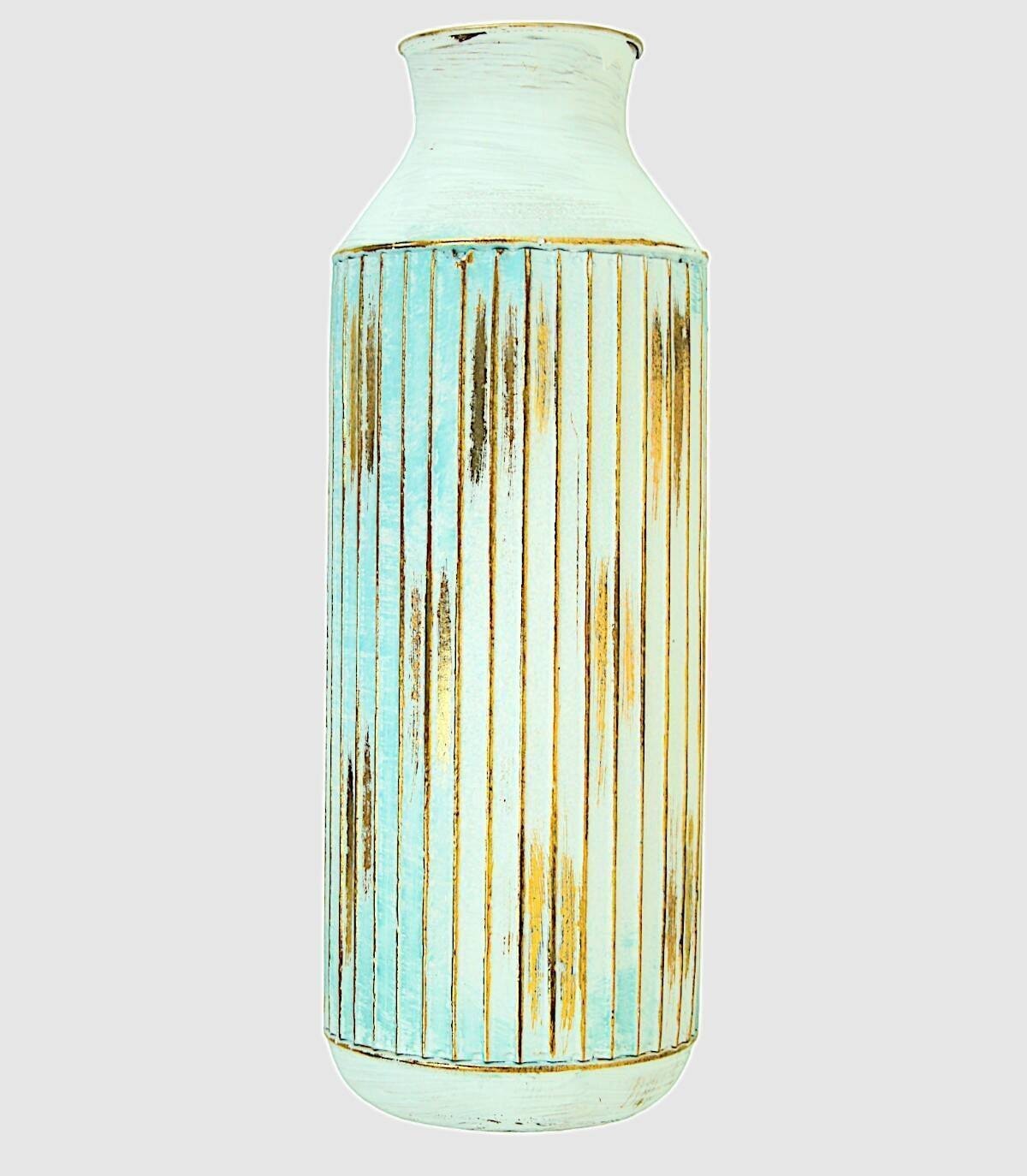 De vaas is gemaakt van metaal Wit, goud en blauw geschilderd met verticale lijnen in reliëf.