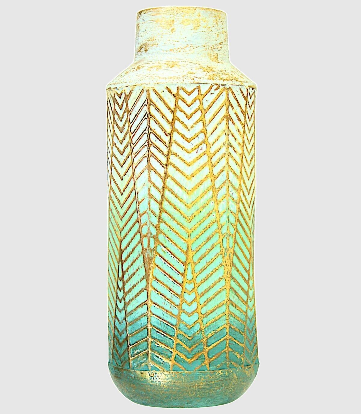 De vaas is gemaakt van metaal Wit en groen geschilderd met gouden lijnen in reliëf.