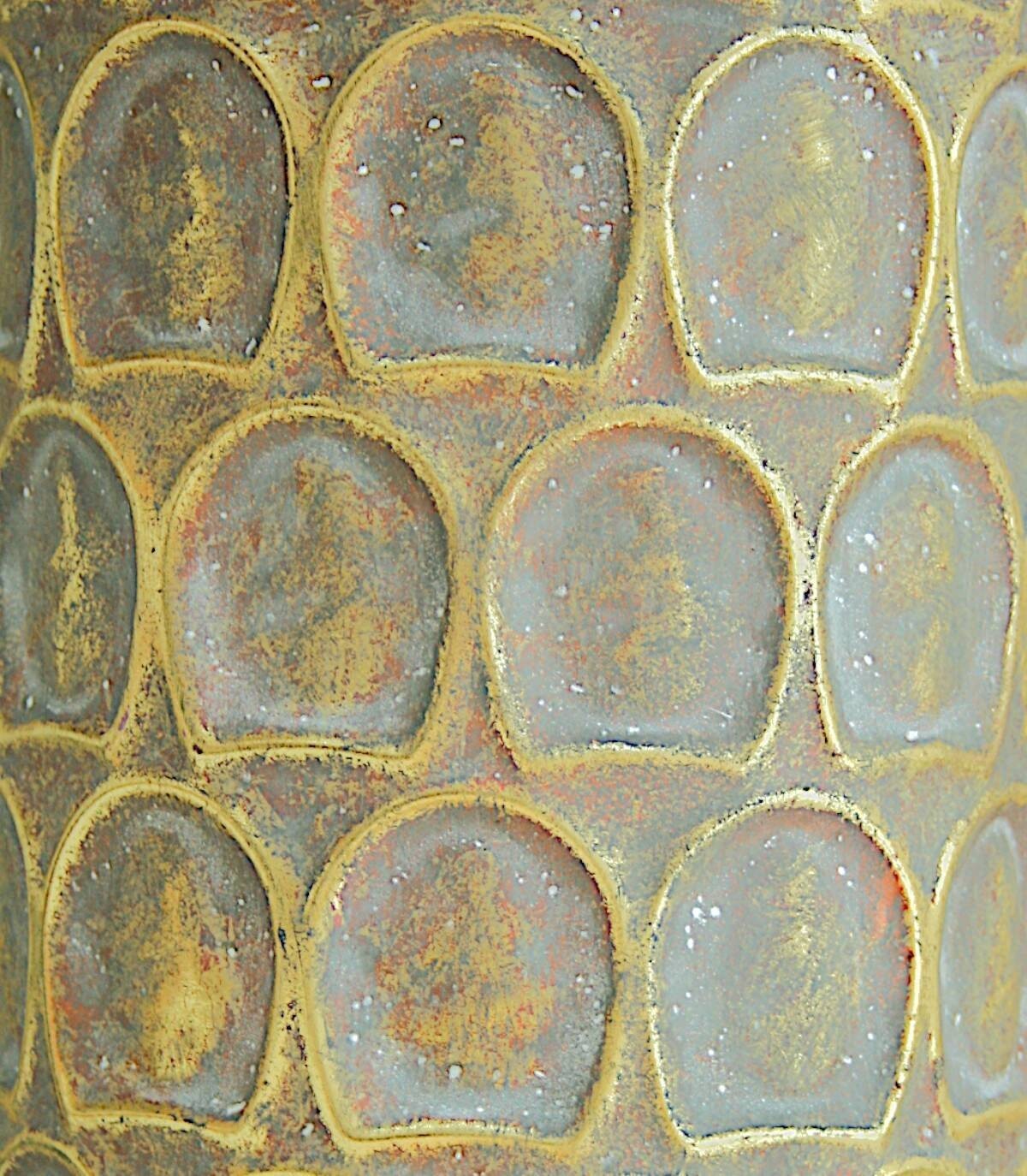 Read moreShow lessVerouderd goud van kleur met tekeningen van ronde vormen in reliëf.