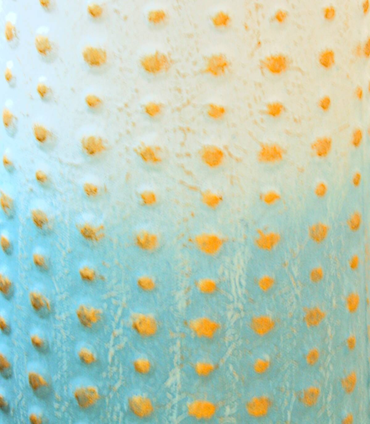 De vaas is gemaakt van metaal Blauw en wit geschilderd met verhoogde gouden stippen.