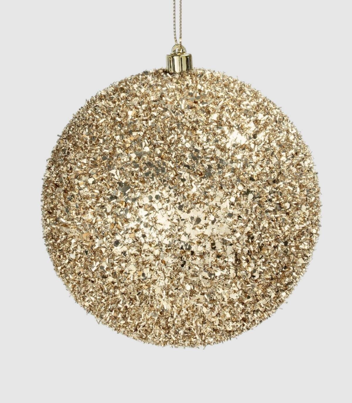 Bola fabricada en plástico con acabado de efecto purpurina de 20 centímetros de diámetro con hilo dorado para colgar.