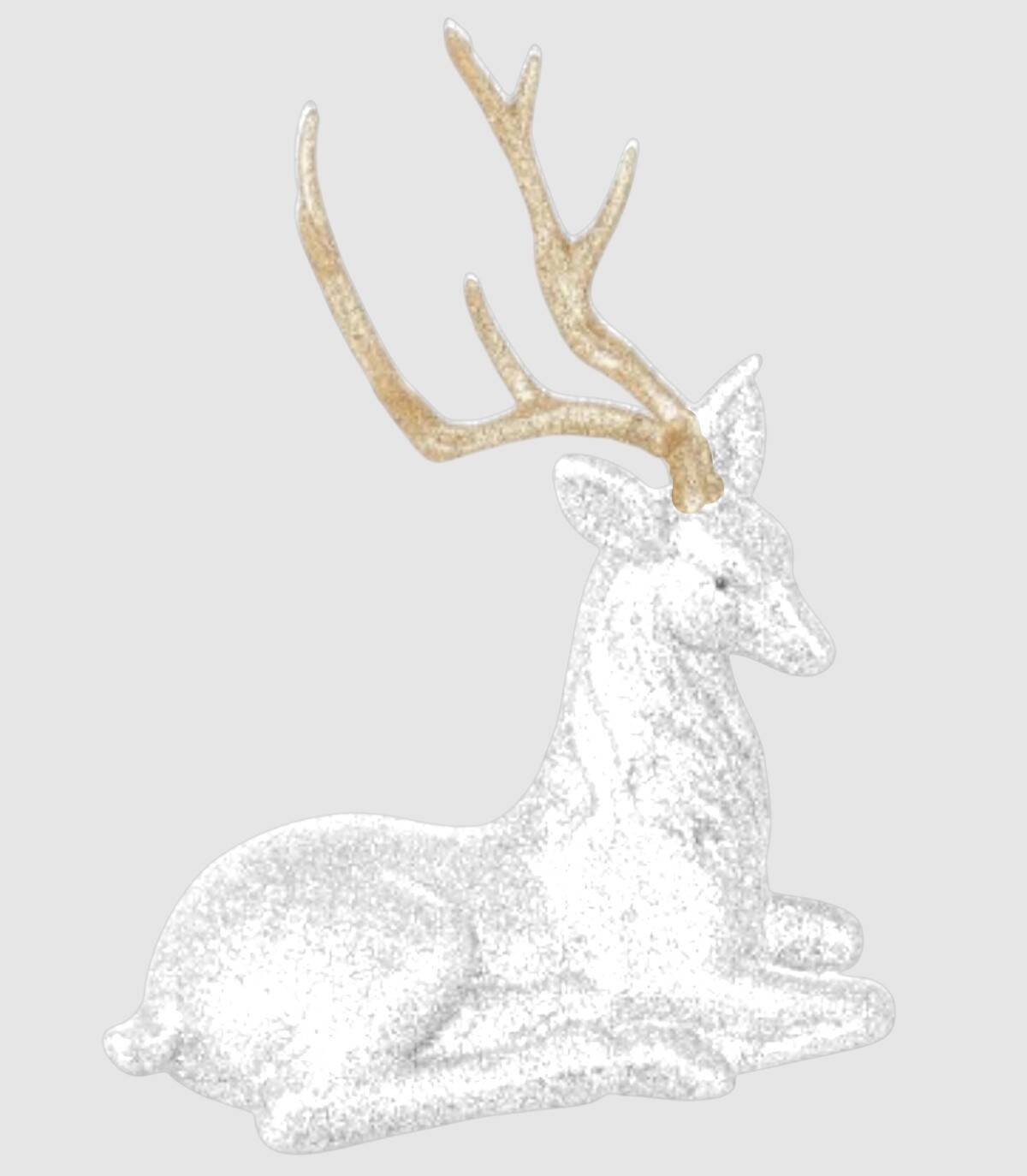 Figura con forma de reno sentado de color blanco y dorado con efecto purpurina de 23 centímetros de alto por 20 centímetros de largo.