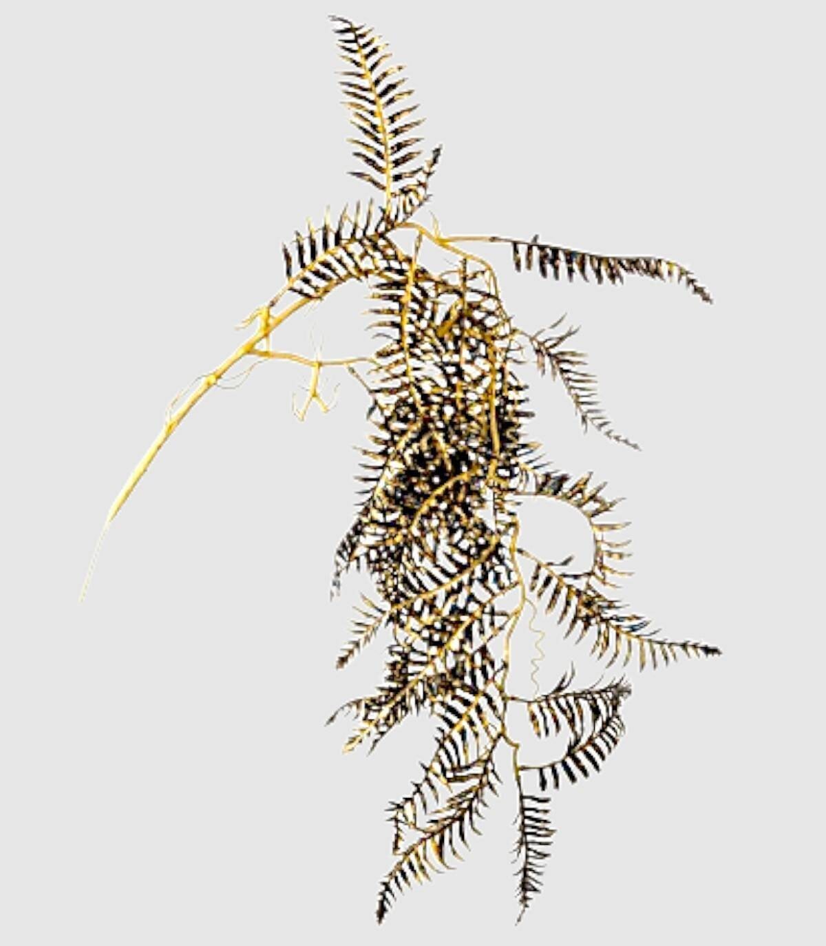 Rama de varias hojas de color negro y dorado.