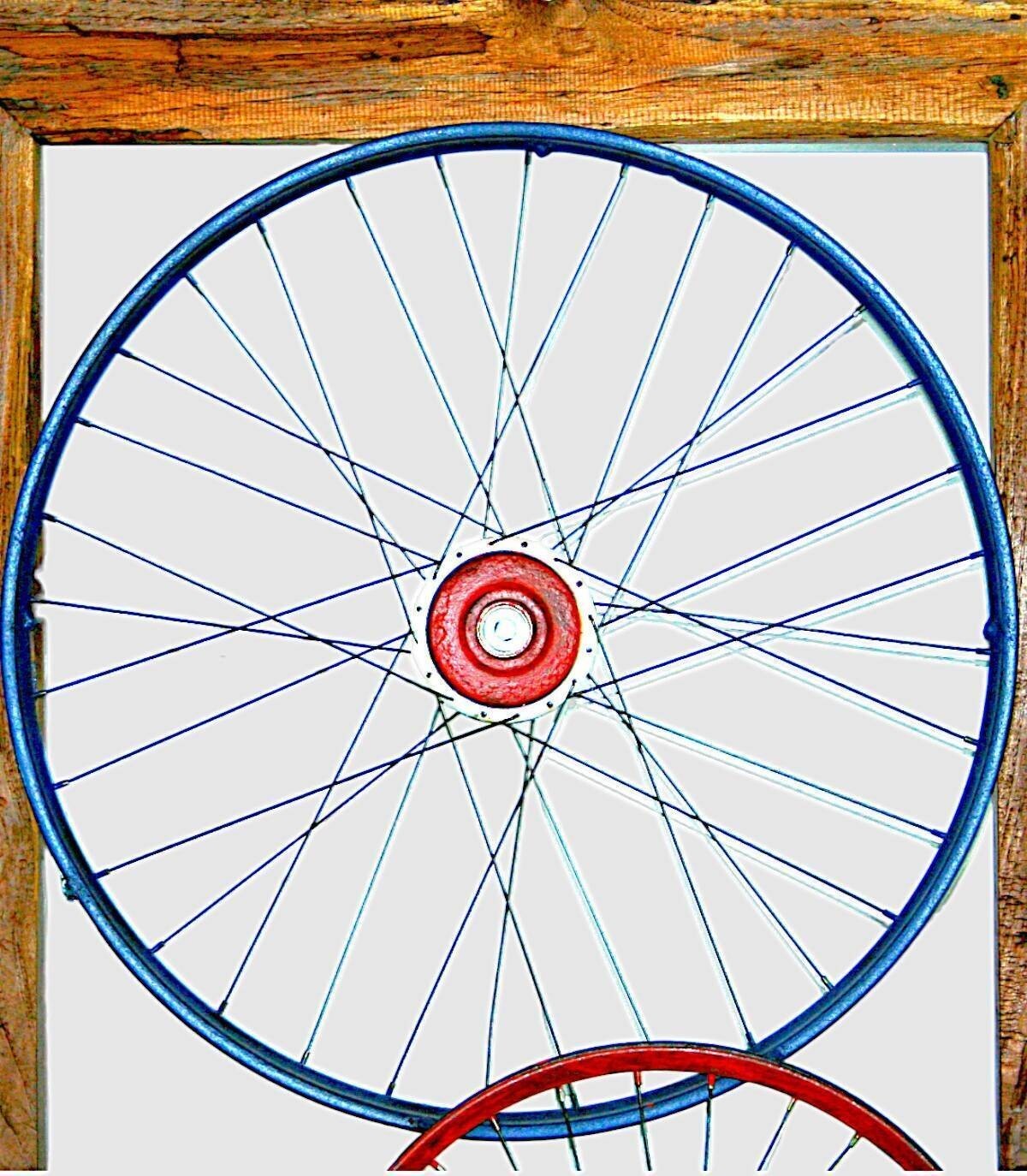 Houten frame met standaard om op te staan met wielen en decoratieve fietsonderdelen