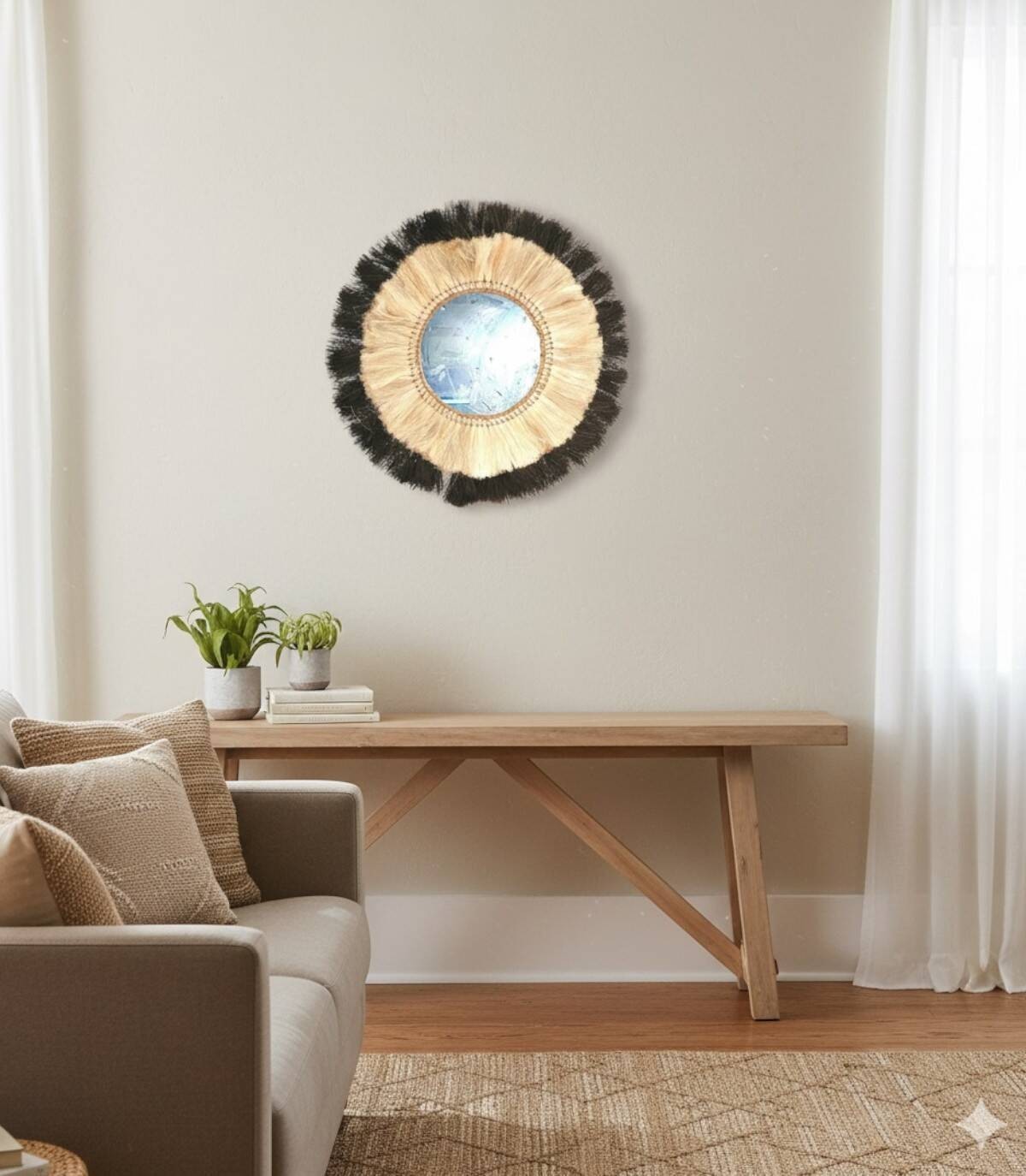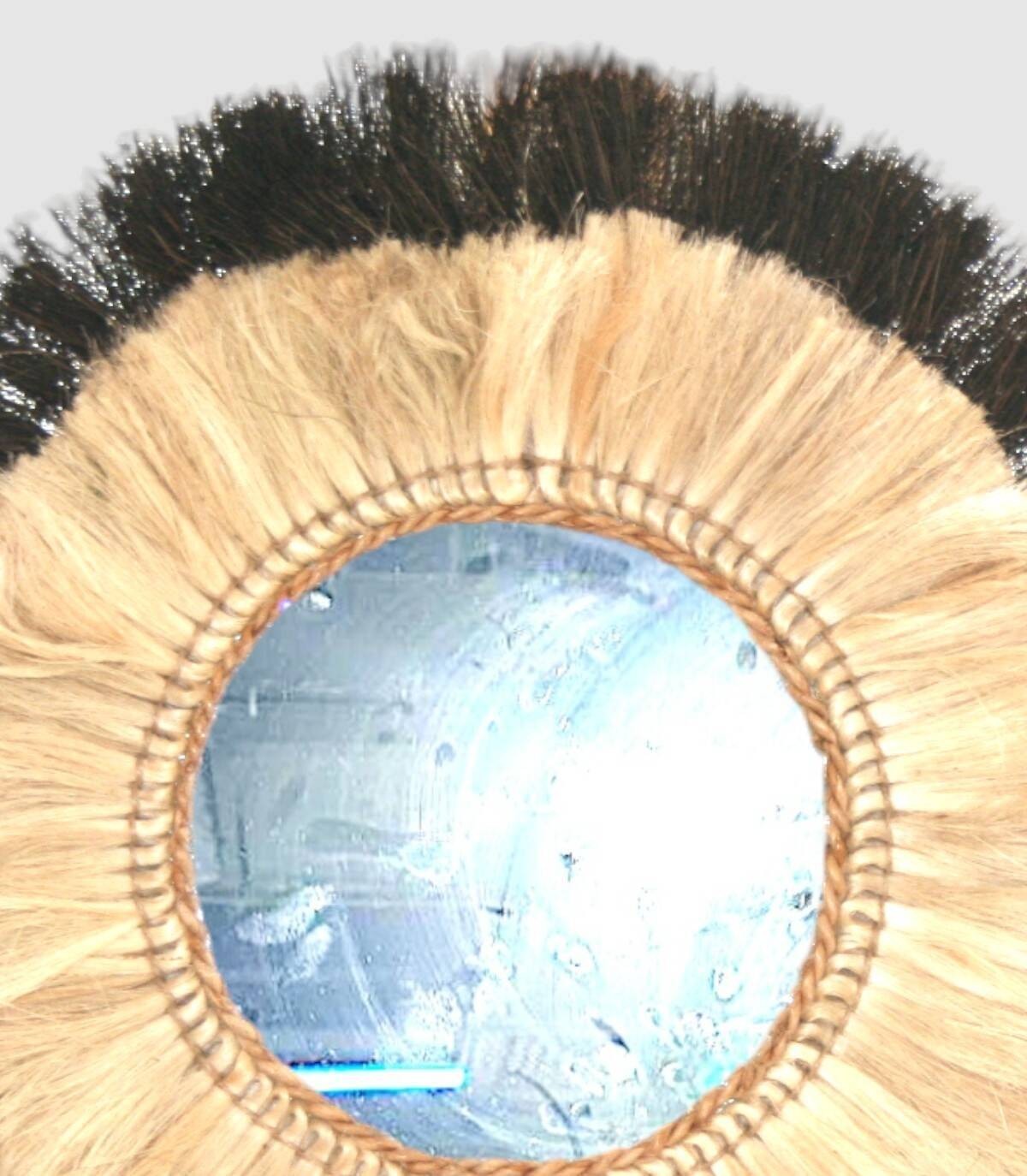 Deze elegante tweekleurige spiegel met natuurlijke franjes is een uniek stuk dat een rustieke en gezellige toets aan elke ruimte zal toevoegen. Het houten frame met handgevlochten pony zorgt voor een warme en aantrekkelijke textuur. De spiegel reflecteert het licht op een zachte en uitnodigende manier, perfect om een gezellige sfeer in je huis te creëren. Met zijn handgemaakte ontwerp is deze spiegel een waar kunstwerk dat schoonheid en functionaliteit combineert, ideaal om aan de muur te hangen in je woonkamer, slaapkamer of hal. Voeg een vleugje boho-chique stijl toe aan je interieur met deze spiegel met natuurlijke franjes.