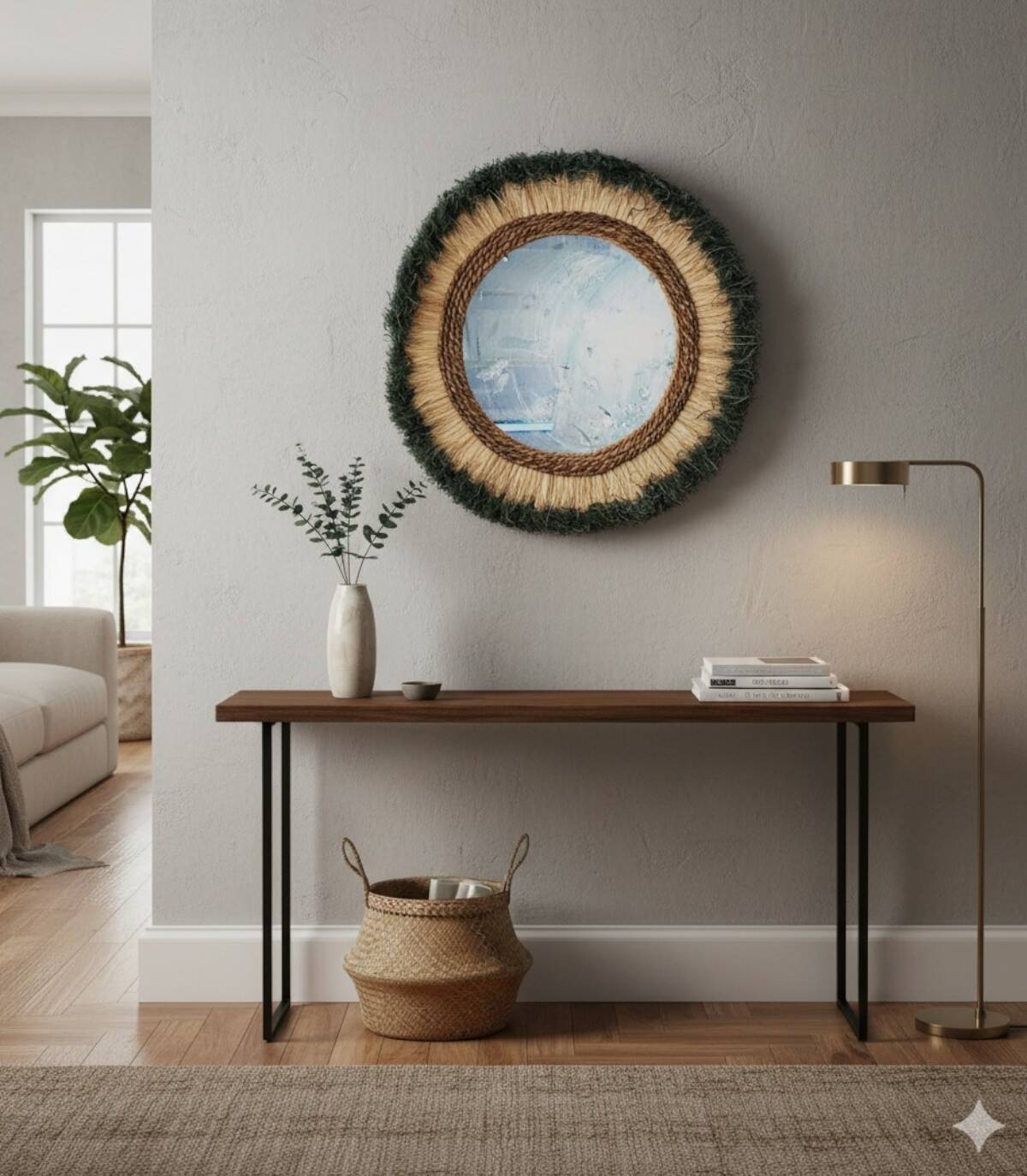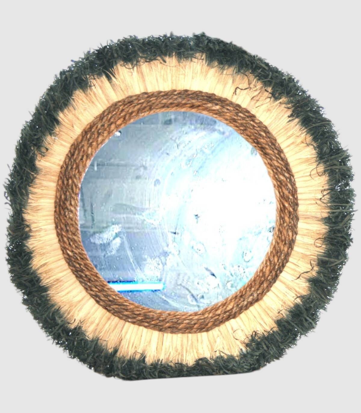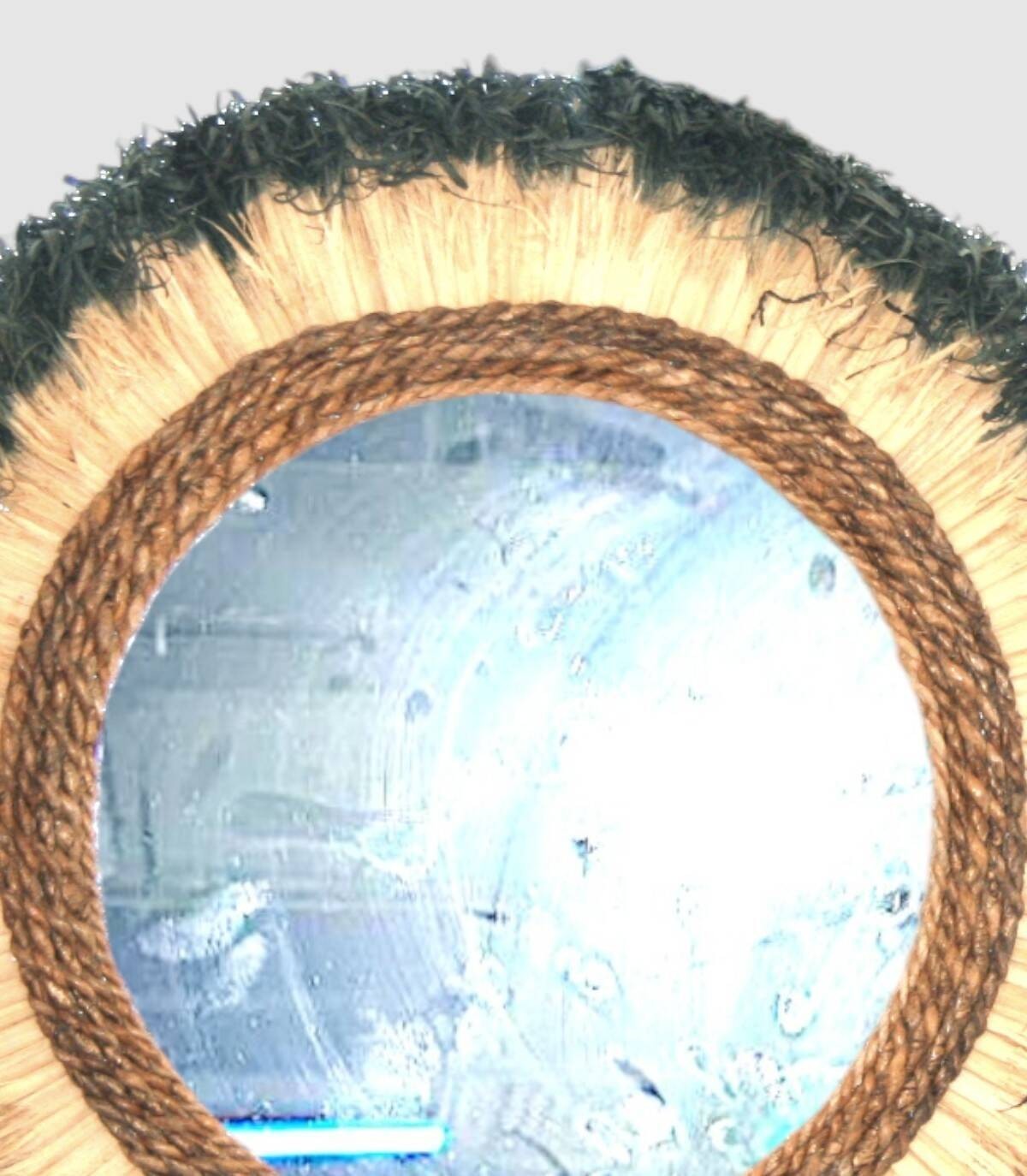 Deze elegante tweekleurige spiegel met natuurlijke franjes is een uniek stuk dat een rustieke en gezellige toets aan elke ruimte zal toevoegen. Het houten frame met handgevlochten pony zorgt voor een warme en aantrekkelijke textuur. De spiegel reflecteert het licht op een zachte en uitnodigende manier, perfect om een gezellige sfeer in je huis te creëren. Met zijn handgemaakte ontwerp is deze spiegel een waar kunstwerk dat schoonheid en functionaliteit combineert, ideaal om aan de muur te hangen in je woonkamer, slaapkamer of hal. Voeg een vleugje boho-chique stijl toe aan je interieur met deze spiegel met natuurlijke franjes.