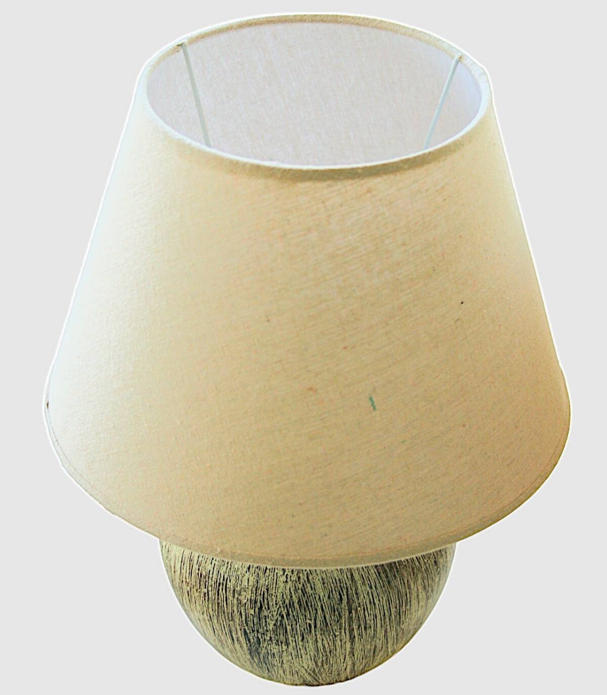 La lámpara de mesa marrón esta compuesta por una base hecha de cerámica marrón y blanco efecto envejecido, pantalla redonda con tela beige y soporte blanco, cable negro con interruptor. No incluye bombilla.