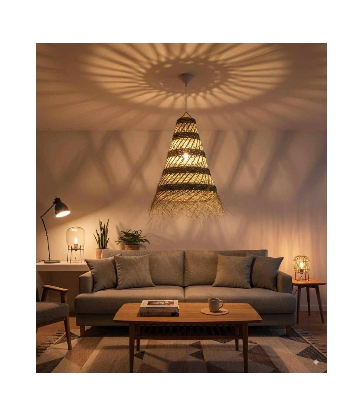 Esta lámpara redonda calada hecha artesanalmente de esparto da un toque étnico en cualquier sitio donde se instale, cambia de color según el uso si se usa en el exterior cambiando a un color mas amarillo. Se ve mucho la luz ya que no está cubierta totalmente de esparto y deja pasar la luz.